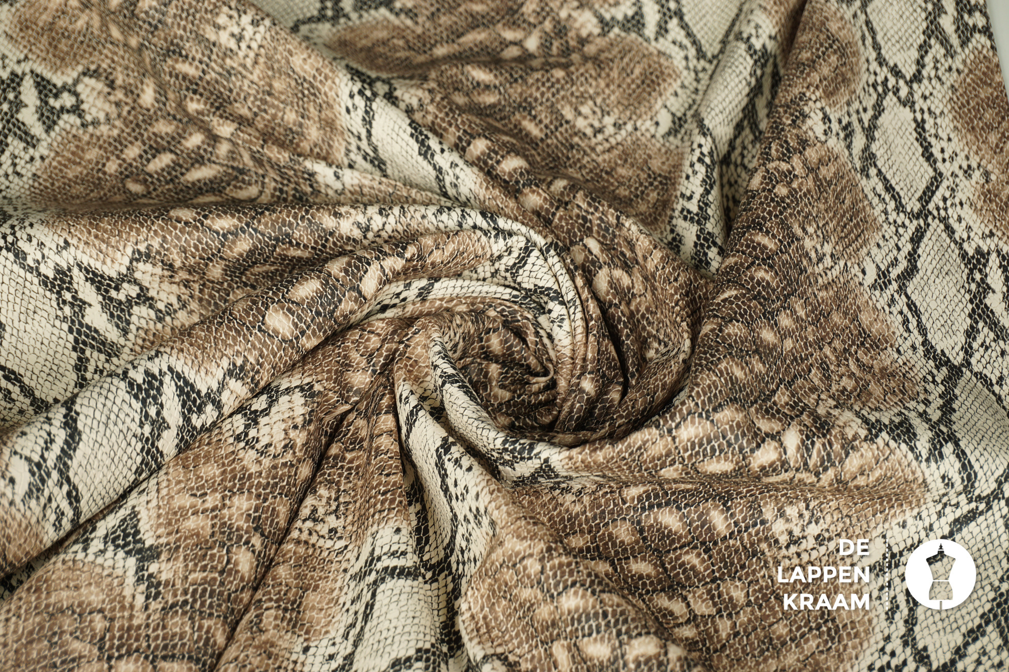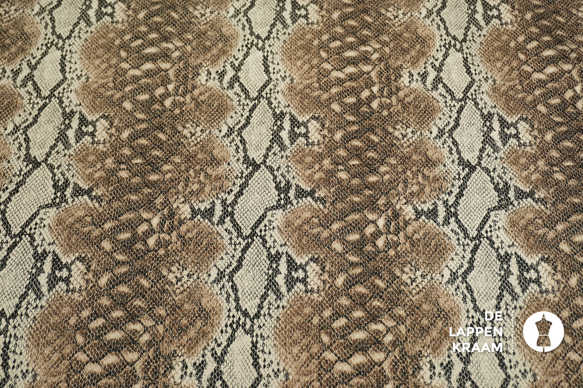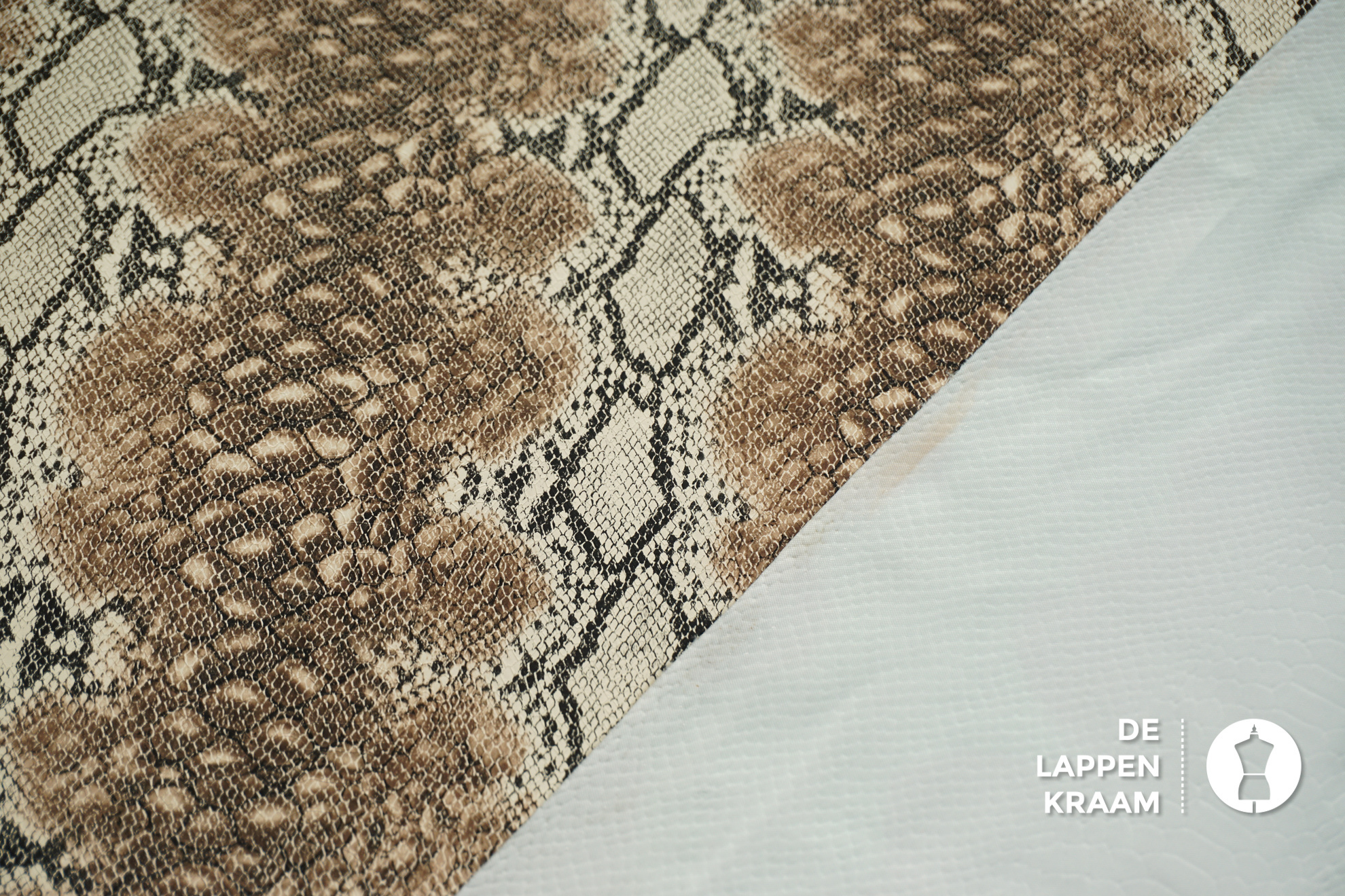 Zin in iets geks voor bijvoorbeeld een tas, een kaft of misschien zelfs een stoer jasje? Overweeg dan deze toffe slangenprint! De achterkant is gemaakt van zachte witte polyester. Puur plastic maar wel heel leuk!... Lees meer