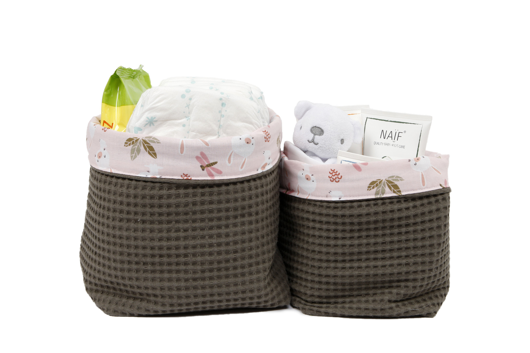 Naaipatroon opbergmandjes, inclusief duidelijke werkbeschrijving. Deze mandjes staan leuk bij de commode gevuld met babyspulletjes. Het mandje is van wafelstof gemaakt voor de buitenkant en een katoenen voeringstof. Het mandje is in 2 maten te maken.