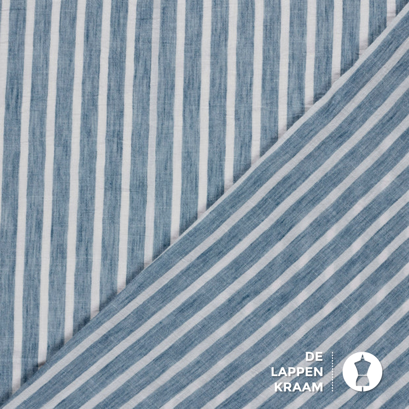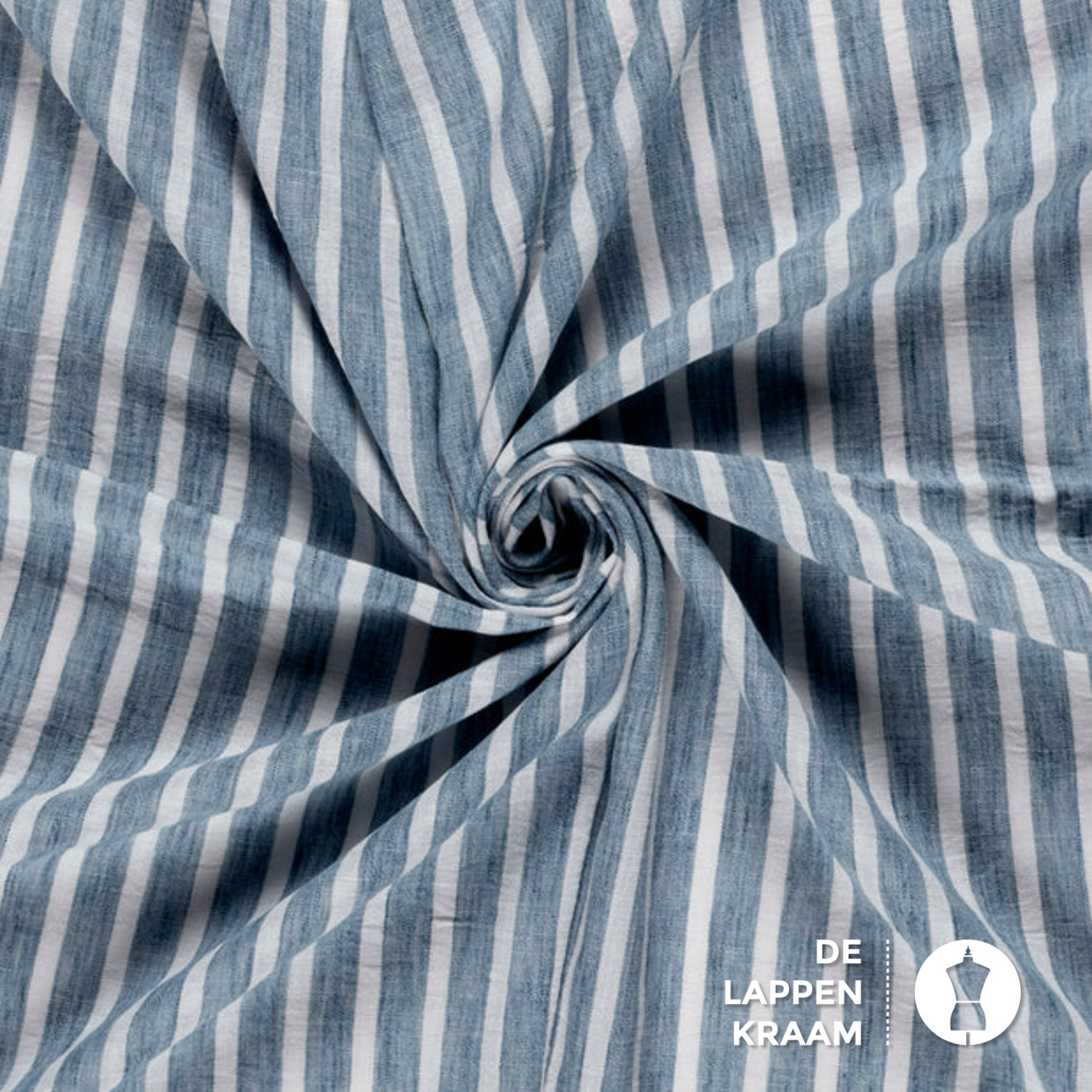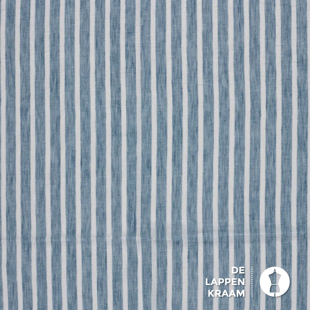 Polyester die is geweven met garen van verschillende diktes, waardoor de stof het uiterlijk van linnen krijgt. Over de lengte van de stof lopen blauwe strepen van 2cm breed.... Lees meer