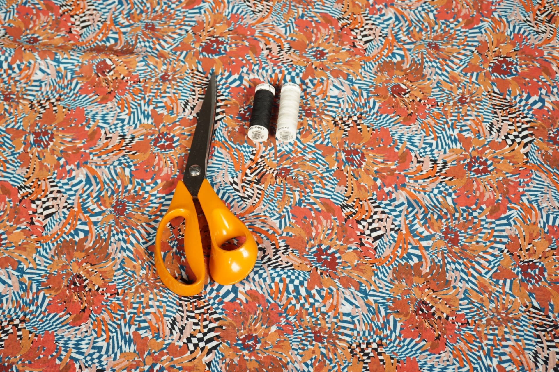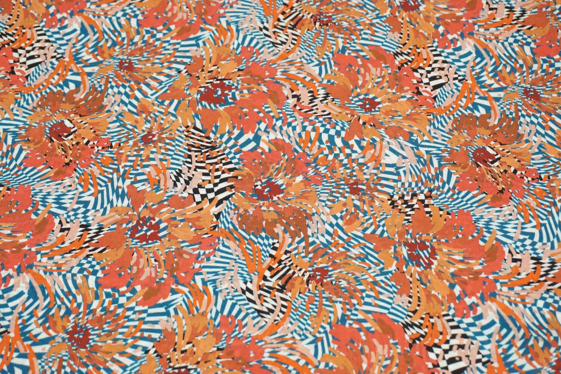 Deze polyester stof is lastig te omschrijven. De ondergrond bestaat uit een blauw en zwart met witte psychedelische print. Daarop staat streepjes in oranje tinten die een soort bloemen vormen.... Lees meer