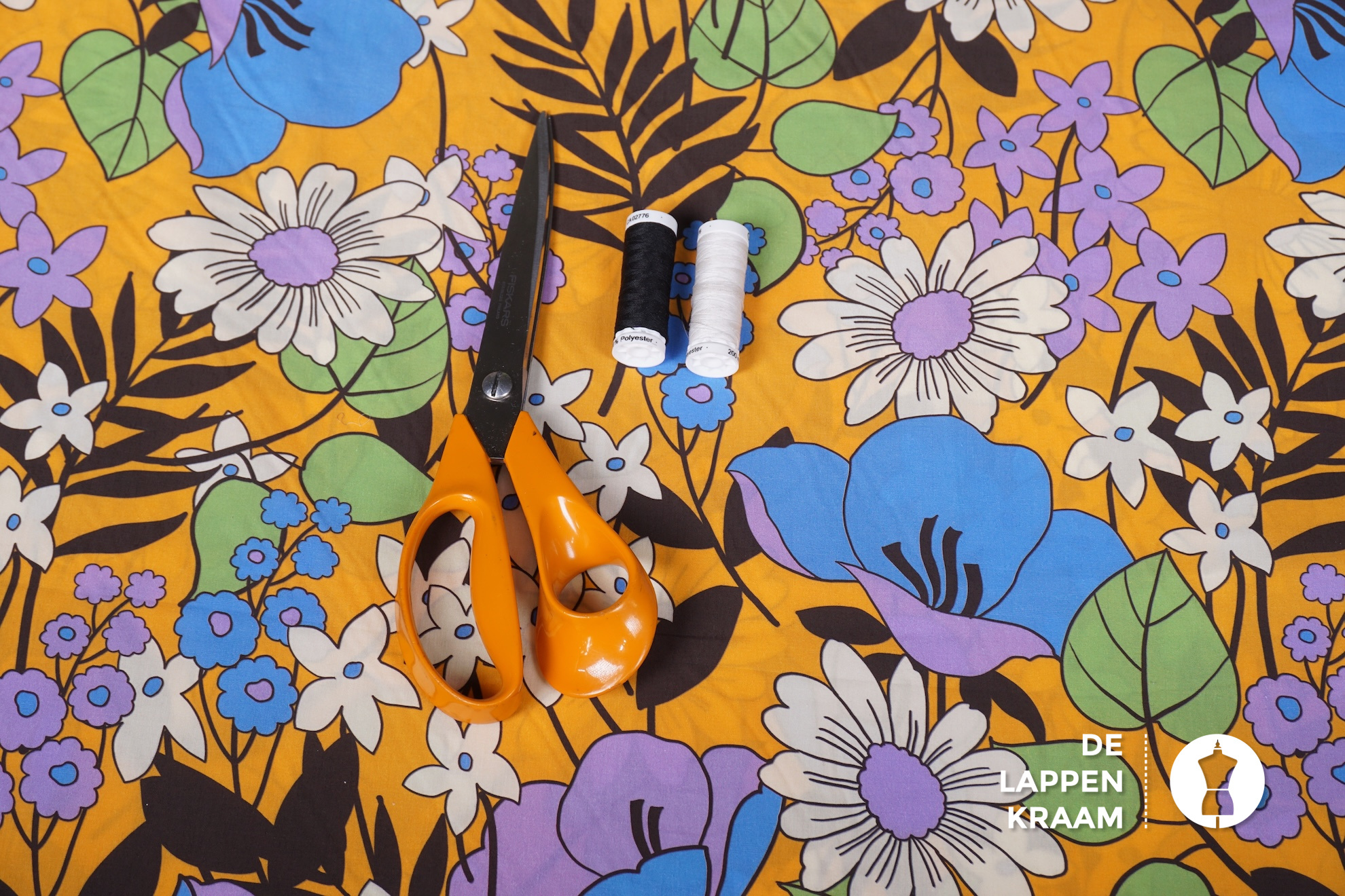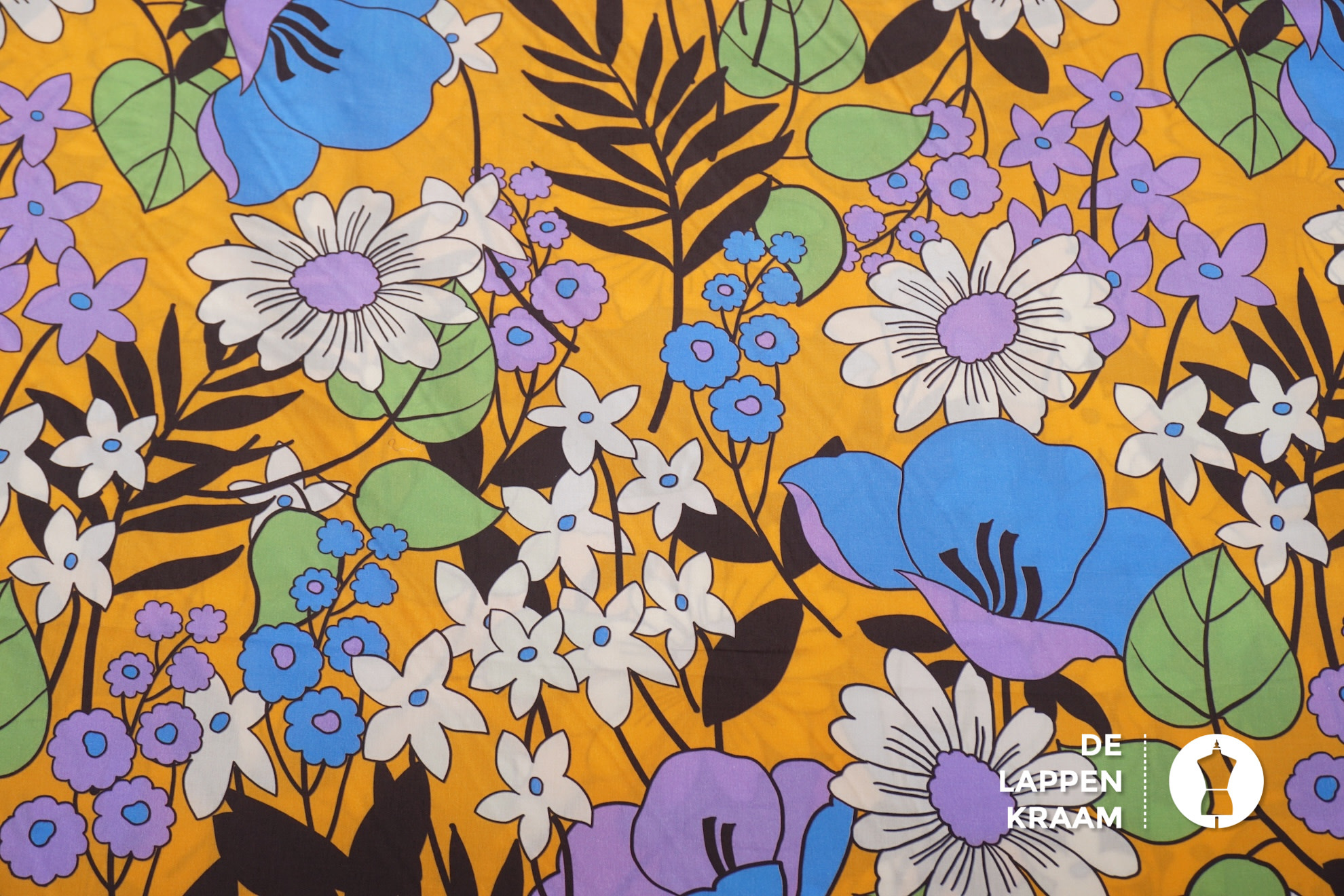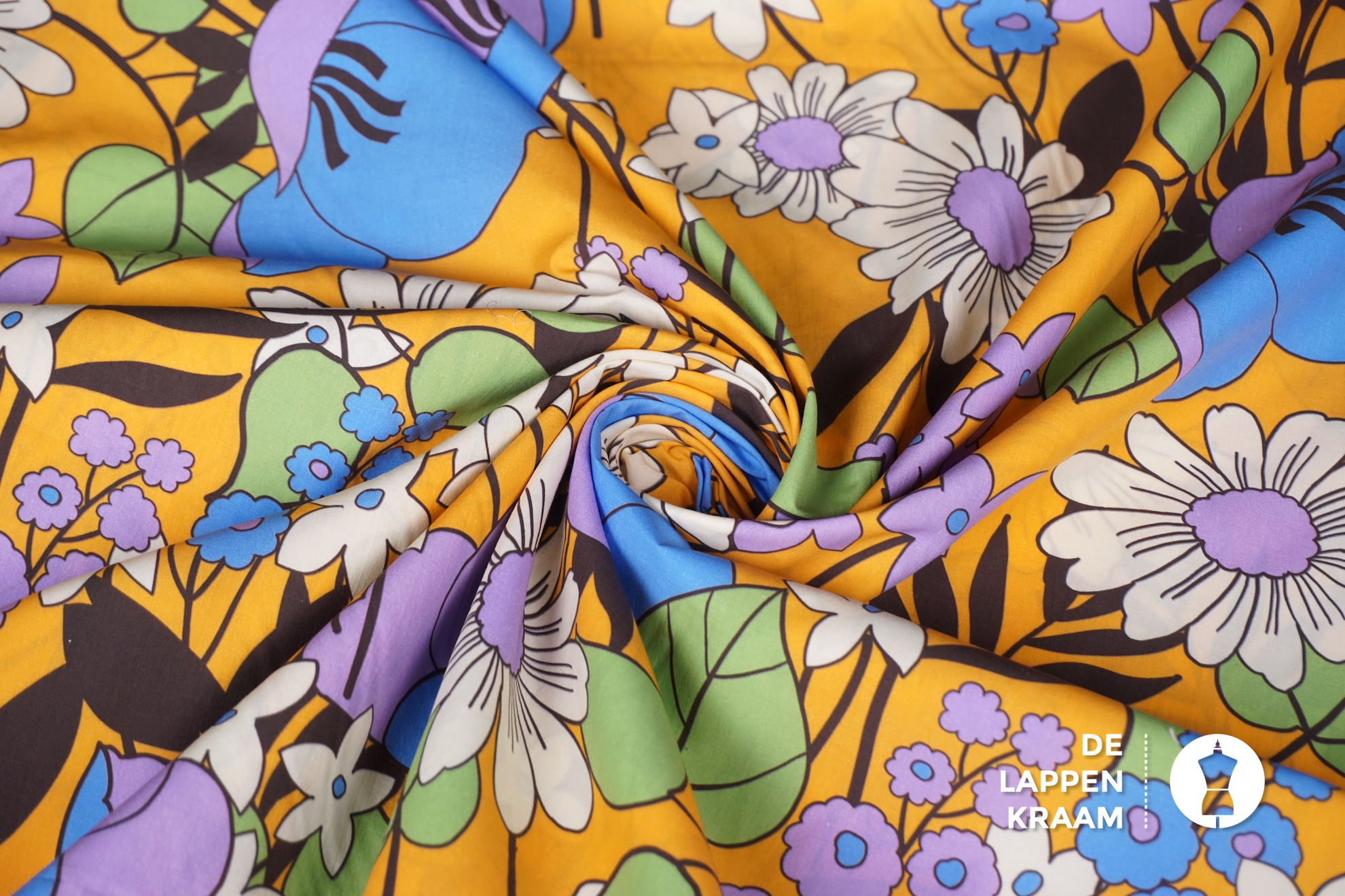 Prachtige popeline stof van 100% katoen in het geel, met een kleurrijke print van allerlei soorten bloemen in lila, blauw en gebroken wit, met bladeren in bruin en groen.... Lees meer