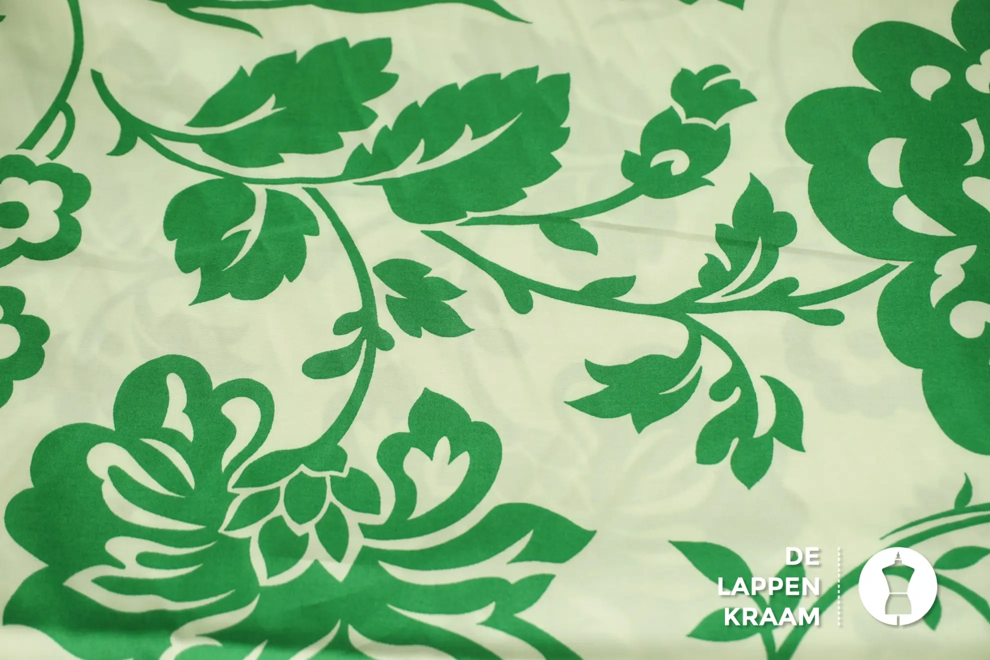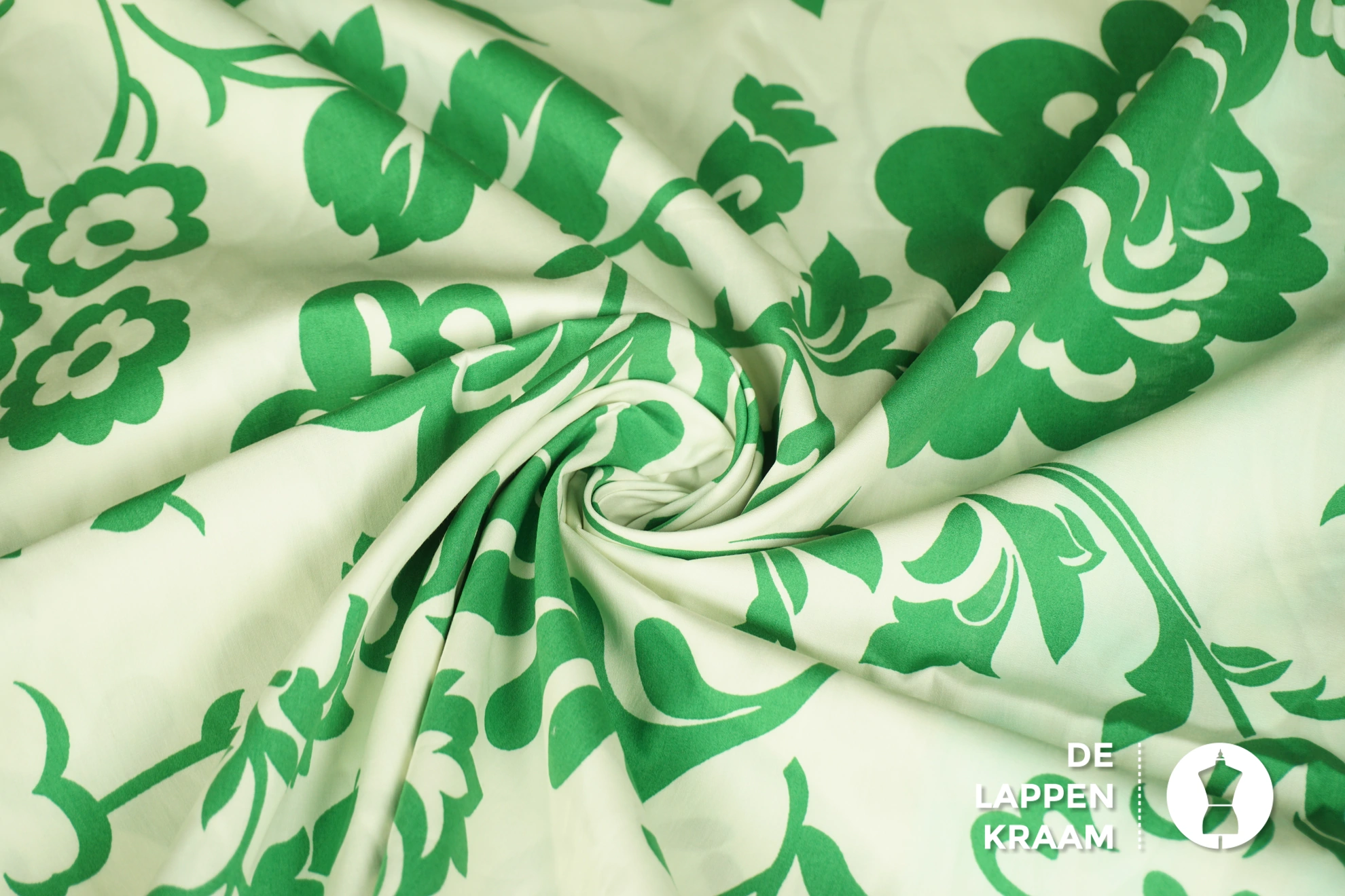 Black Friday Popeline stof in spierwit met felgroen fantasiedessin