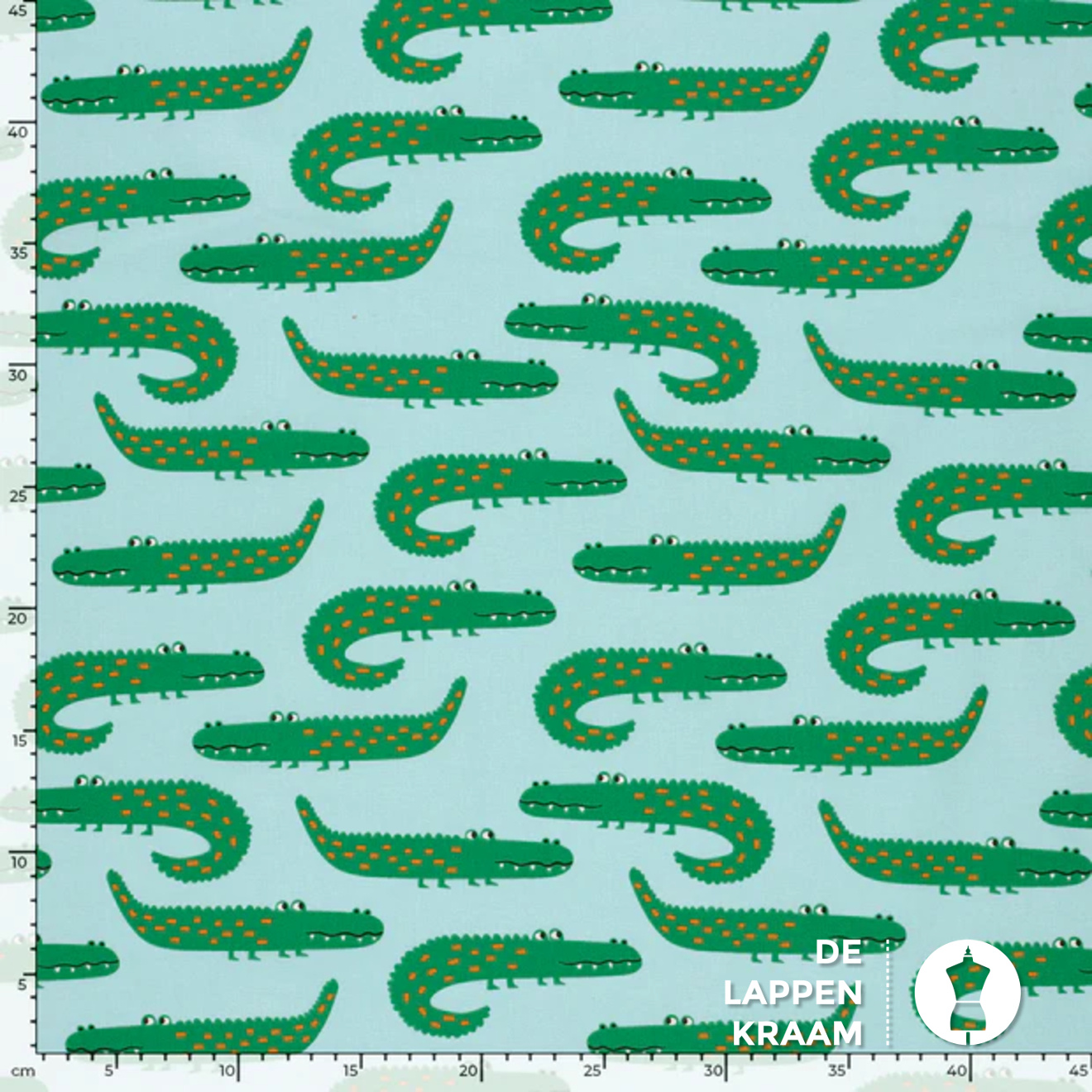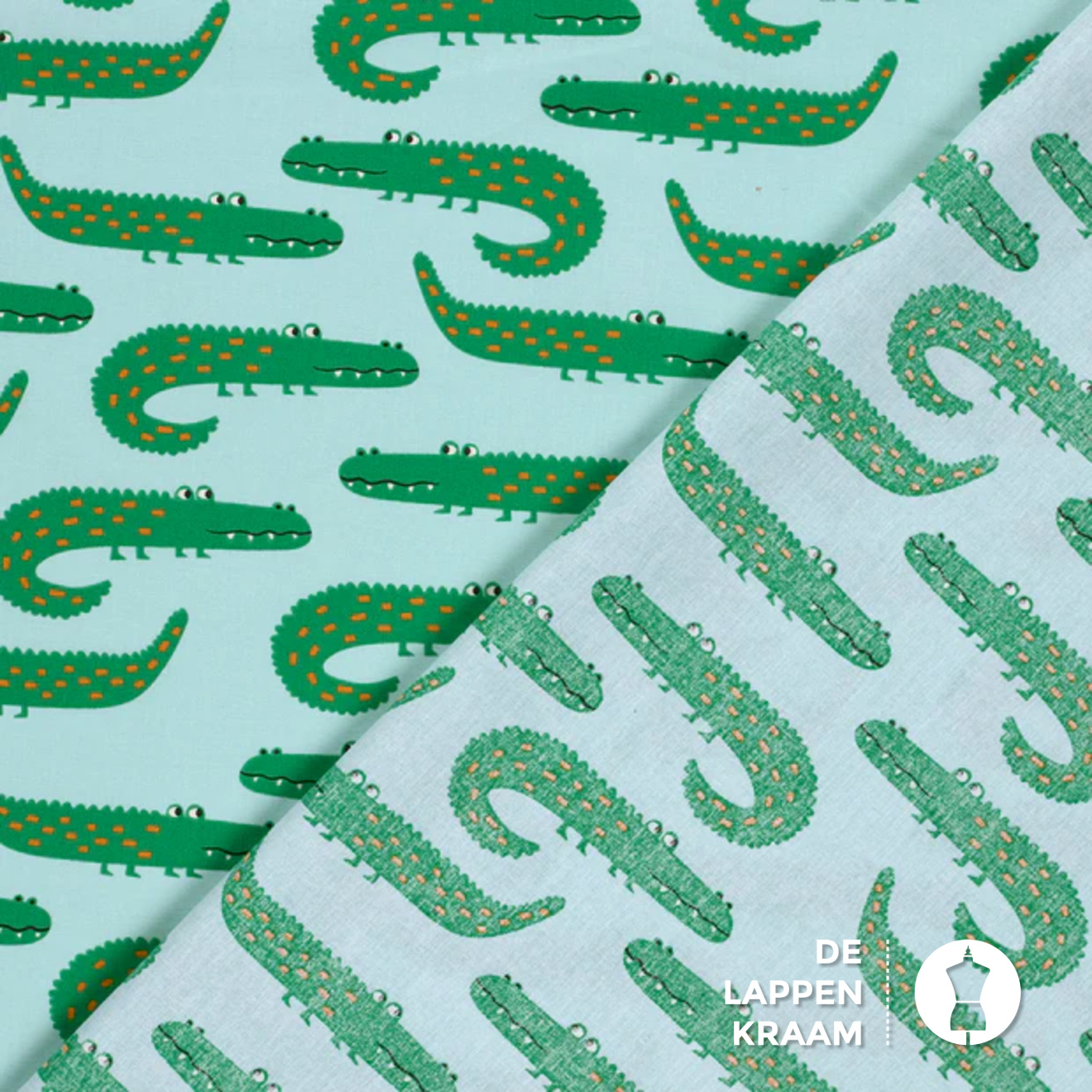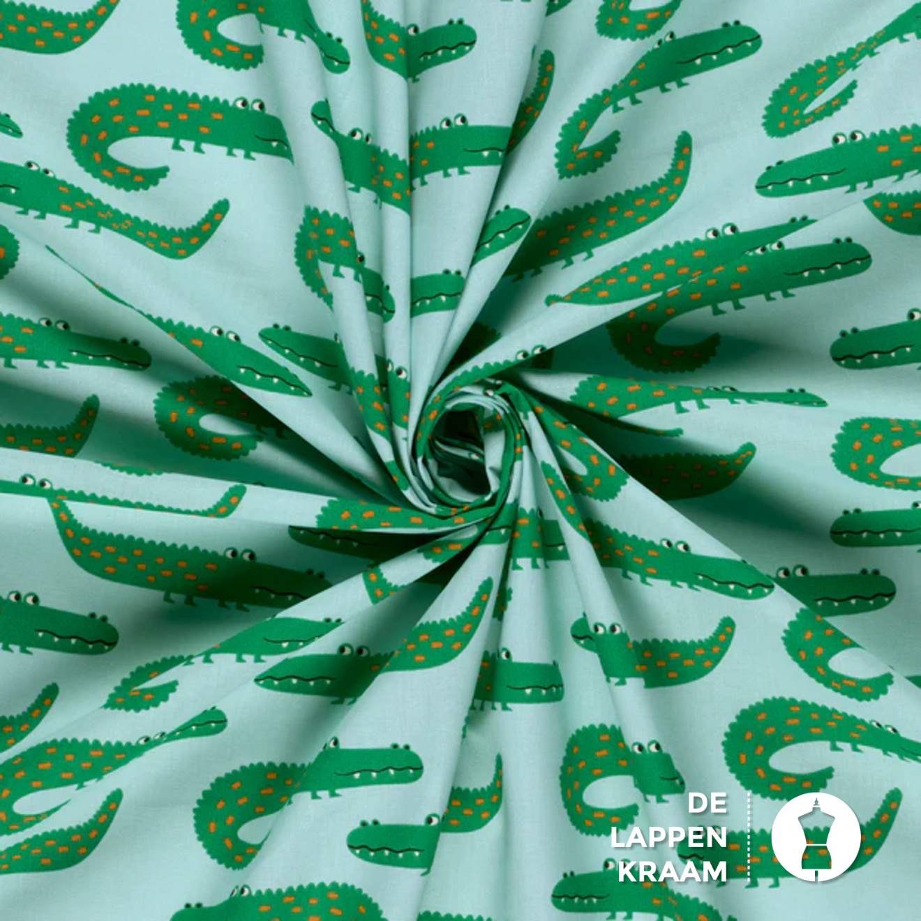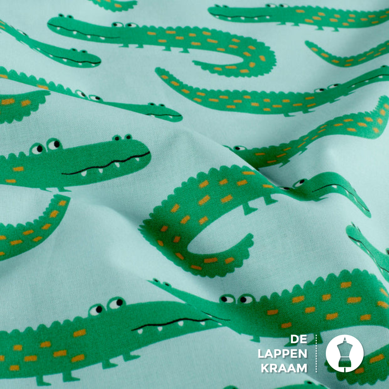 Popeline van 100% katoen in mintgroen met een hele leuke print van groene krokodillen. Lees meer