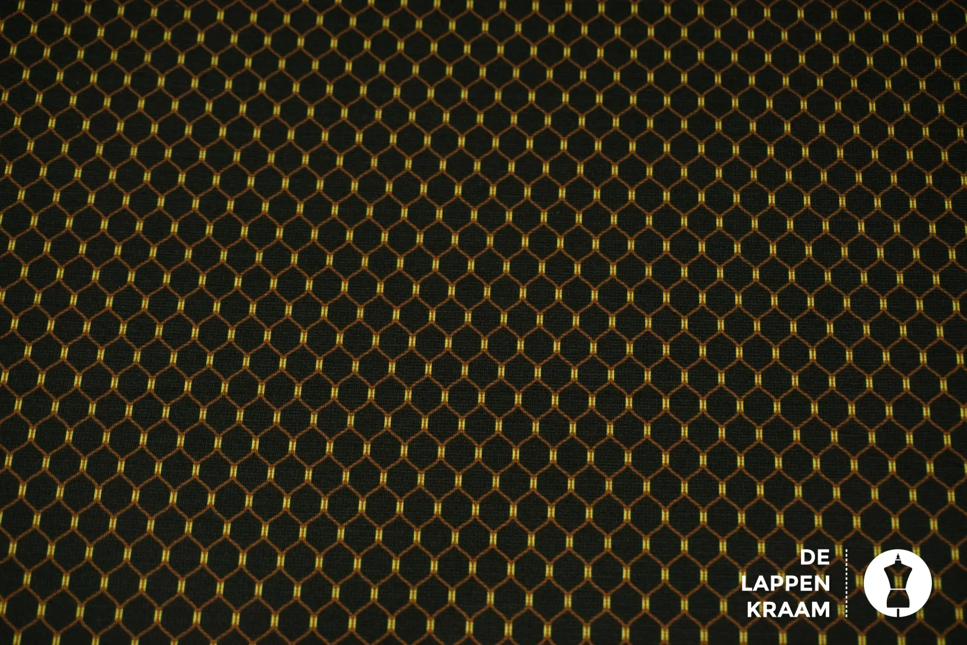 Een gladde, gebreide stof die wit is aan de achterkant en zwart met een leuk motiefje in okergeel aan de voorkant. Leuk voor een broek, sweater of jurk.... Lees meer