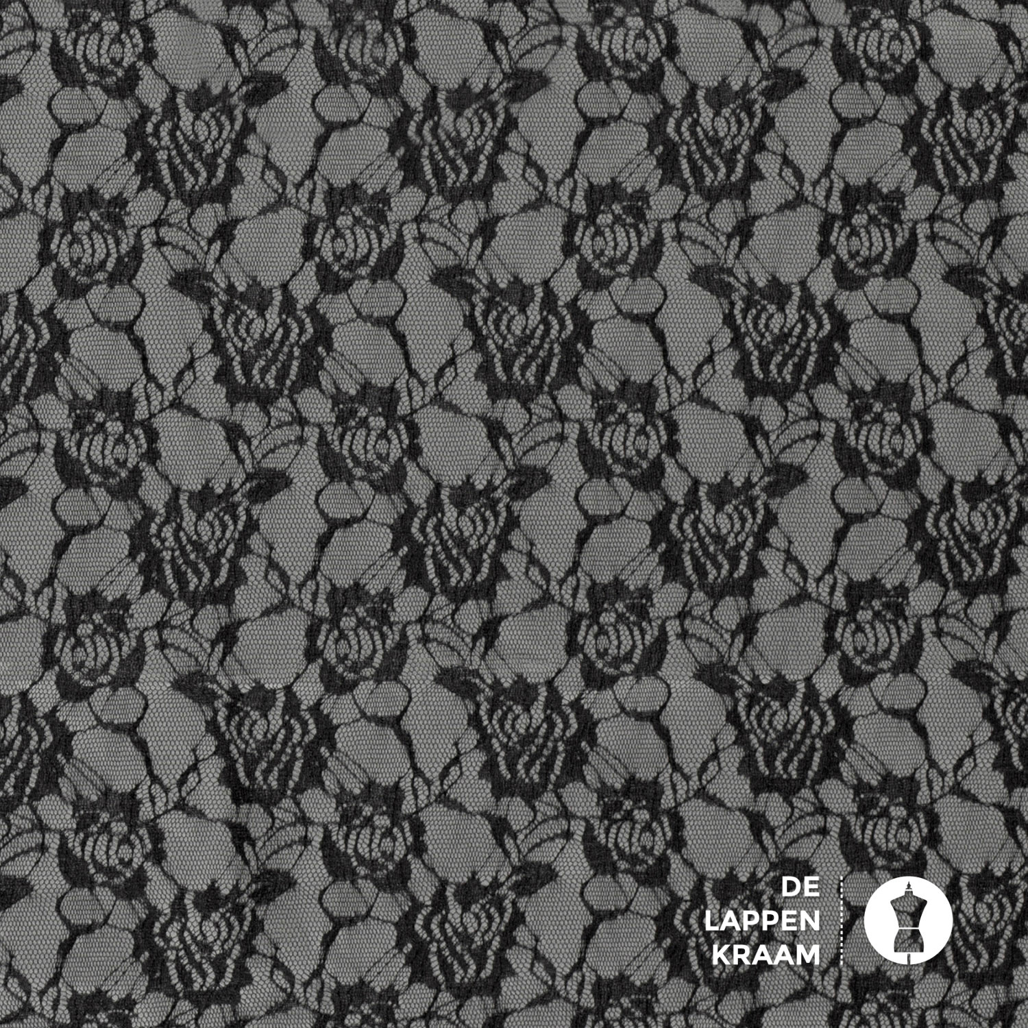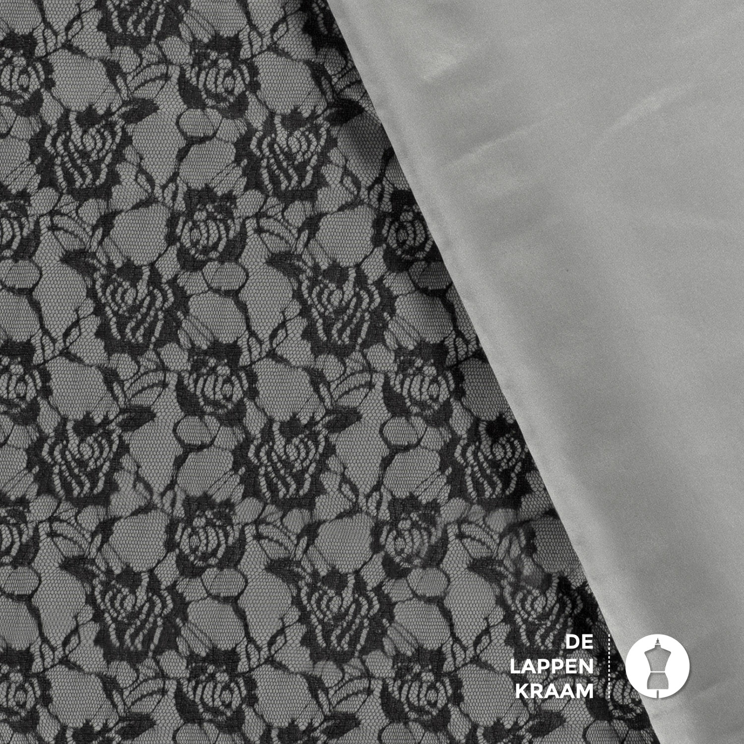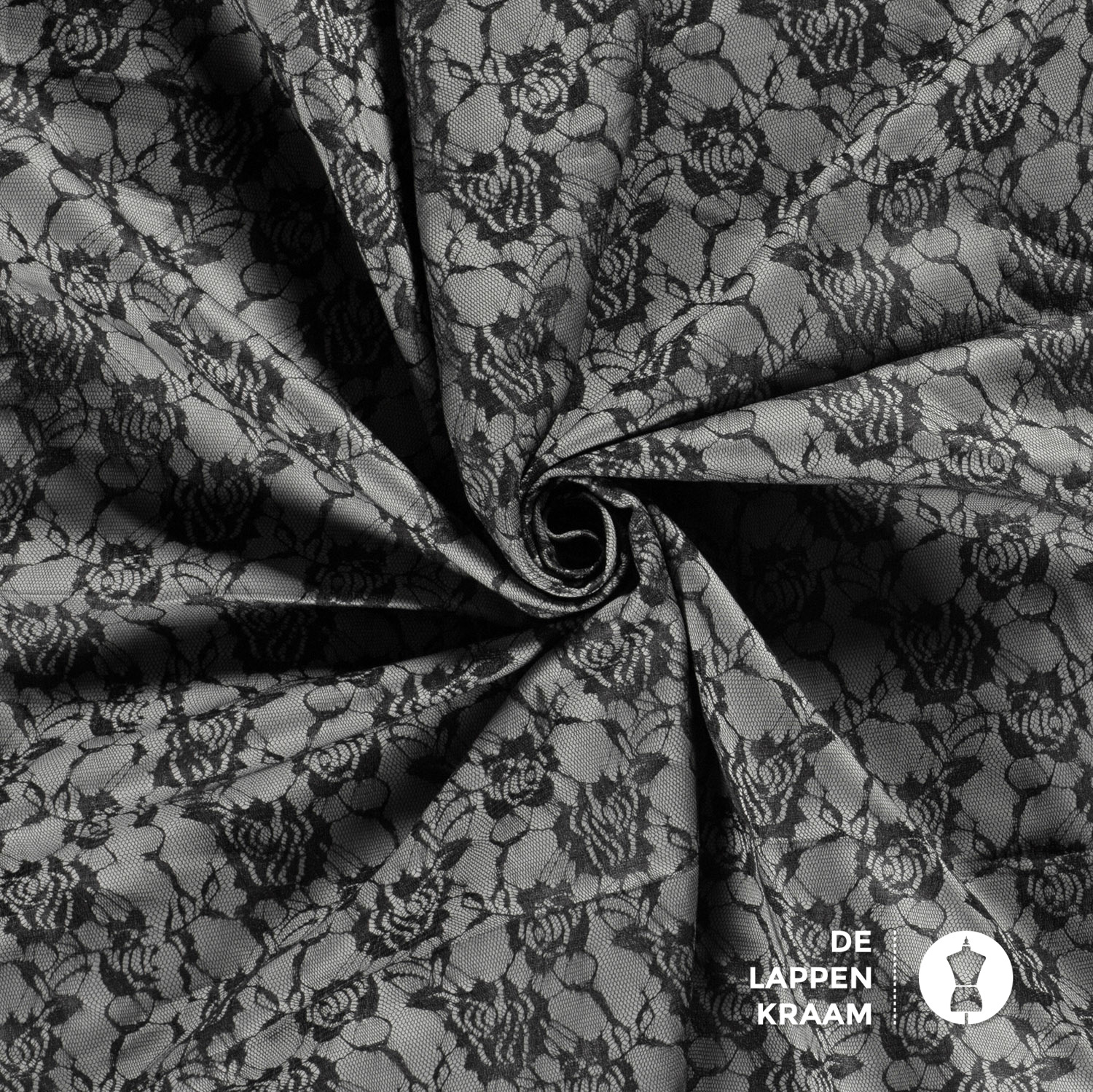 Deze bijzondere punta stof heeft een dun opgelegd laagje kant in een bloemenvorm. De grijze ondergrond is bedekt met zwart kant.... Lees meer