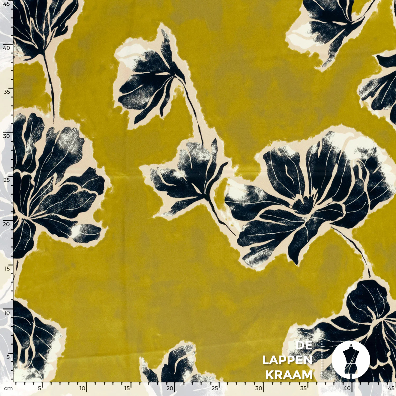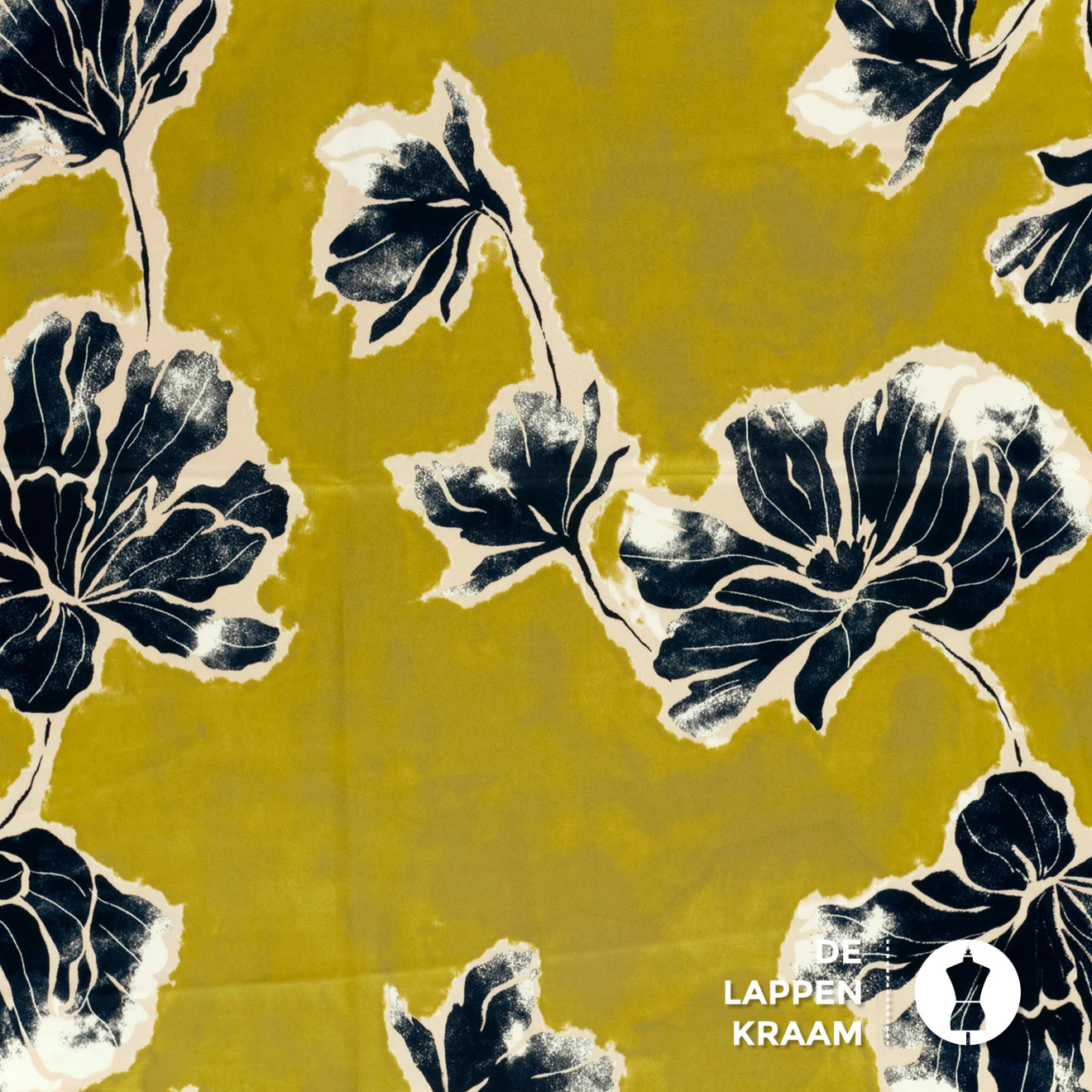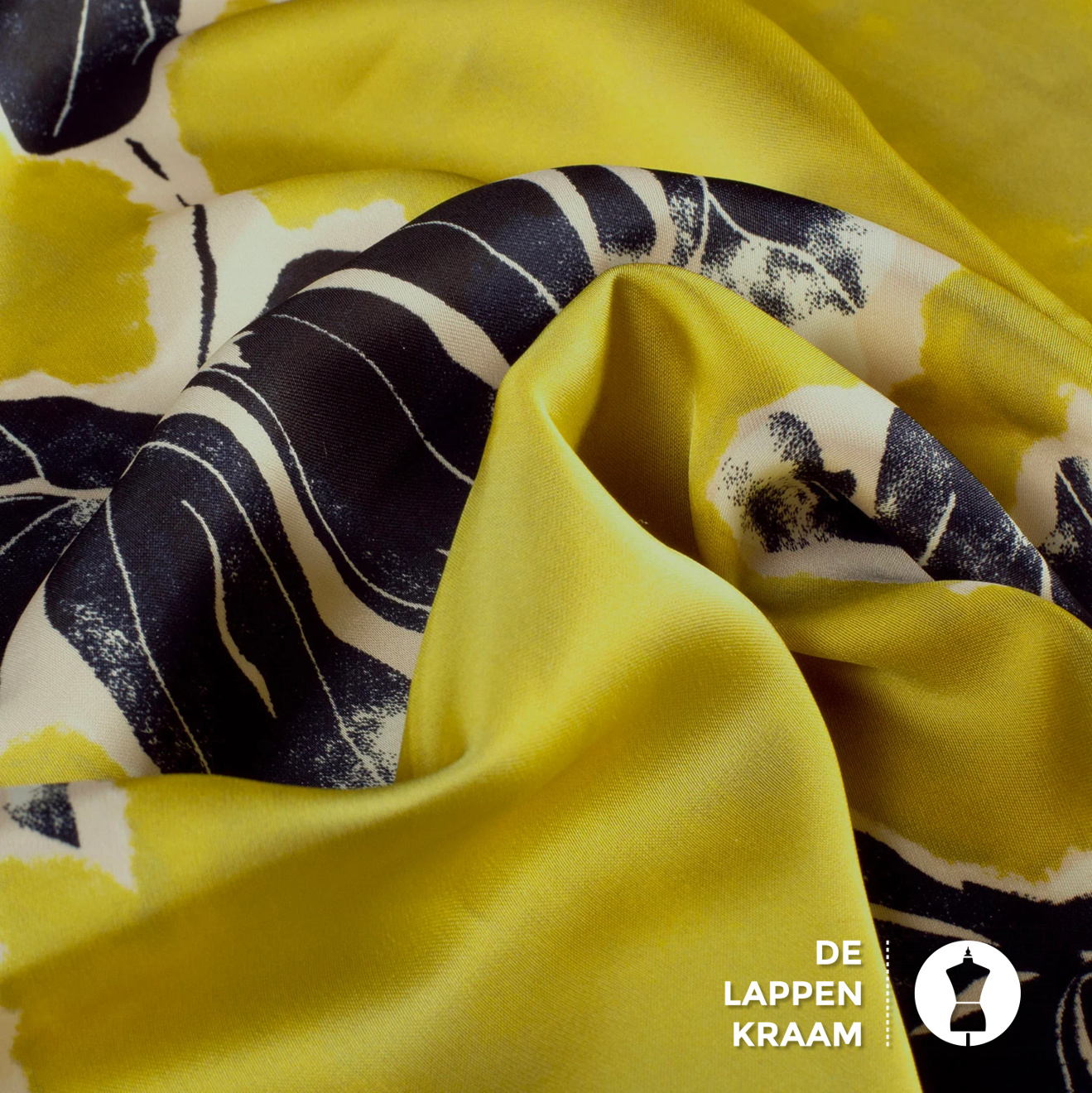 Prachtige geweven satijn gevlekt in lime een dessin van grote bloemen in grijstinten, omgeven door licht beige. Heel mooi voor bijvoorbeeld blouses, jurken en broeken... Lees meer