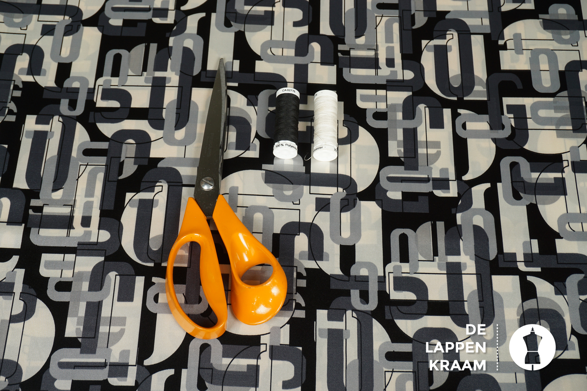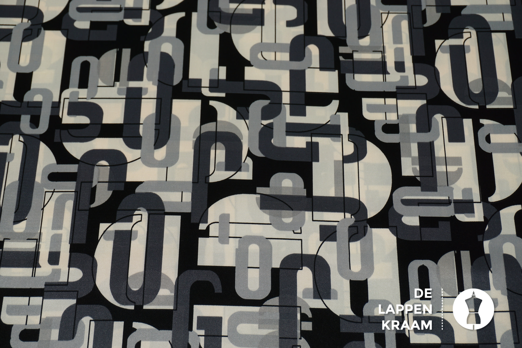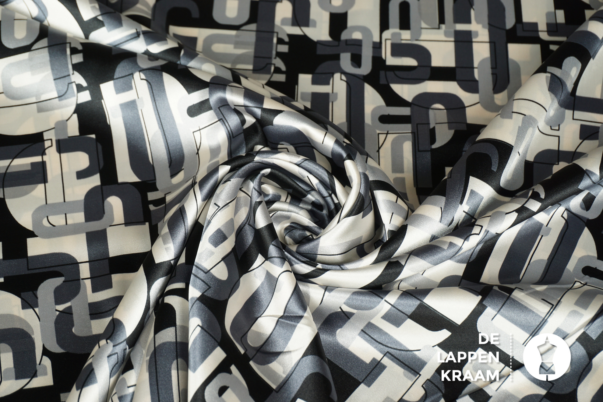 Viscose satijn in verschillende tinten grijs op een zwarte ondergrond. De print bestaat uit allerlei letters als G, O , J en I. De letters lopen allemaal door elkaar heen.... Lees meer