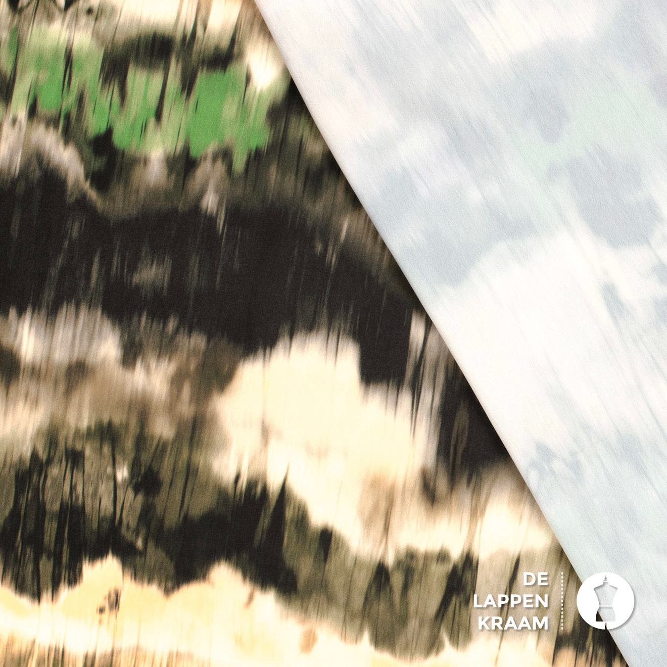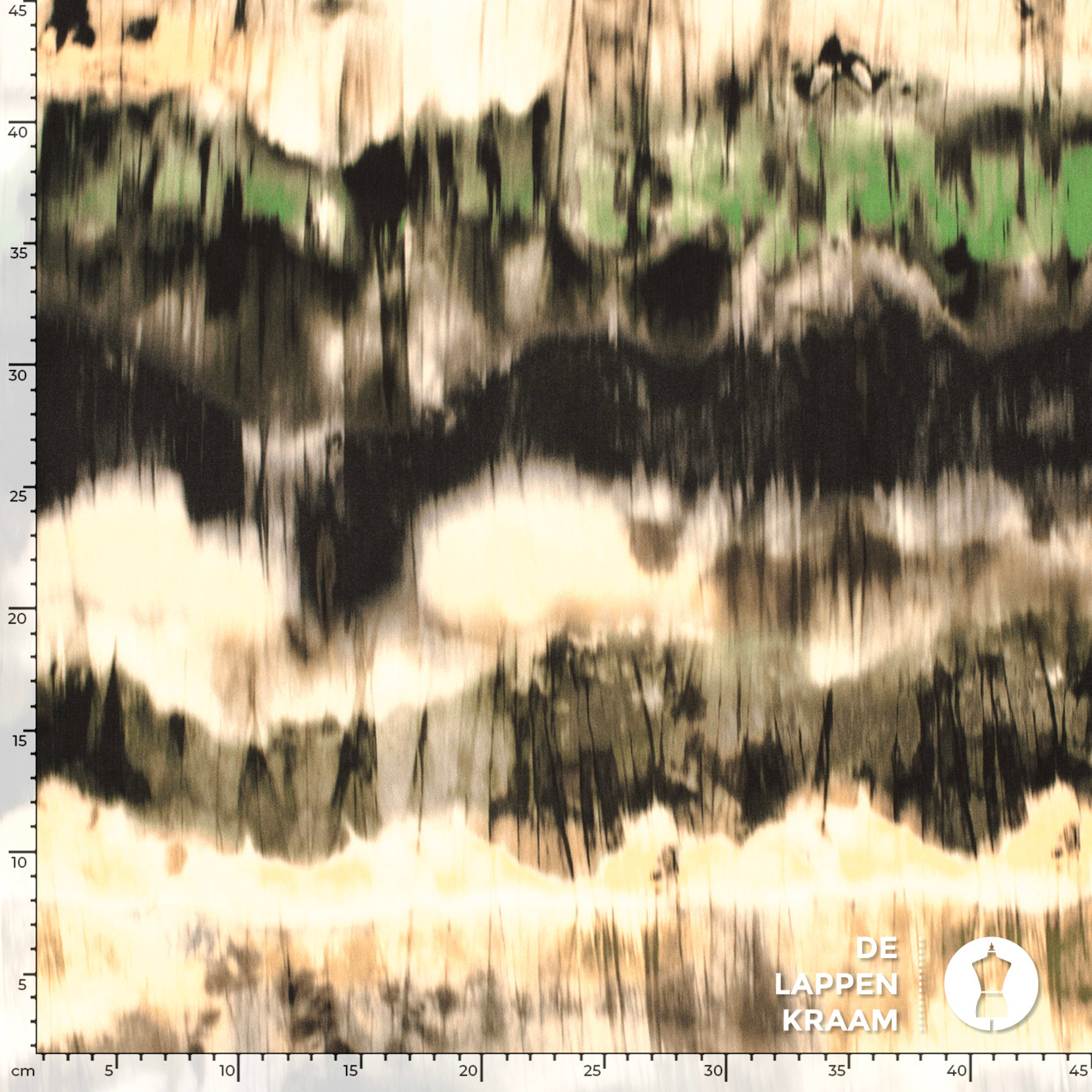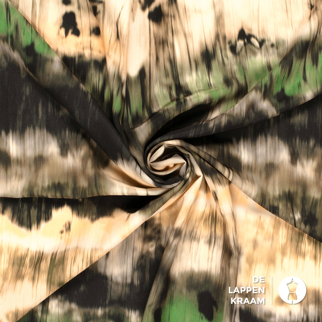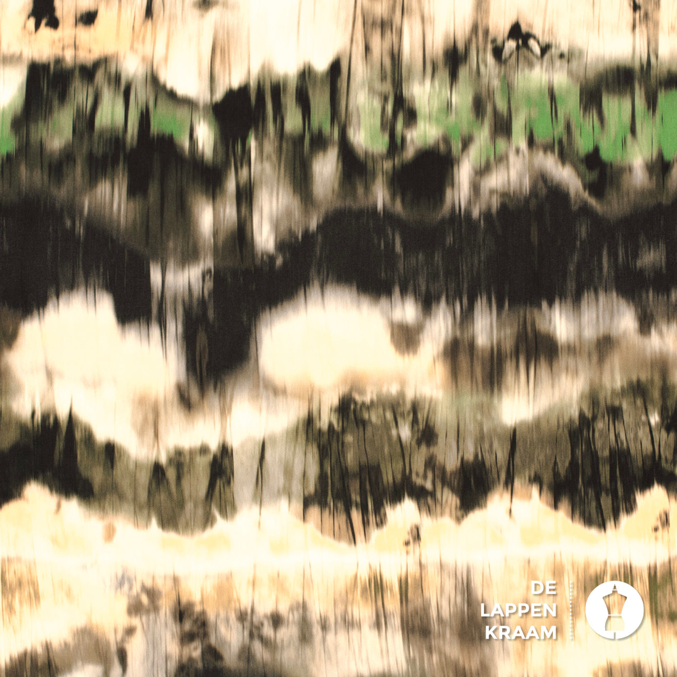 Satijn stof met abstract patroon in olijfgroen en roomwit