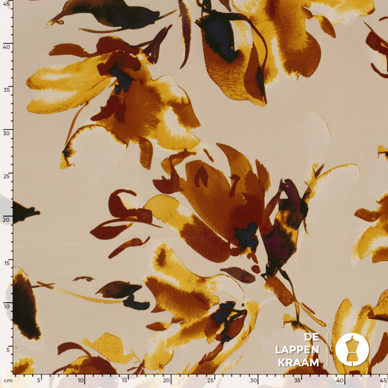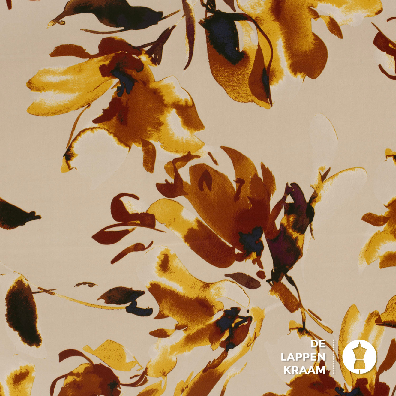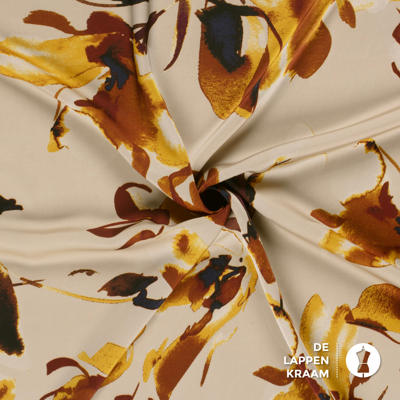 Subtiele glans en een mooie valling. De ondergrond is lichtbeige en het dessin bestaat uit grote bloemen in diverse tinten bruin en okergeel. Mooi voor een broek, blouse, jurk of blouse... Lees meer