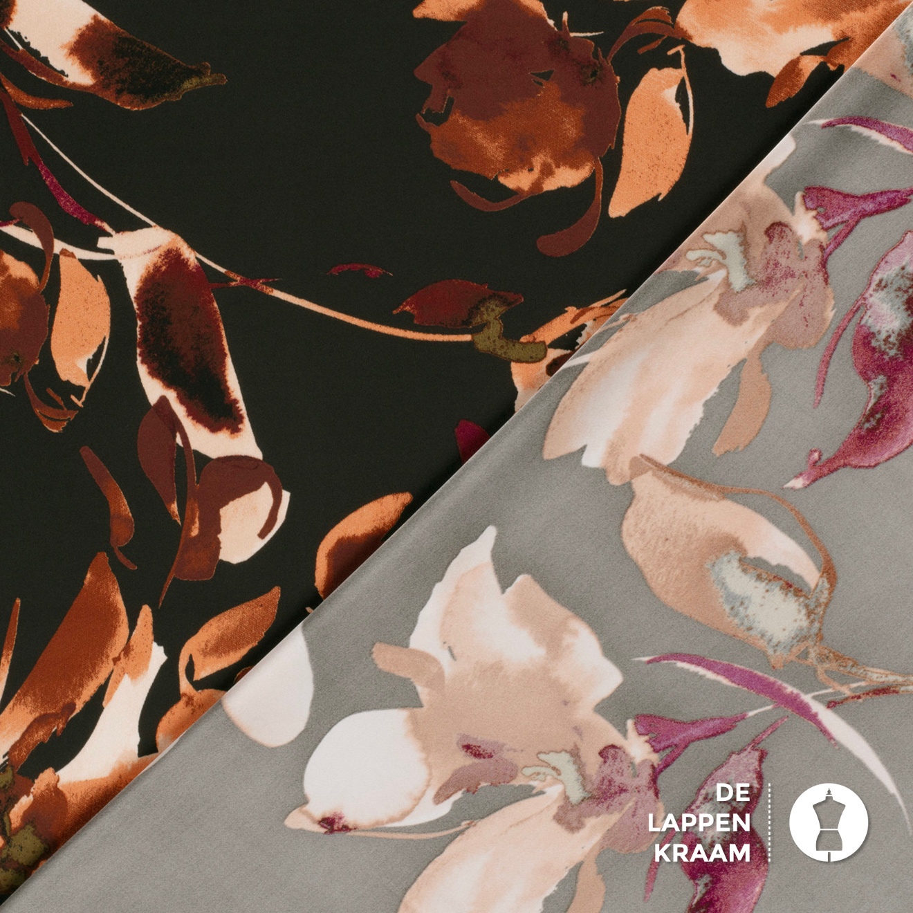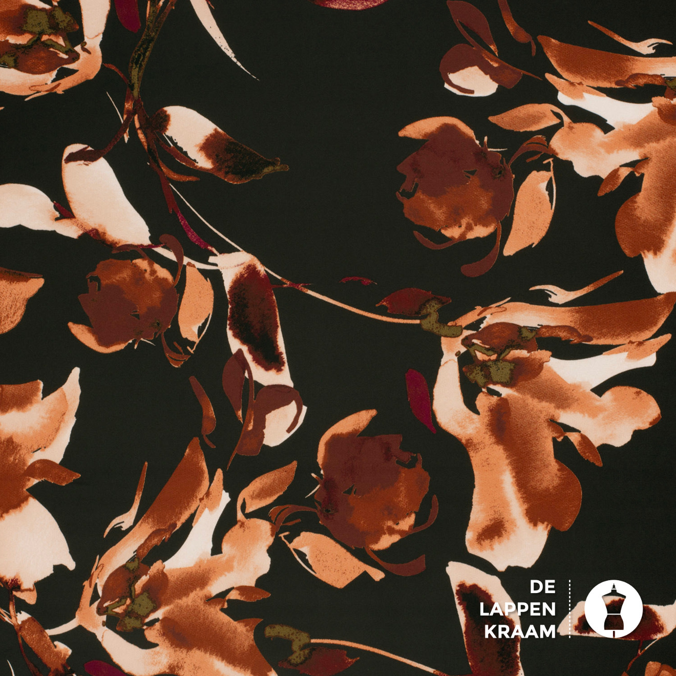 Subtiele glans en een mooie valling. De ondergrond is zwart en het dessin bestaat uit grote bloemen in diverse tinten oranje en zalmroze met hier en daar een beetje legergroen. Mooi voor een broek, blouse, jurk of blouse... Lees meer