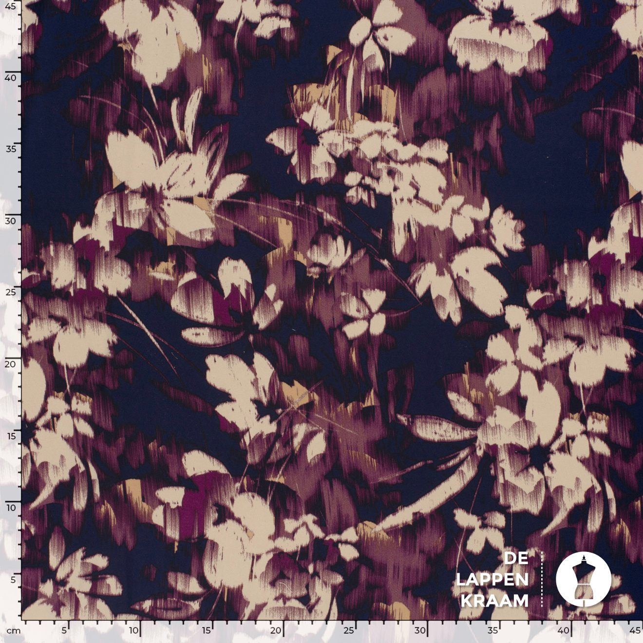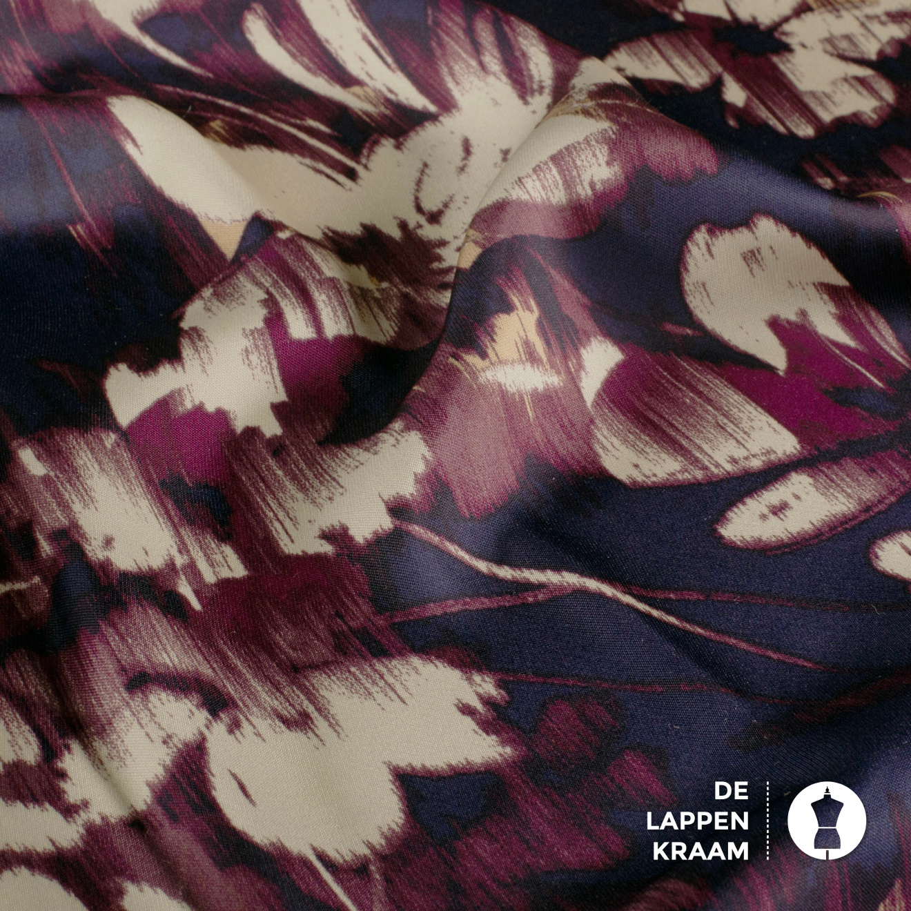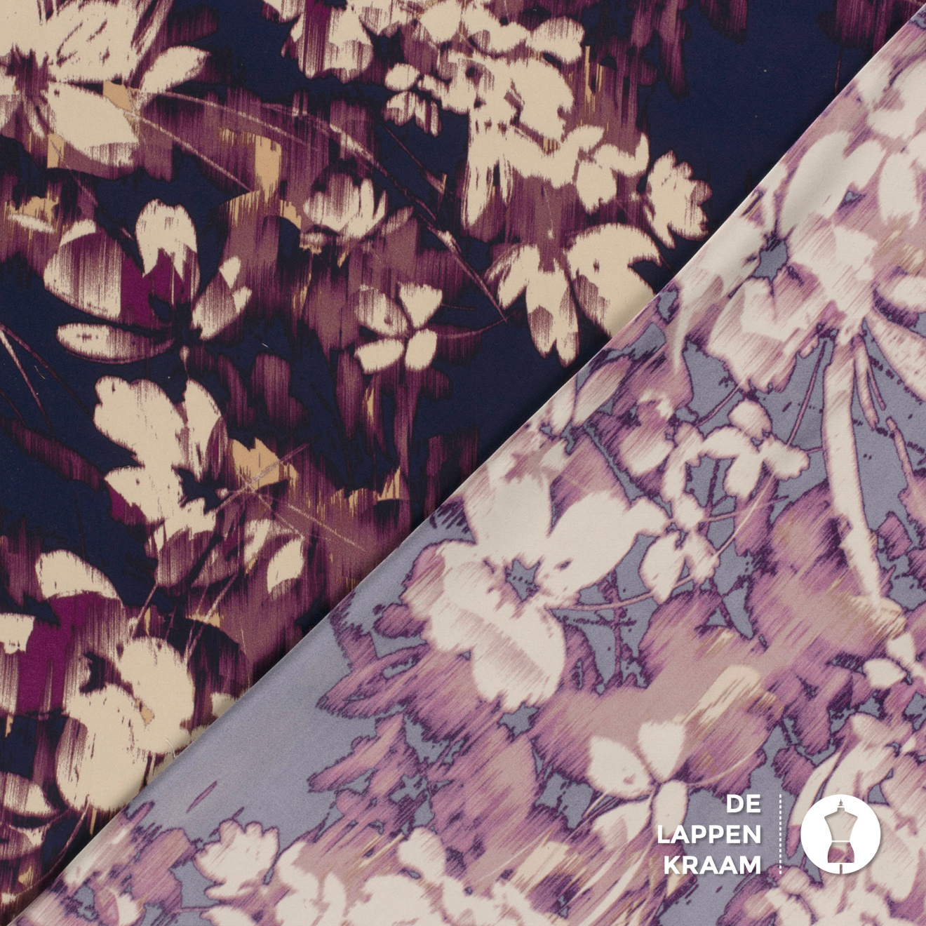 Paarsblauwe ondergrond met bloemen in diverse roze- en beigetinten. Het lijkt of de kleuren zijn uitgelopen maar dat is zeker geen verffout! Mooi voor een jurk, broek, rok of blouse. Door satijnbinding glanst de stof heel subtiel.... Lees meer
