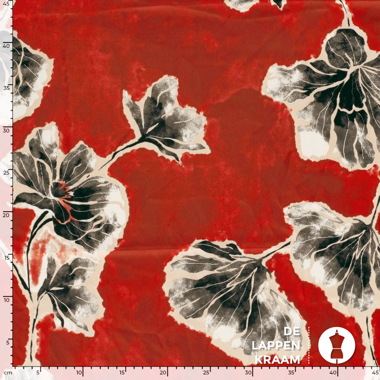 Prachtige geweven satijn gevlekt in roodtinten met een dessin van grote bloemen in grijstinten, omgeven door ecru. Heel mooi voor bijvoorbeeld blouses, jurken en broeken.... Lees meer