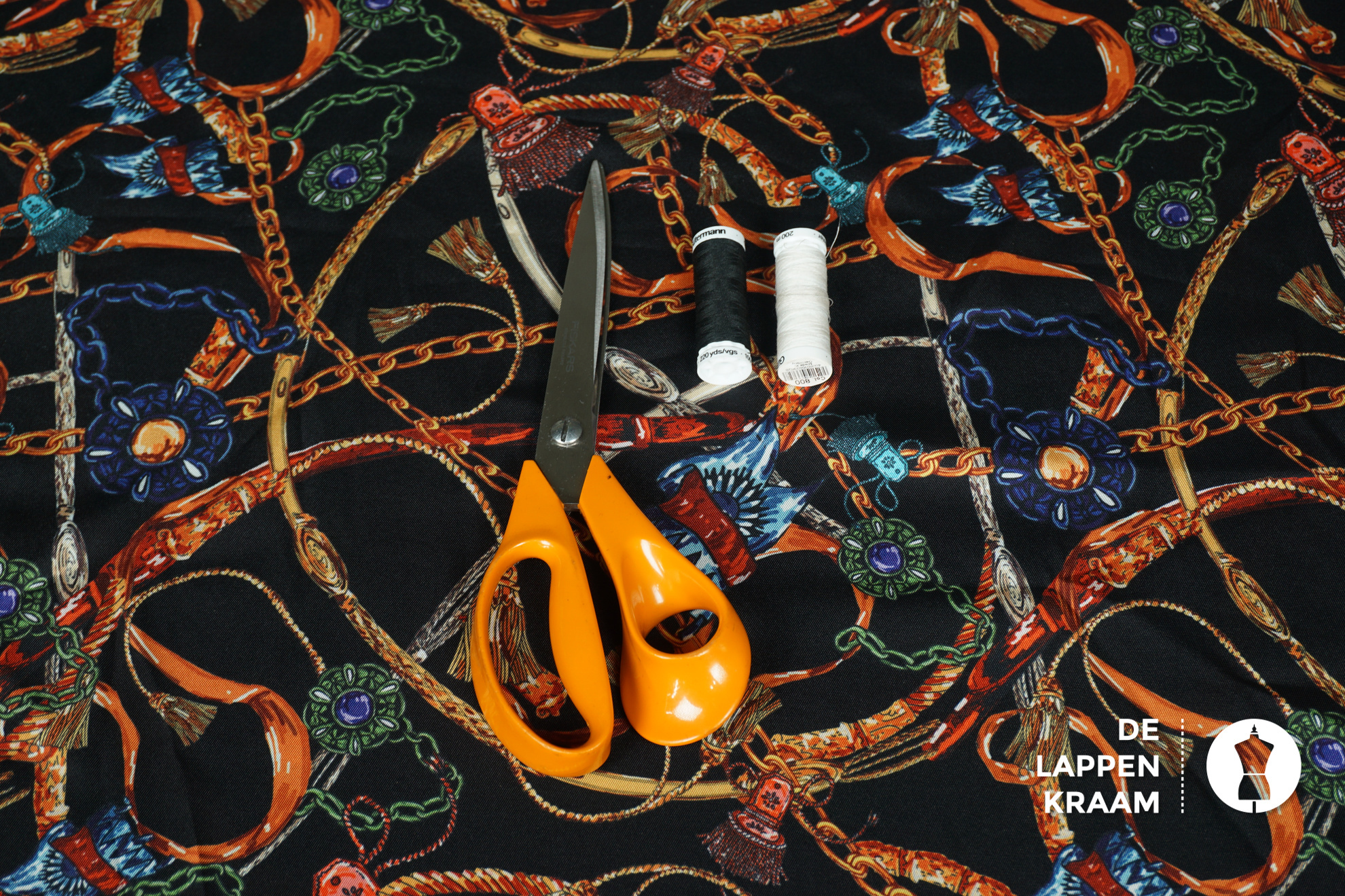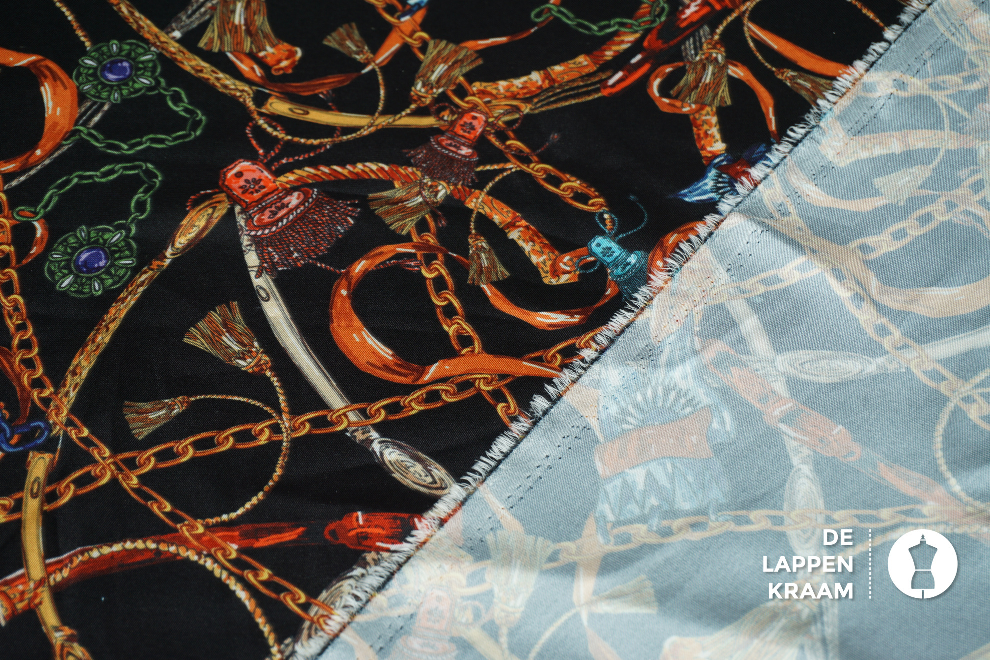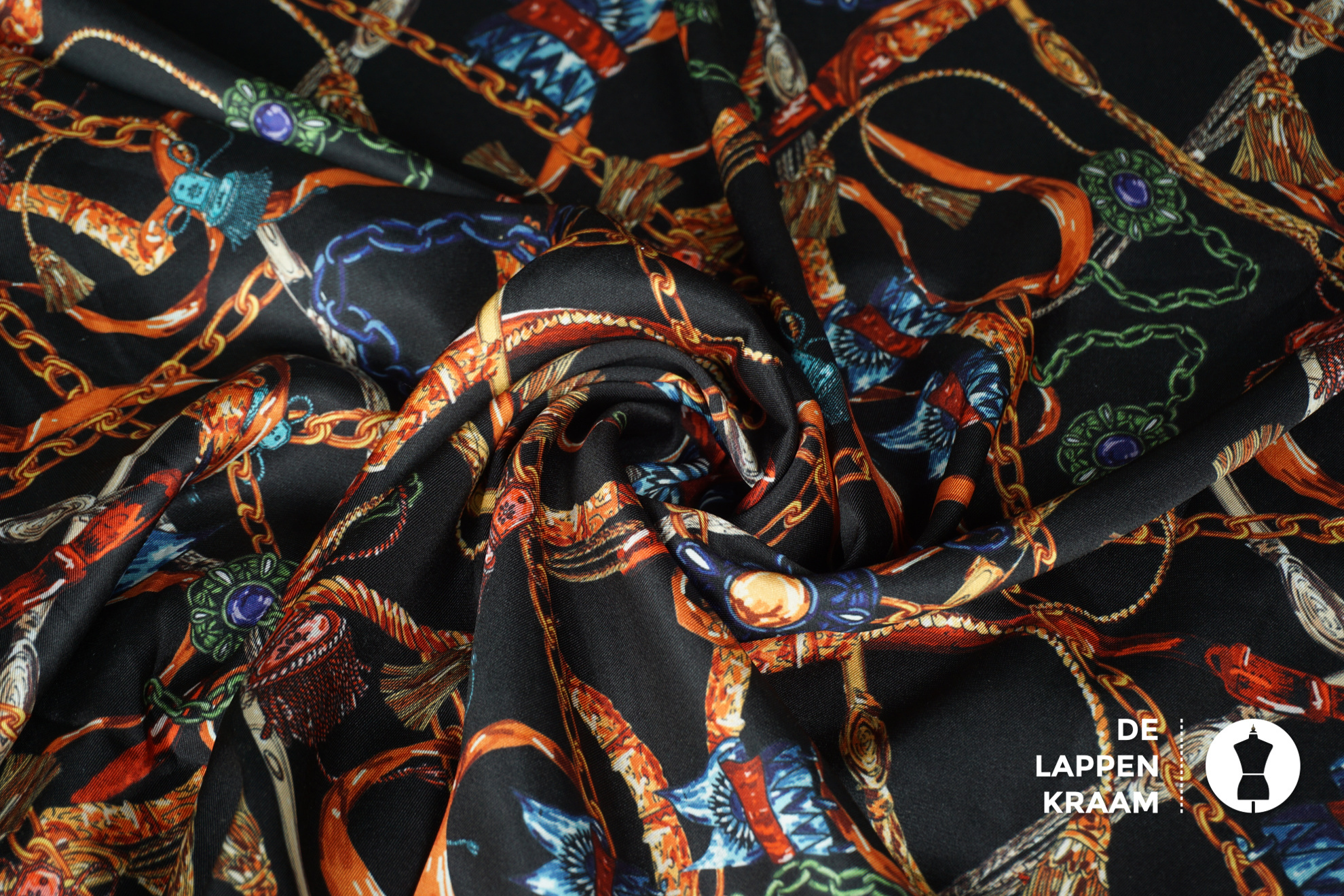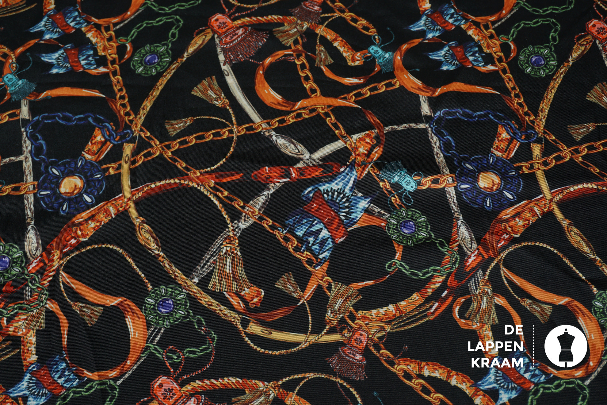 Gladde polyester satijn in het zwart met een print van allerlei kettingen in goud, groen, blauw en rood. Lees meer