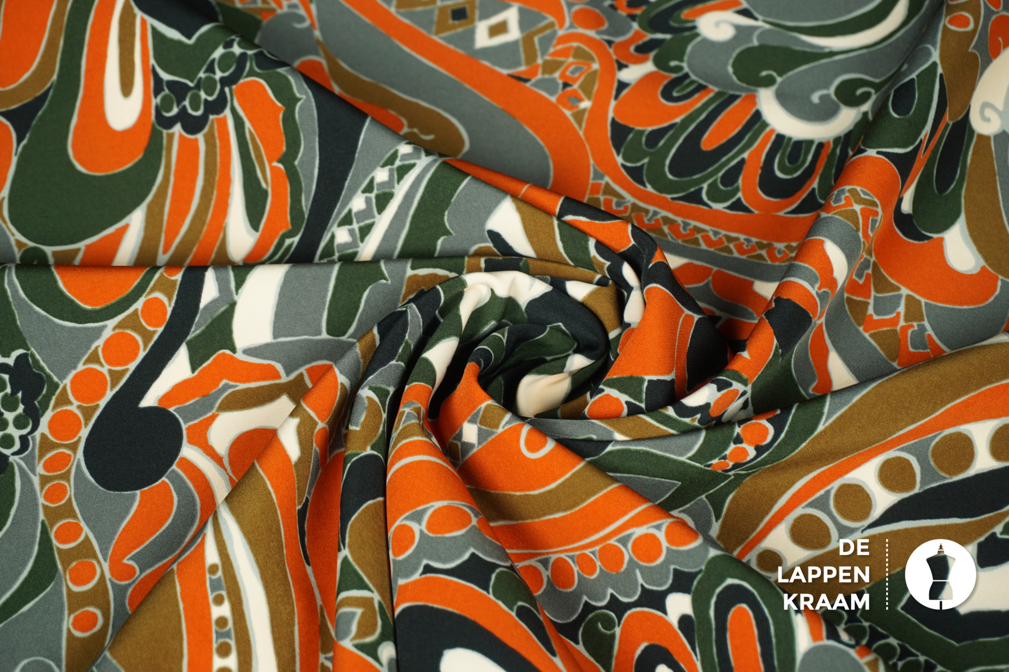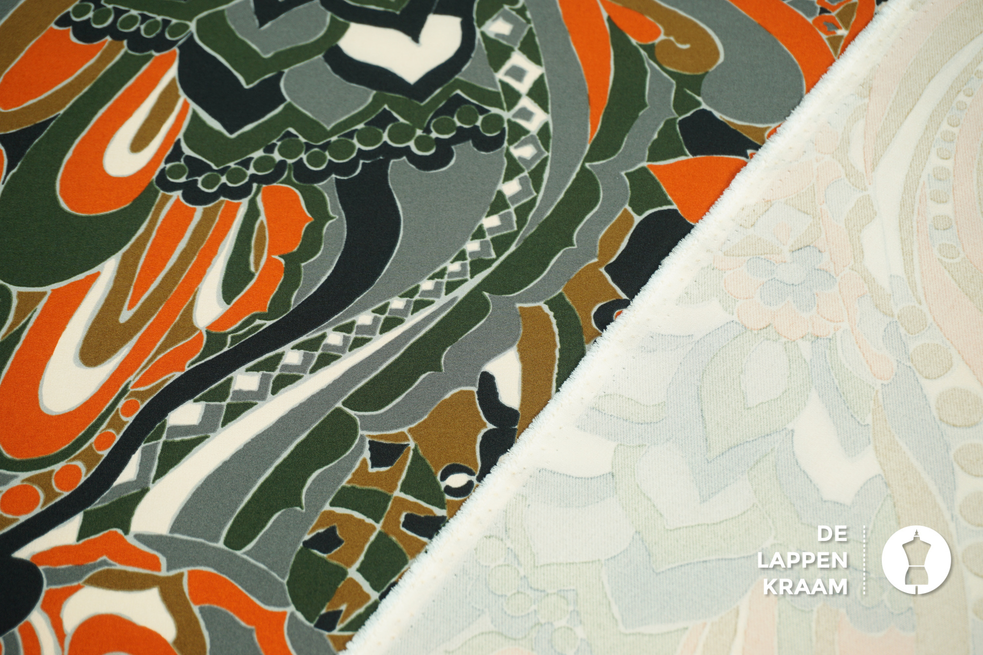 Scuba met weinig stretch (!) in mooie herfsttinten al oranje, caramel. groen en grijs. De print doet een beetje denken aan de stijl van Gaudi. Je kunt er alle kanten mee op: jasje, rok, jurk, broek, jumpsuit.... De achterkant is cremekleurig.... Lees meer