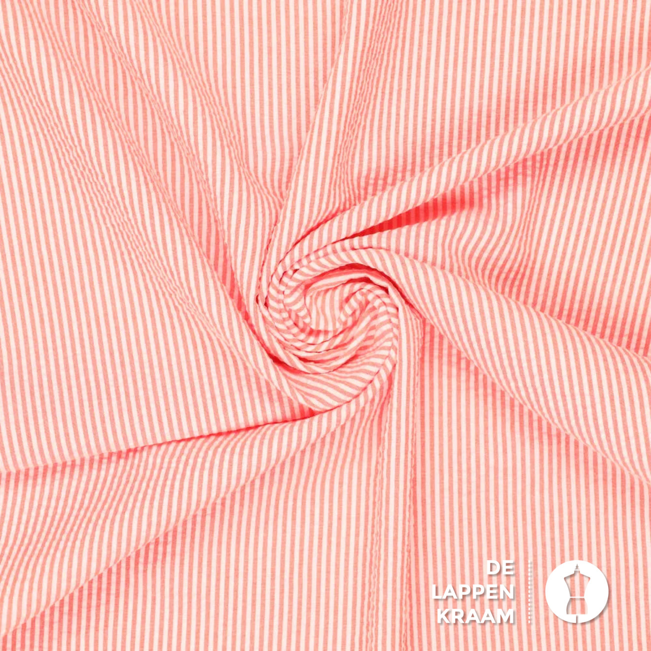 Leuk in zijn eenvoud: een geweven seersucker stof met dunne witte en blauwe streepjes die in de lengte over de stof lopen. De lichte, gekreukte structuur zorgt voor een luchtig en comfortabel gevoel. Strijkvrij en ideaal voor een frisse, zomerse look!... Lees meer