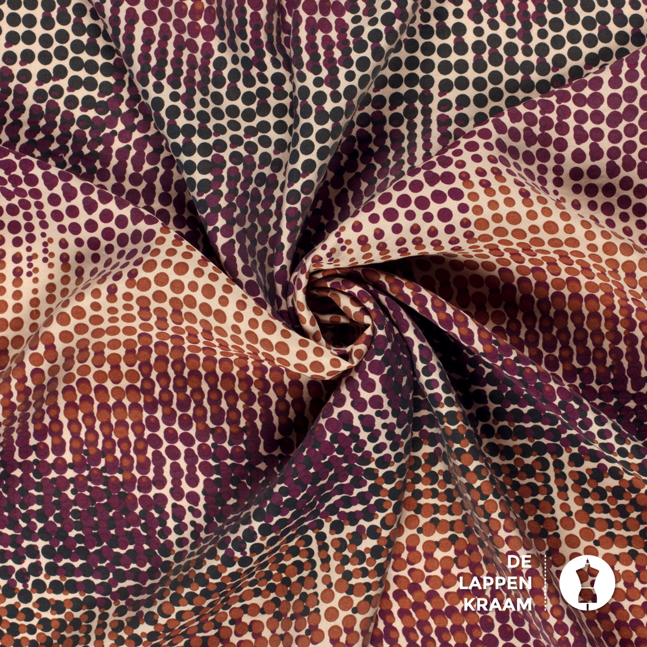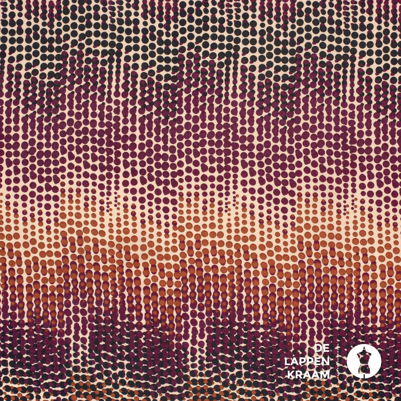 De stipjes in bordeaux, camel, en donkergroen vormen een verticaal strepenpatroon. Ze combineren prima met een effen gabardine of stretchterlenka. Leuk voor een blouse, rok of jurk.... Lees meer