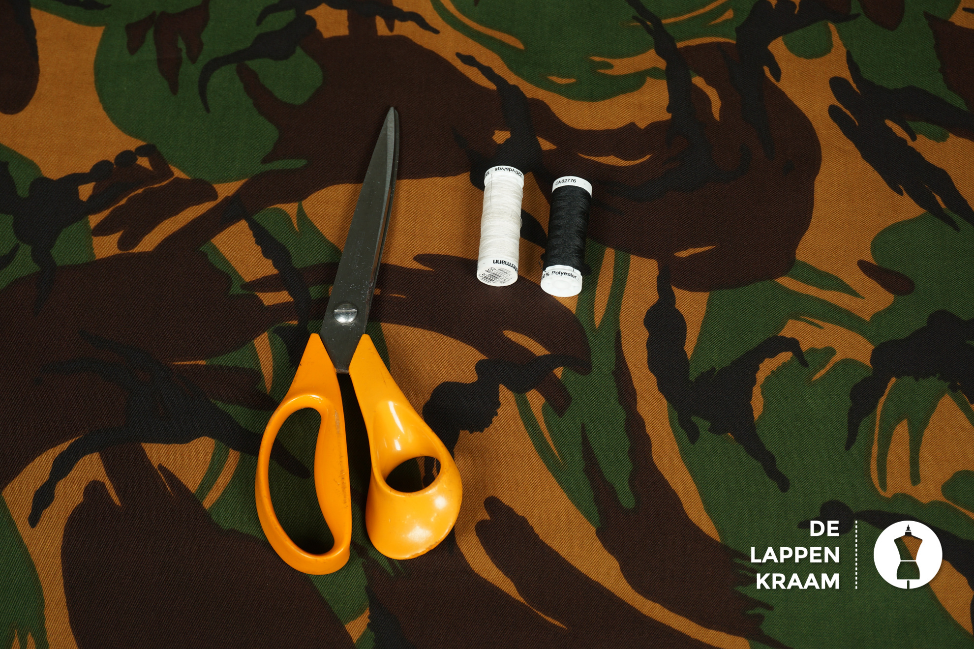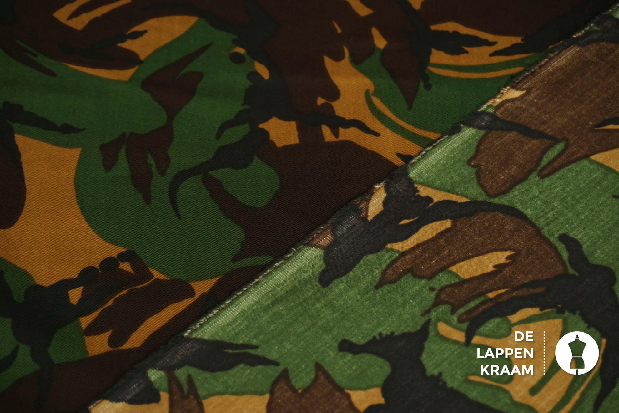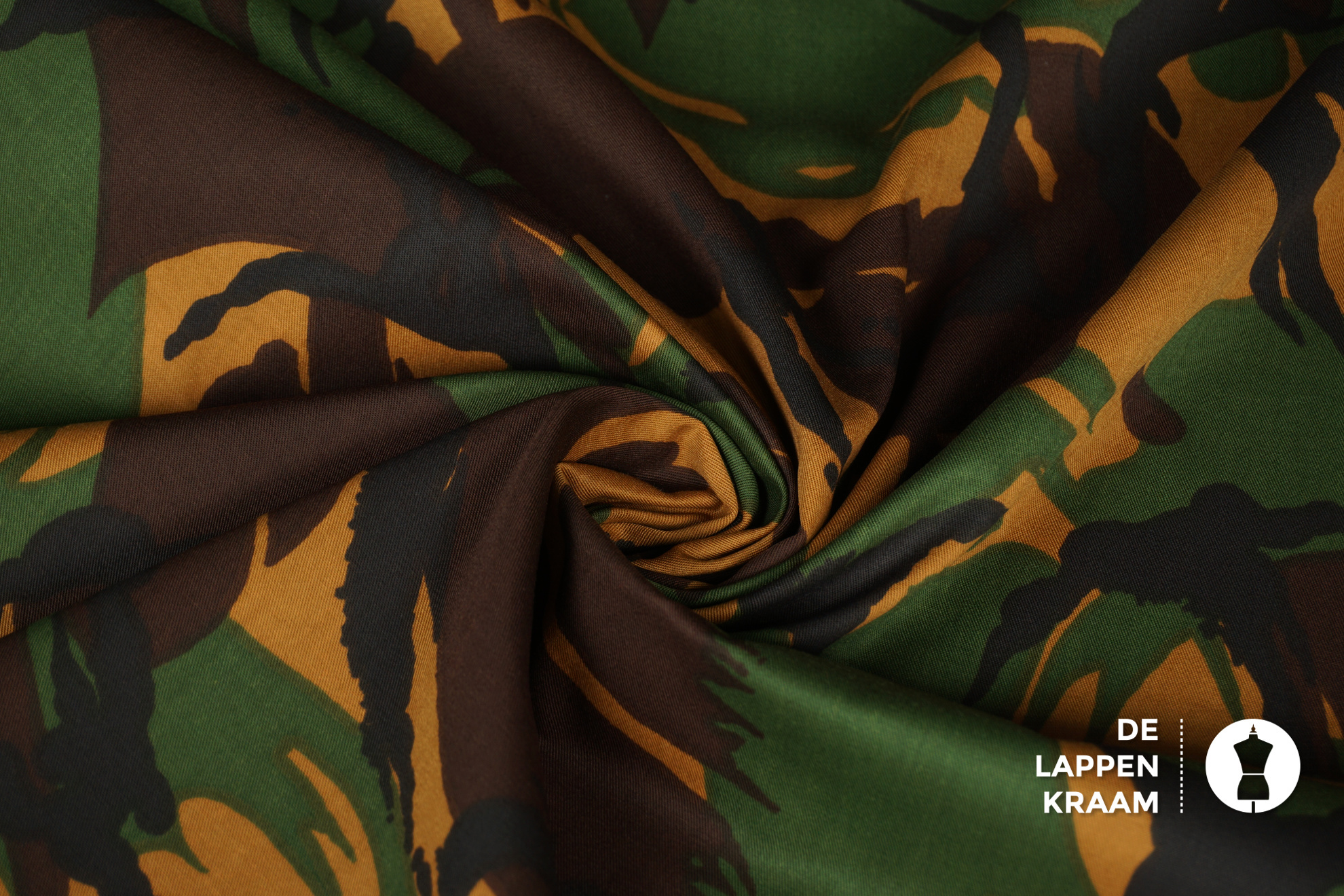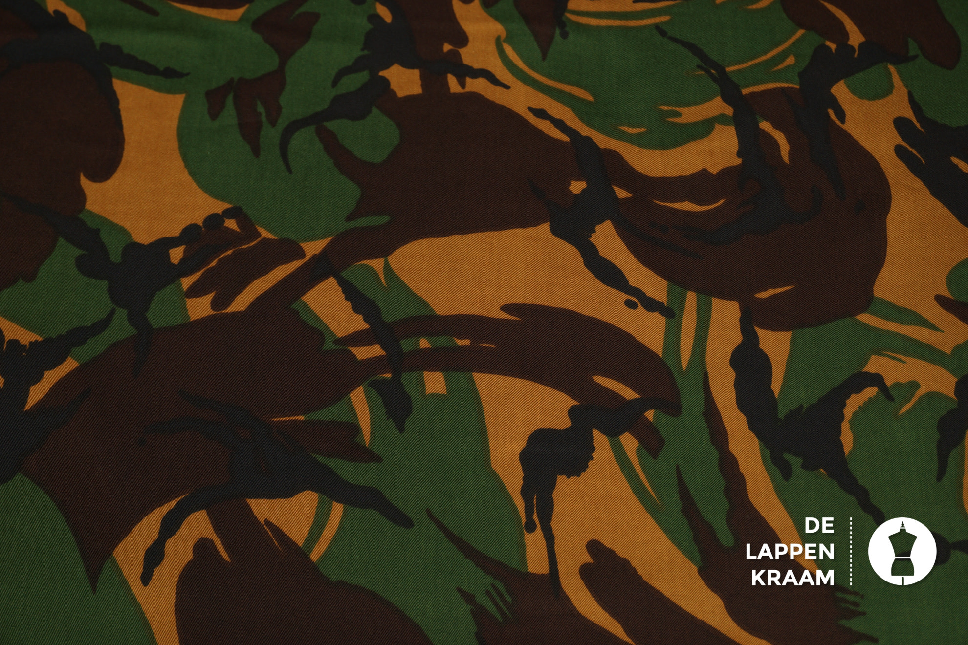Deze stof van 100% katoen is geweven in een stevige binding waardoor de stof ijzersterk is. De stof heeft een legerprint in caramel met legergroen en bruin.... Lees meer