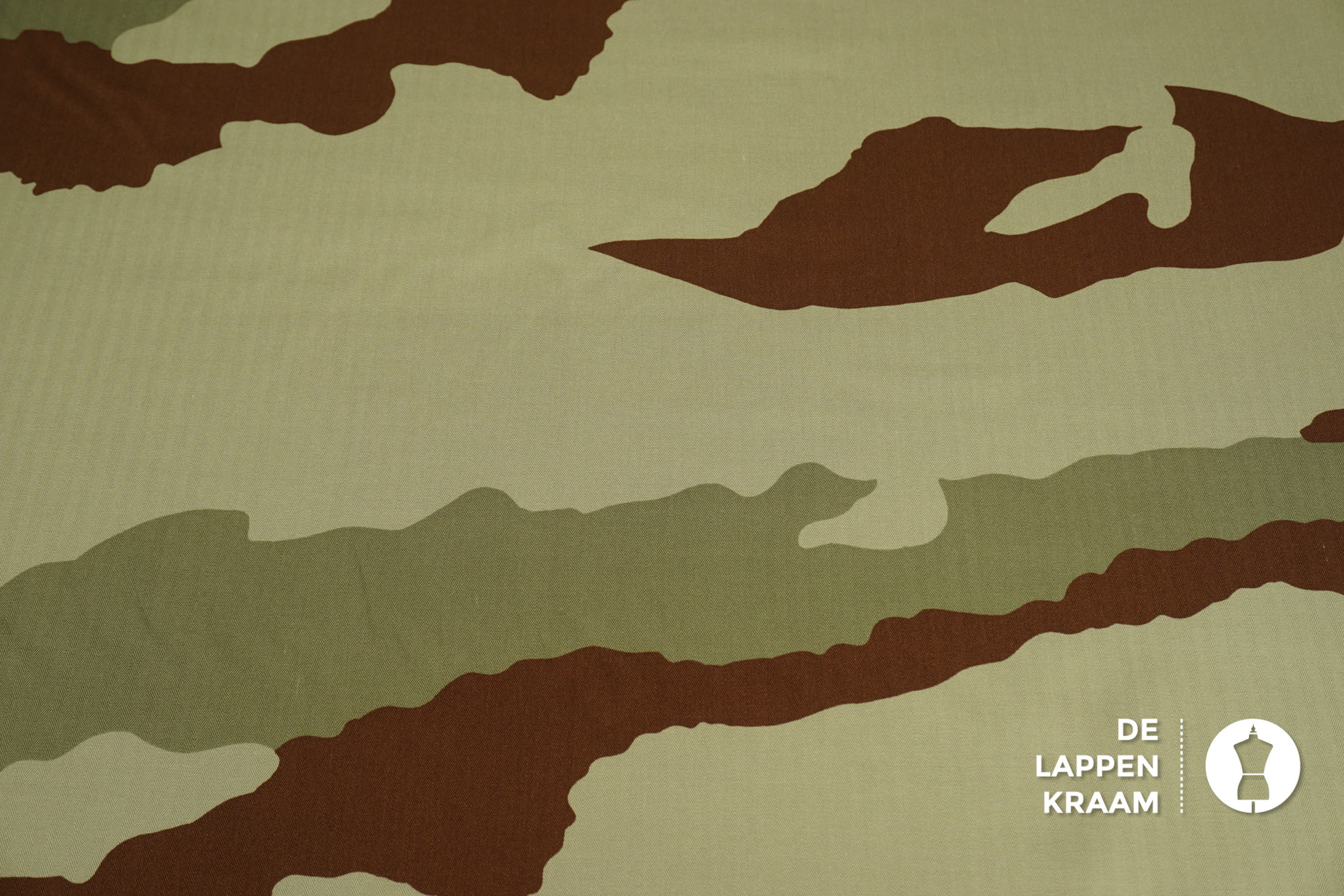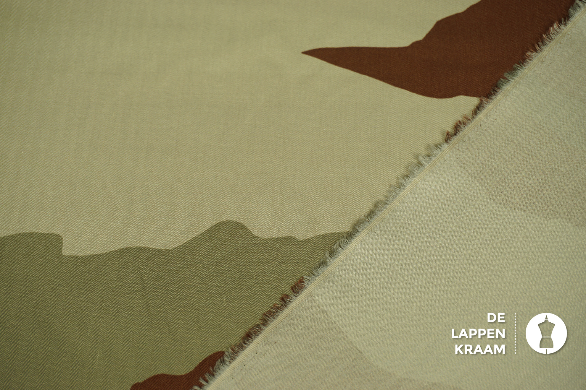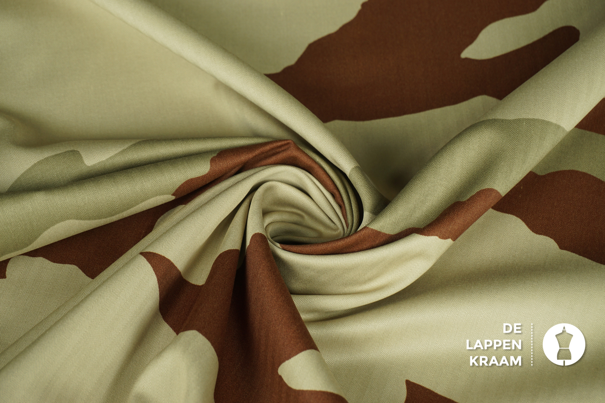 Deze stof van 100% katoen is geweven in een stevige binding waardoor de stof ijzersterk is. De stof heeft een legerprint in lichte groentinten met bruin.... Lees meer