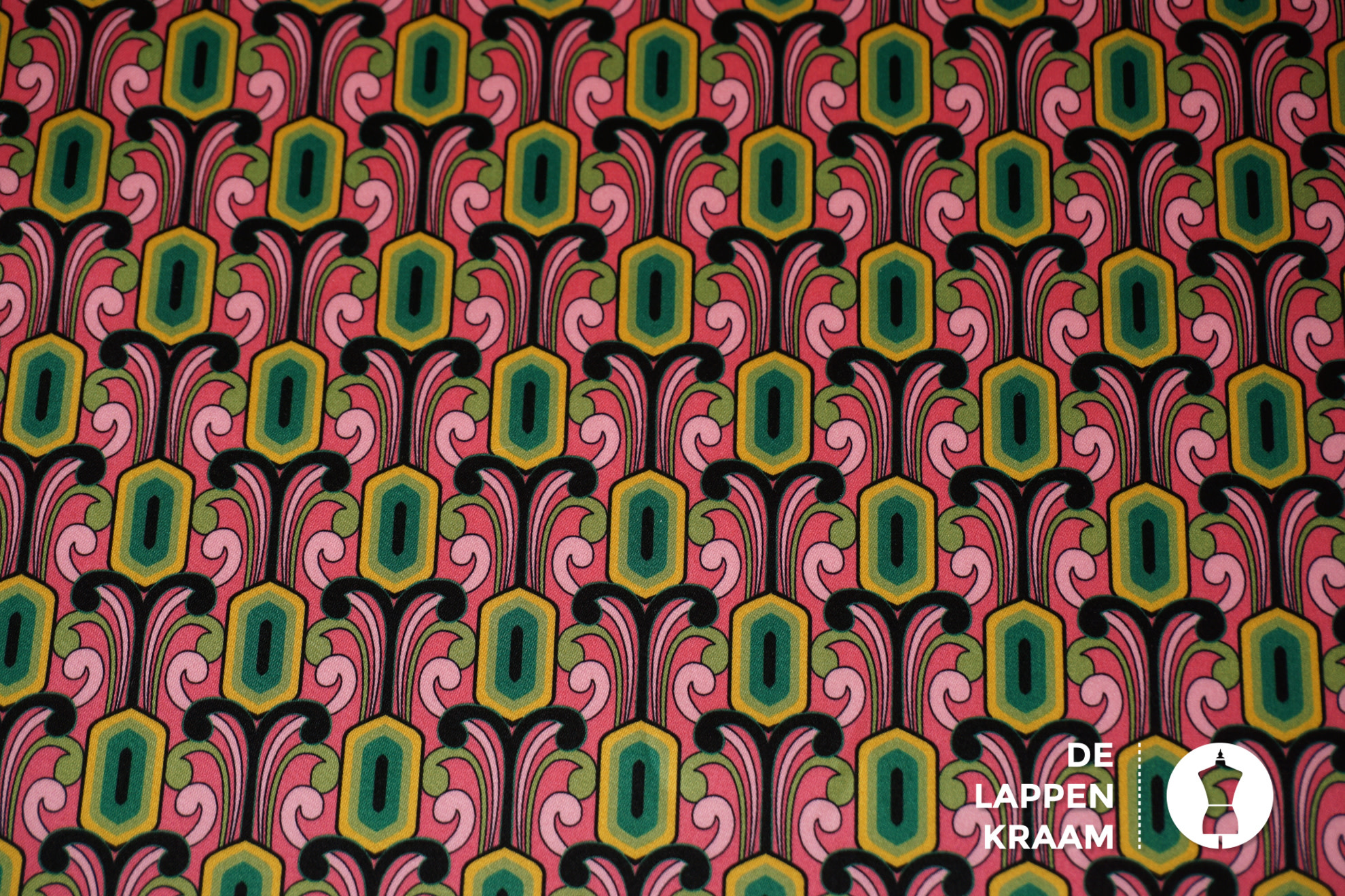 Stretch satijn stof roze met groene retroprint