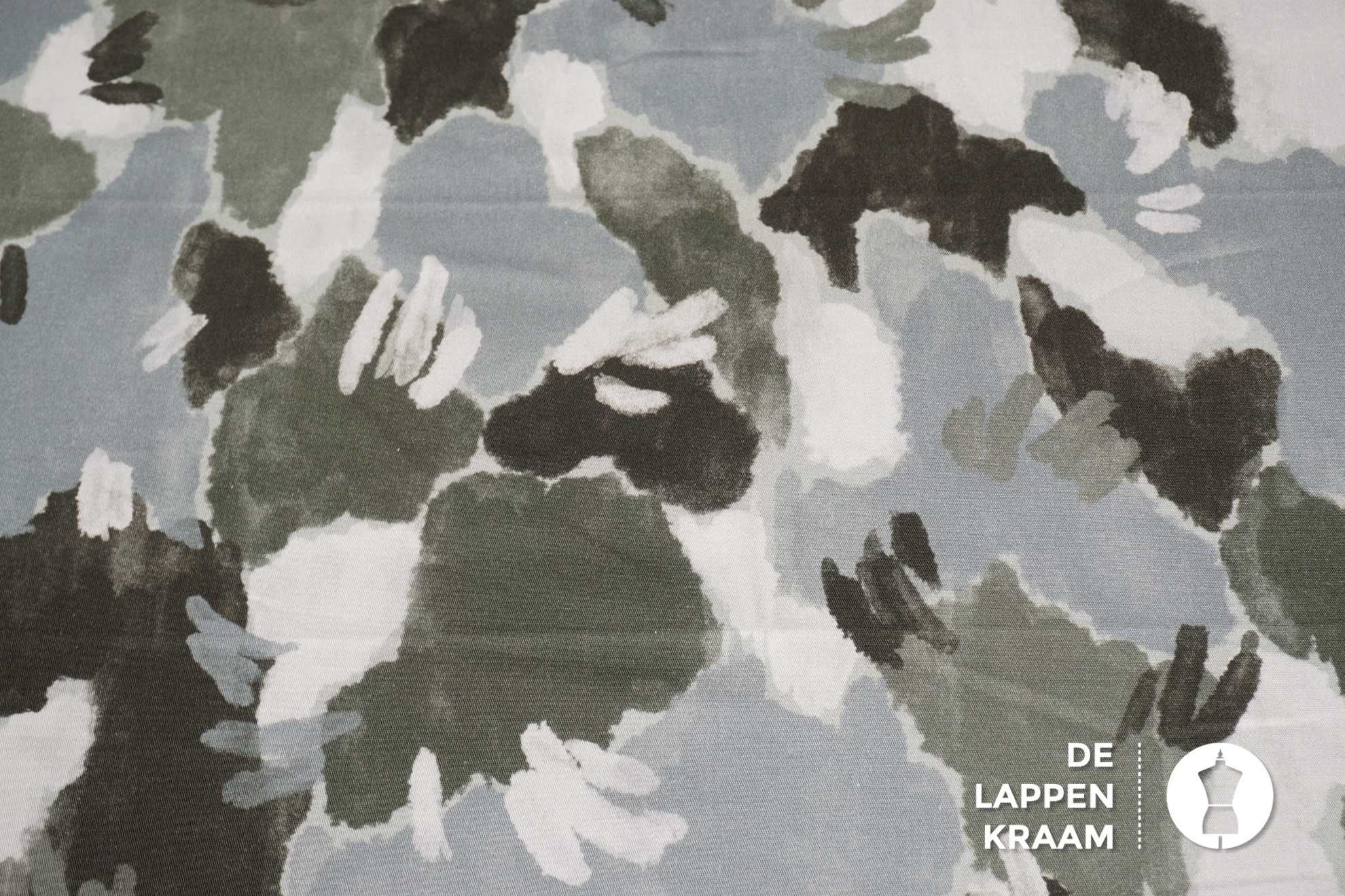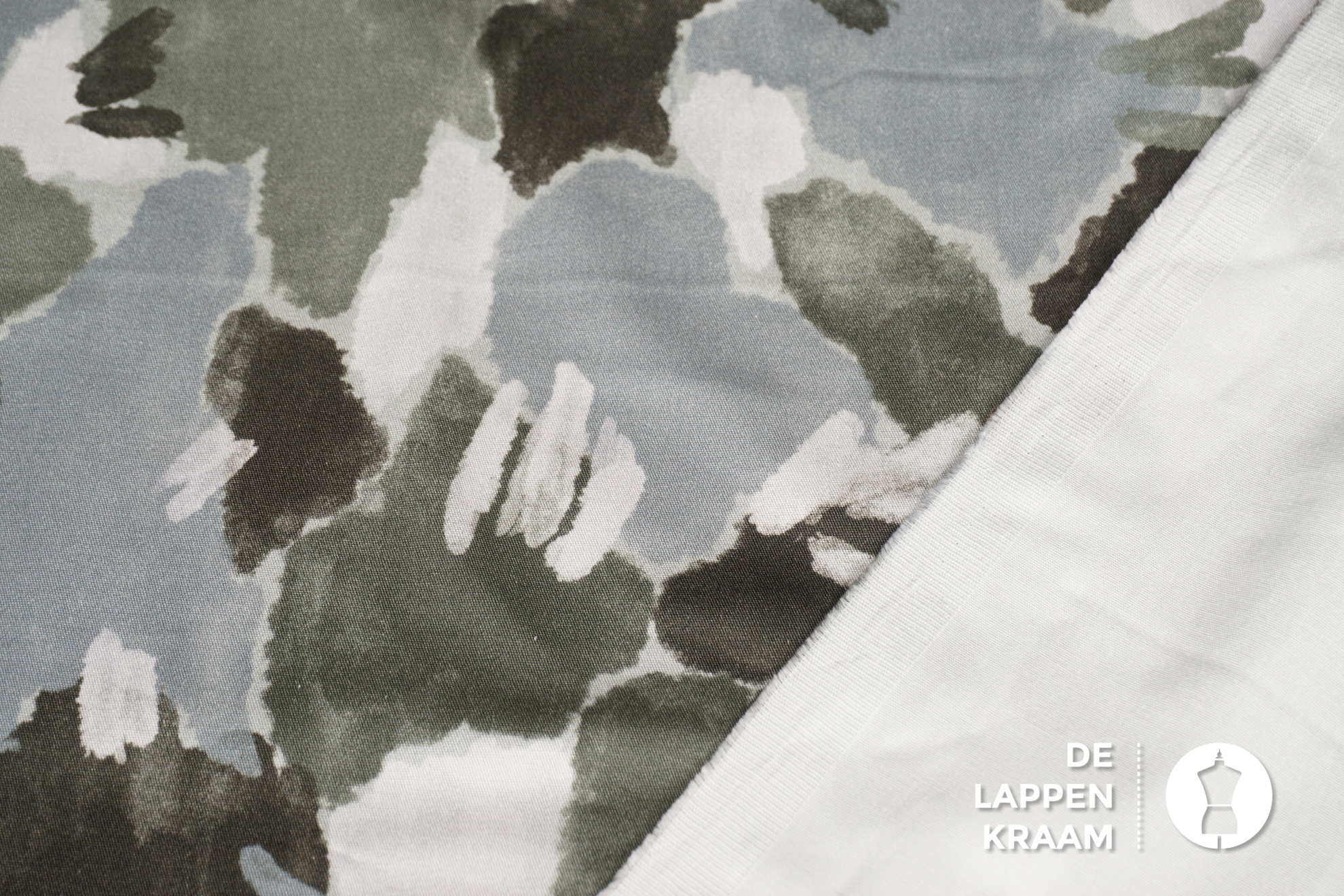 Stretchkatoen in een dessin van een soort geschilderde vlakken in grijs- en groentinten. Lees meer