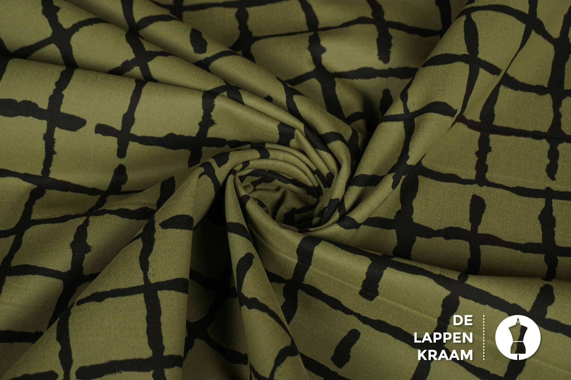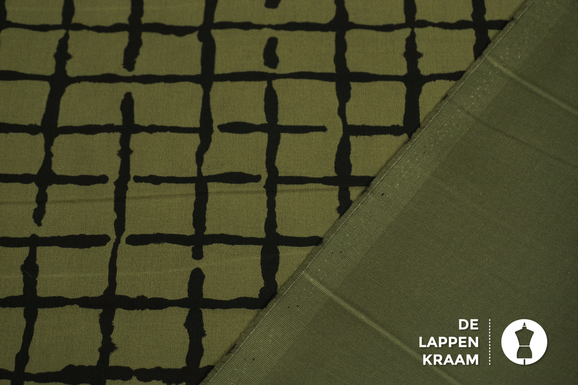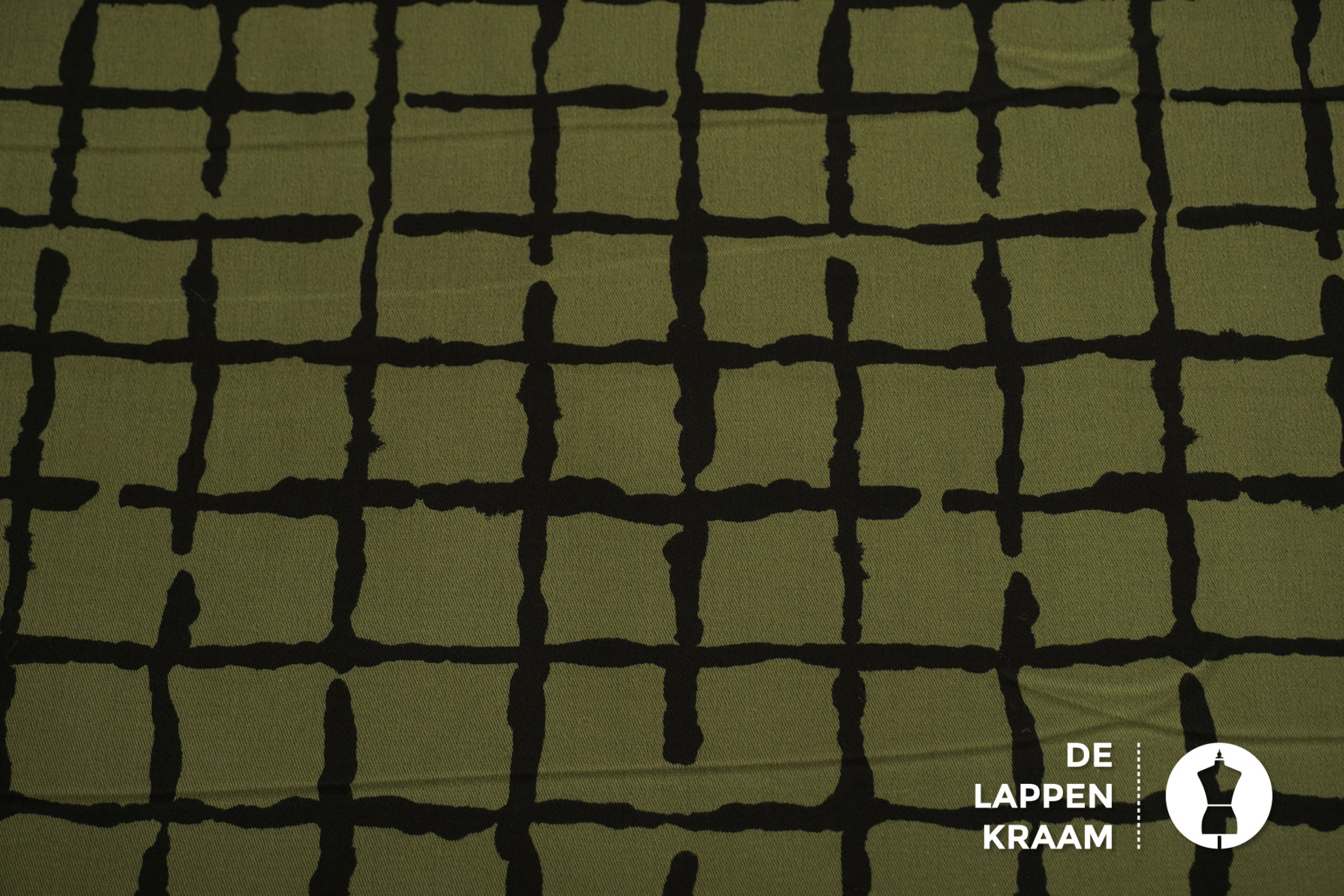 Stretchkatoen in legergroen met een print van oneffen strepen in het zwart, die een ruitvorm vormen. Lees meer