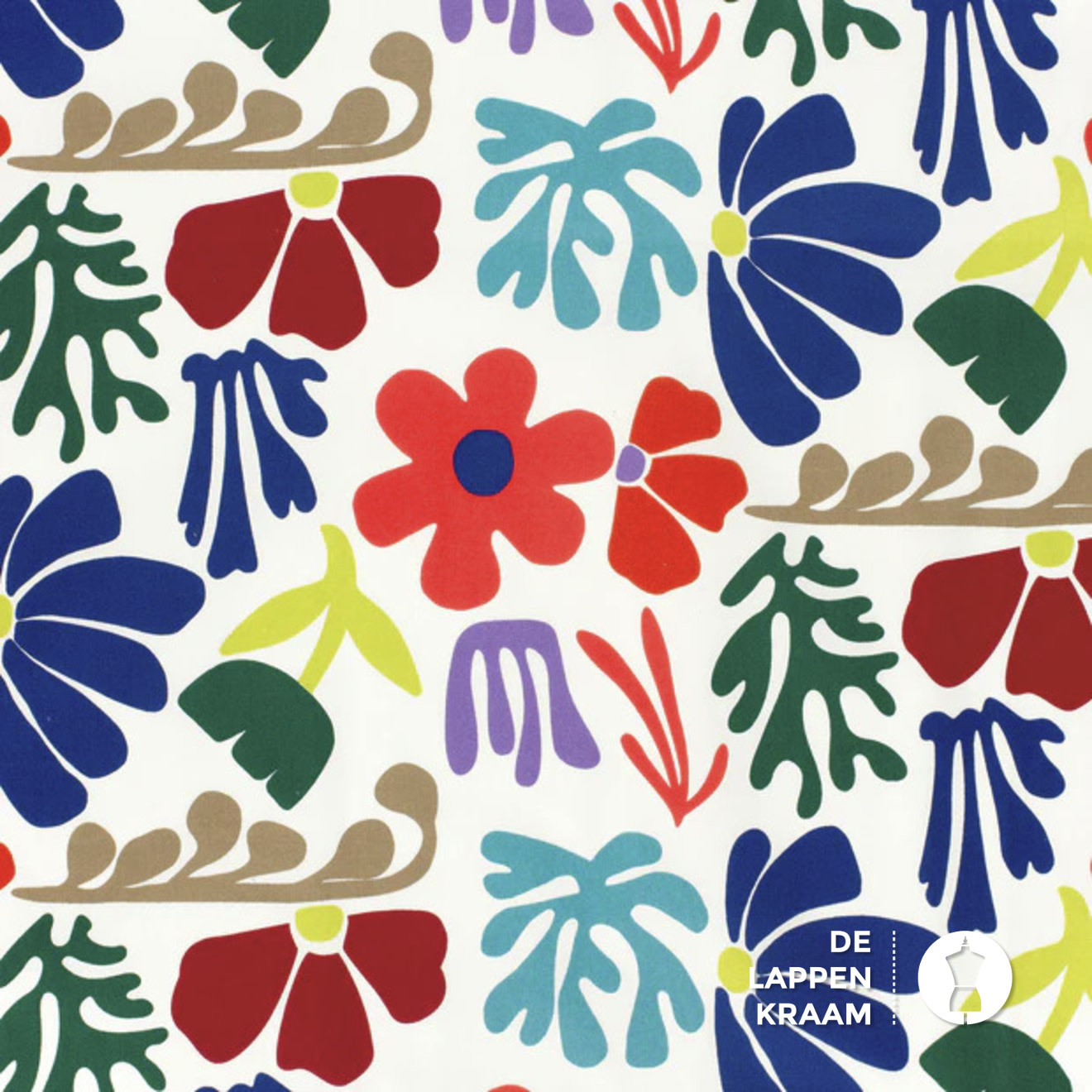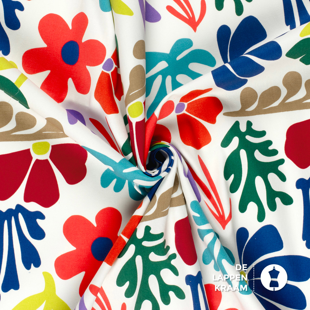 Door de satijnbinding is een subtiele glans ontstaan en voelt de stof heel zacht aan de ondergrond is off-white en de print heeft felle basiskleuren. Leuk voor een rok, broek of jasje.... Lees meer