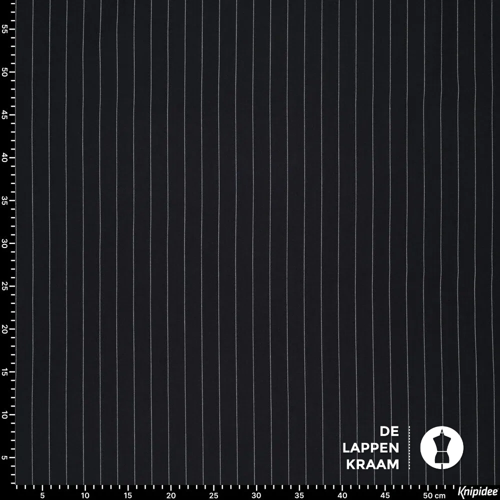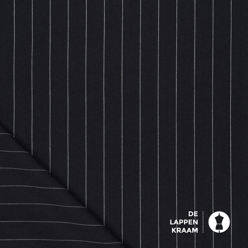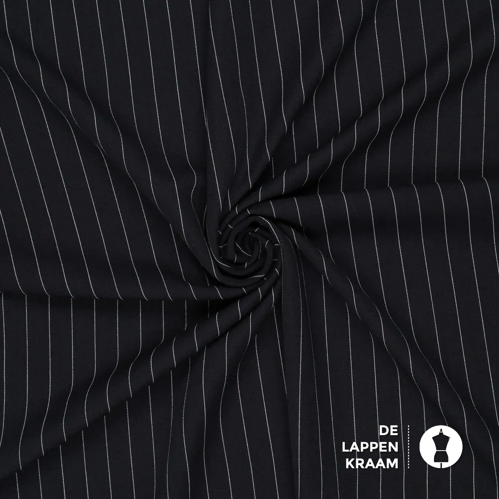 Een heerlijk stofje met stretch in het donkerblauw met een krijtstreepje over de lengte van de stof. De geweven stof heeft een lichte rek in de breedte.... Lees meer