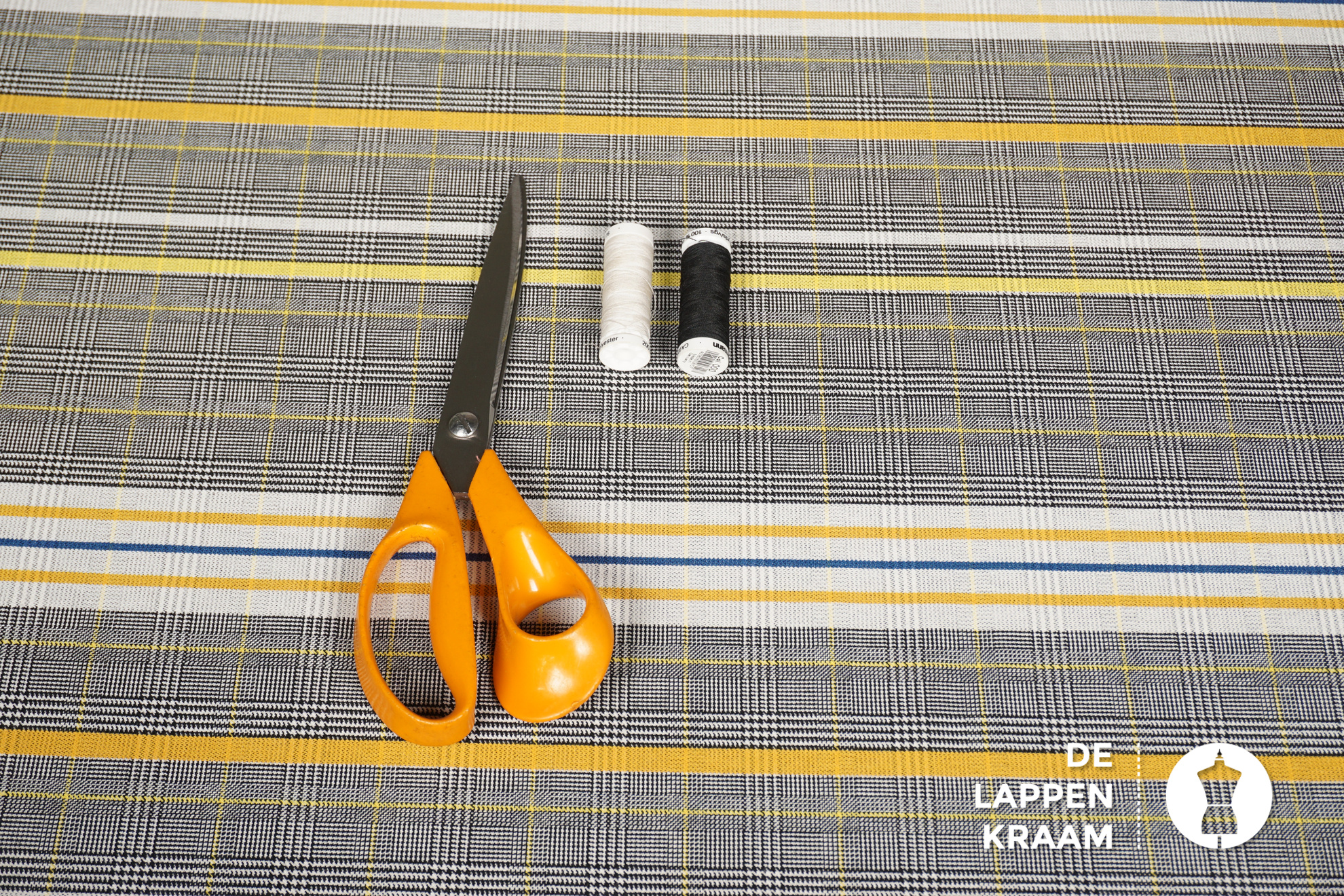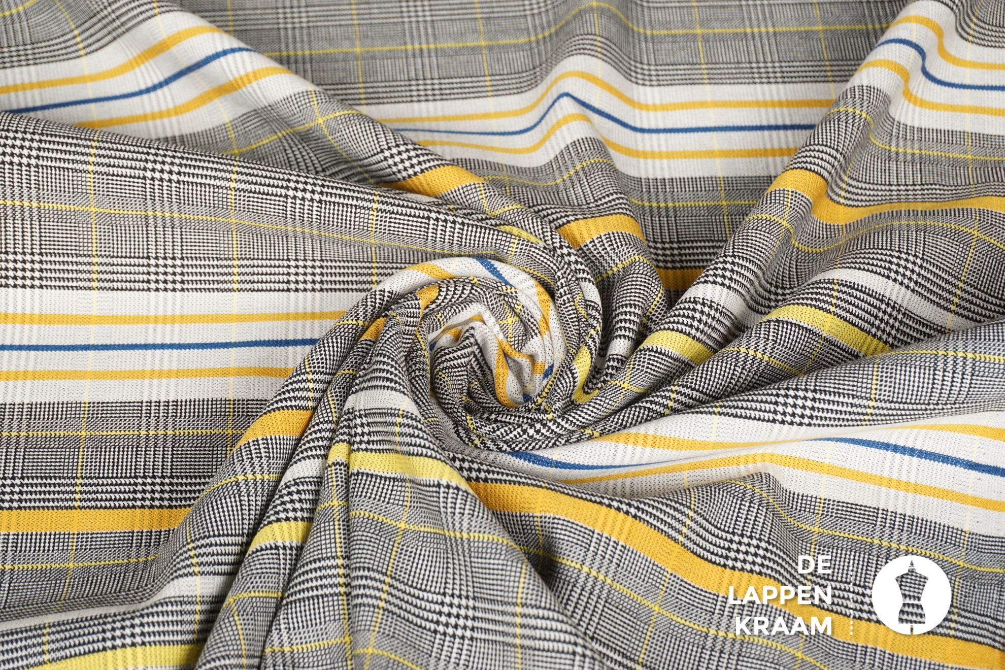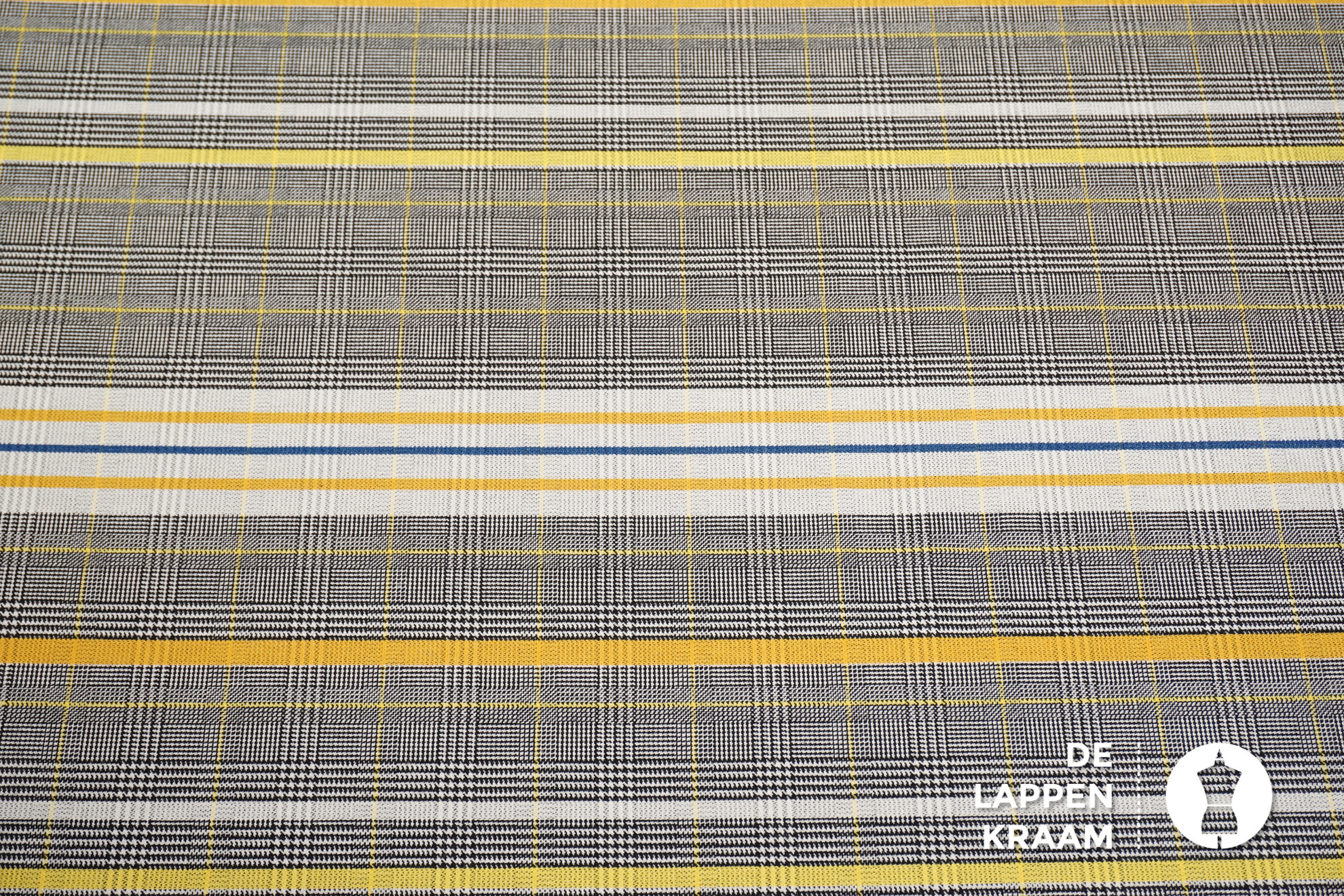 Geweven stof in een geel met grijze prince de galles ruit. Over de breedte van de stof lopen dikkere strepen in geel, wit en blauw.... Lees meer