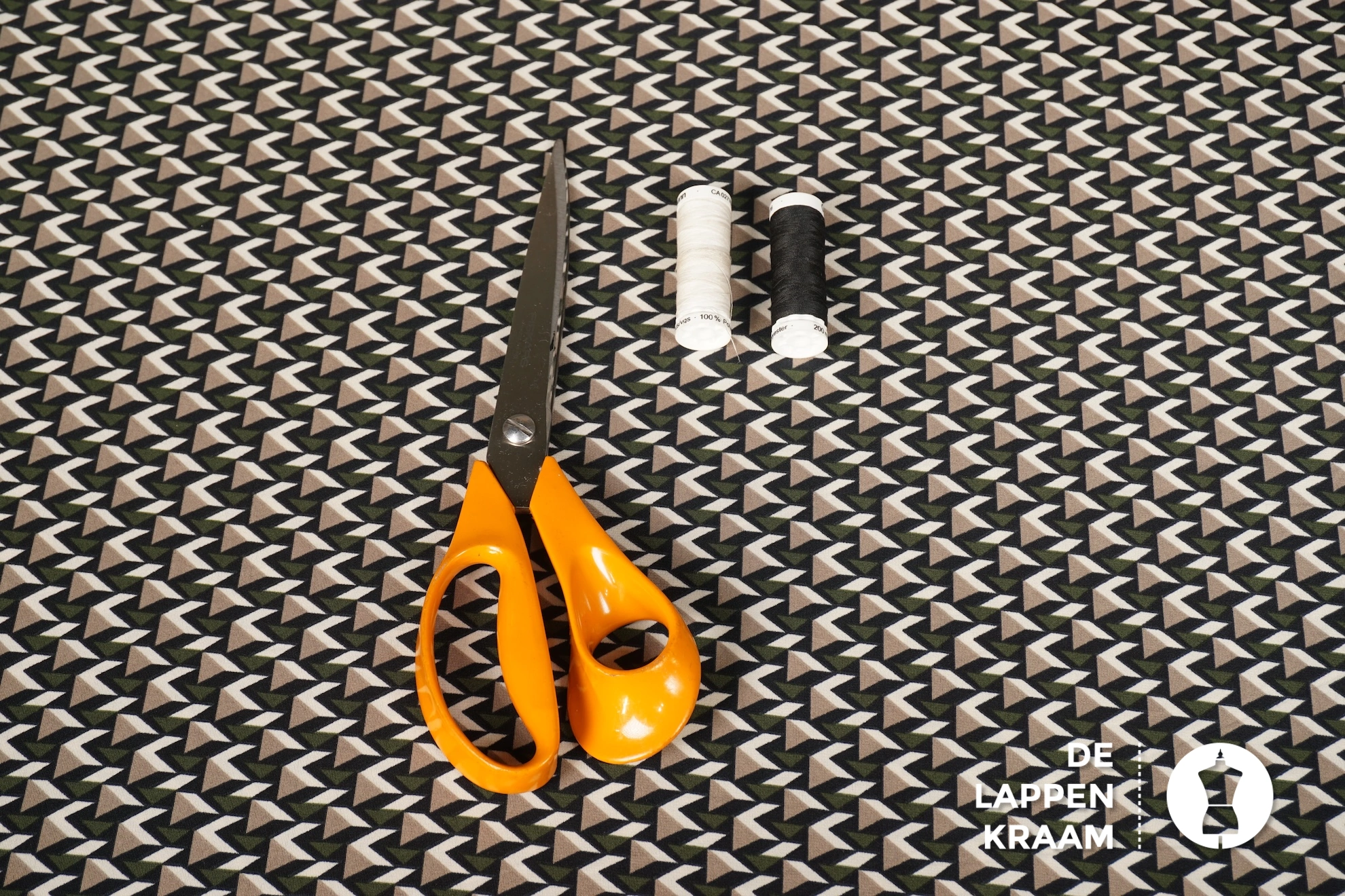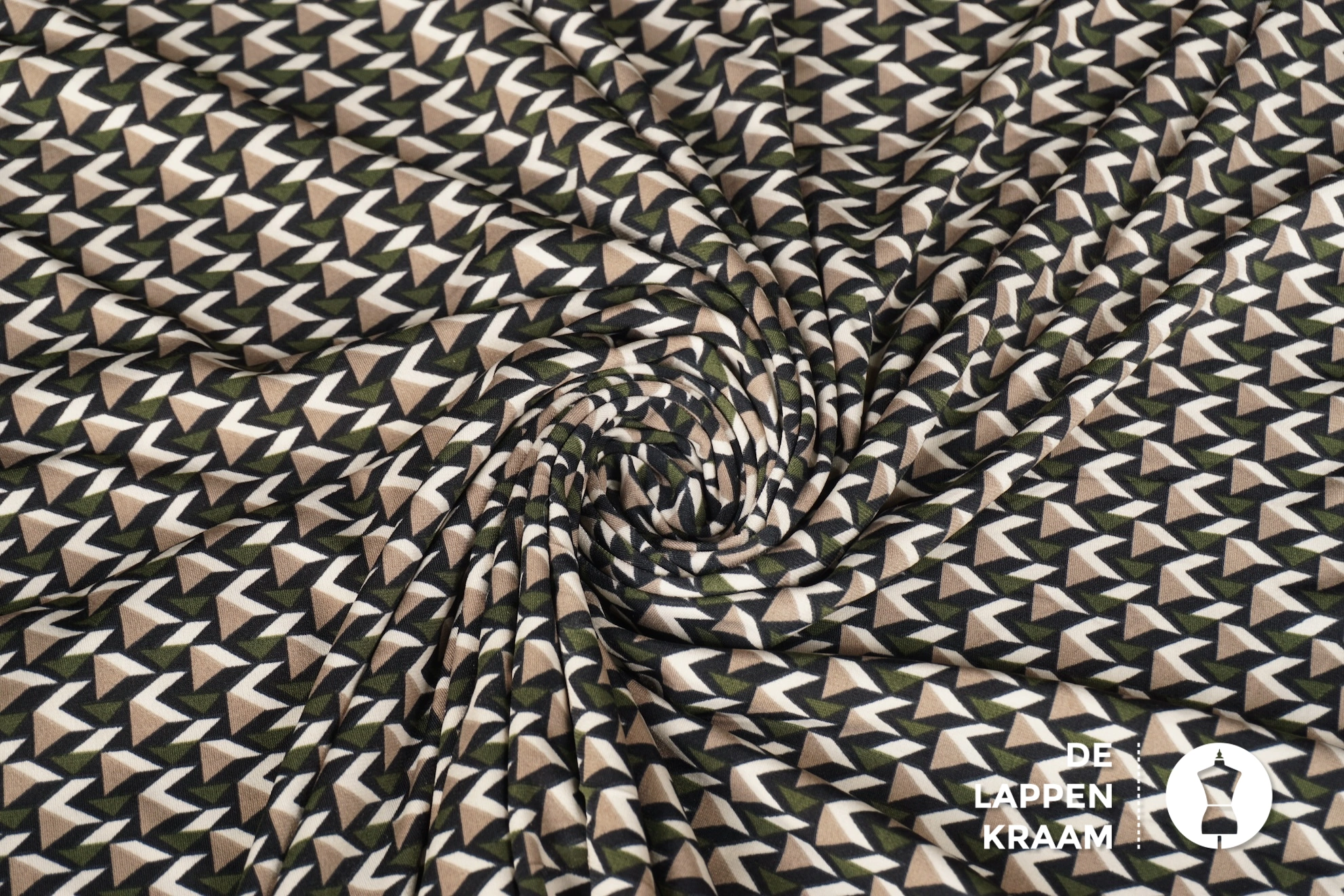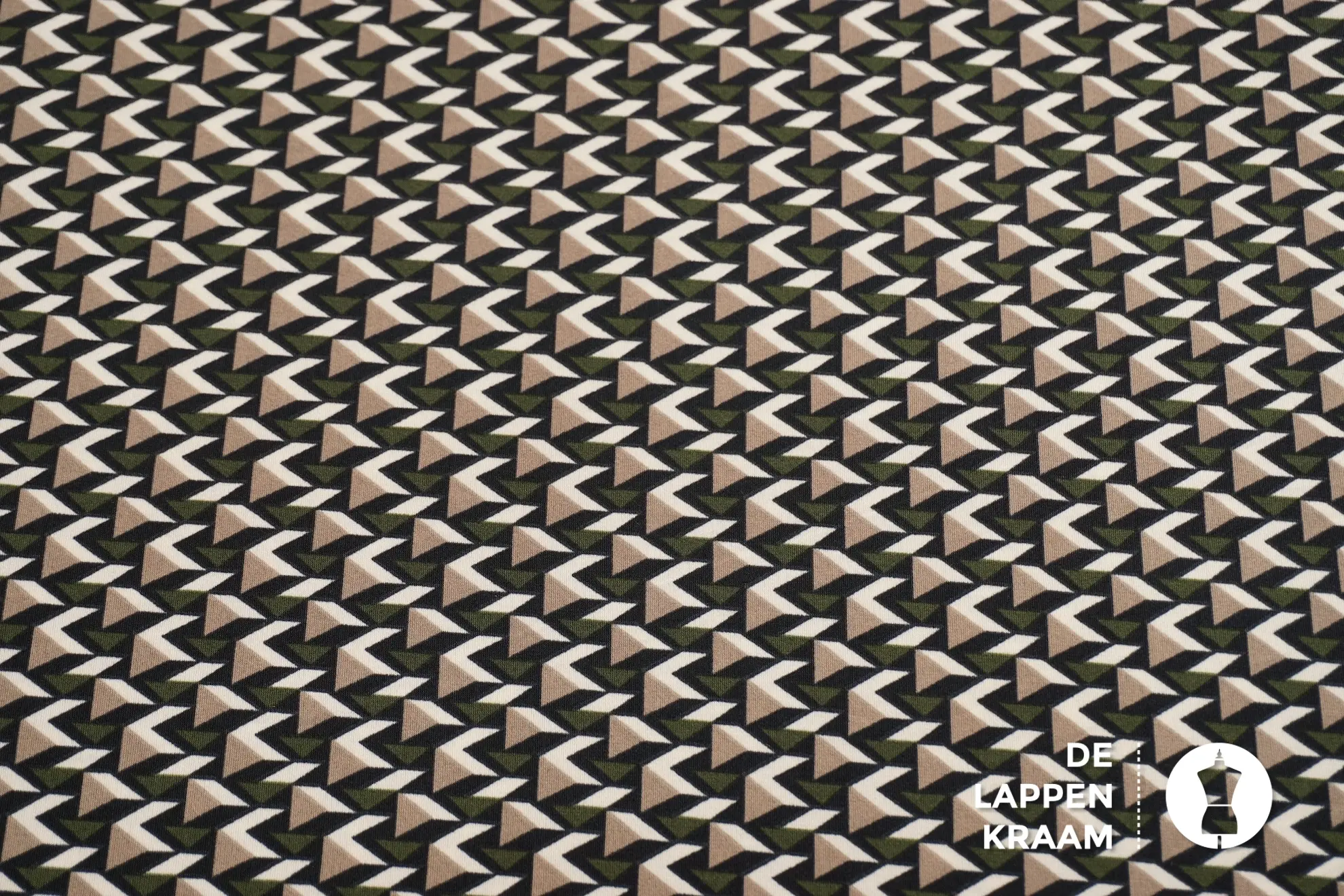 Black Friday Travelstof met dessin van driehoekjes in zwart, ecru en groen