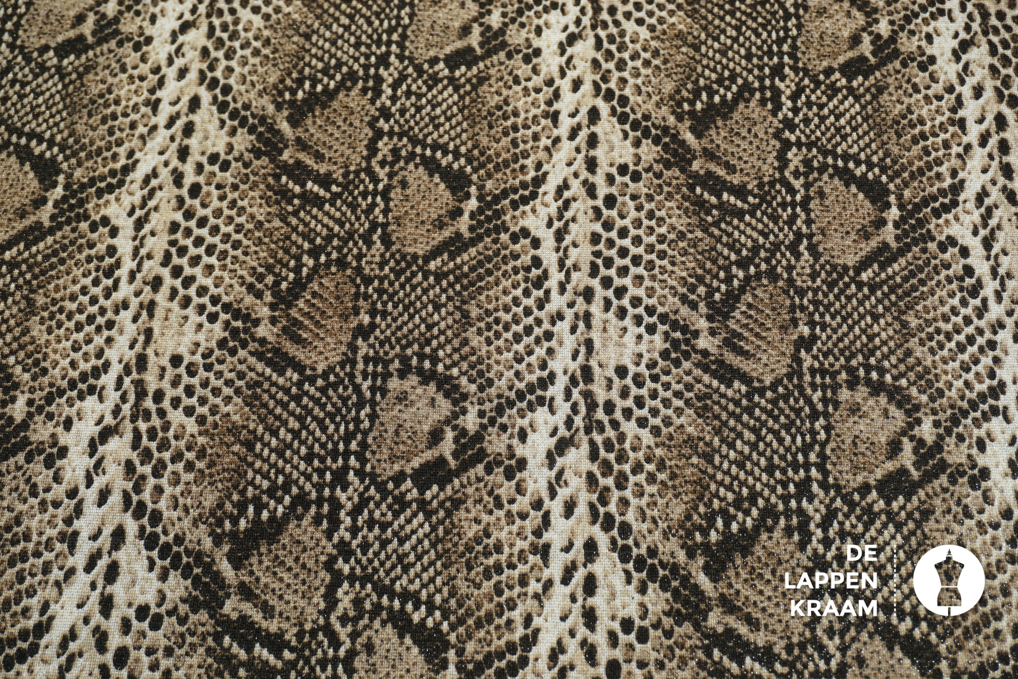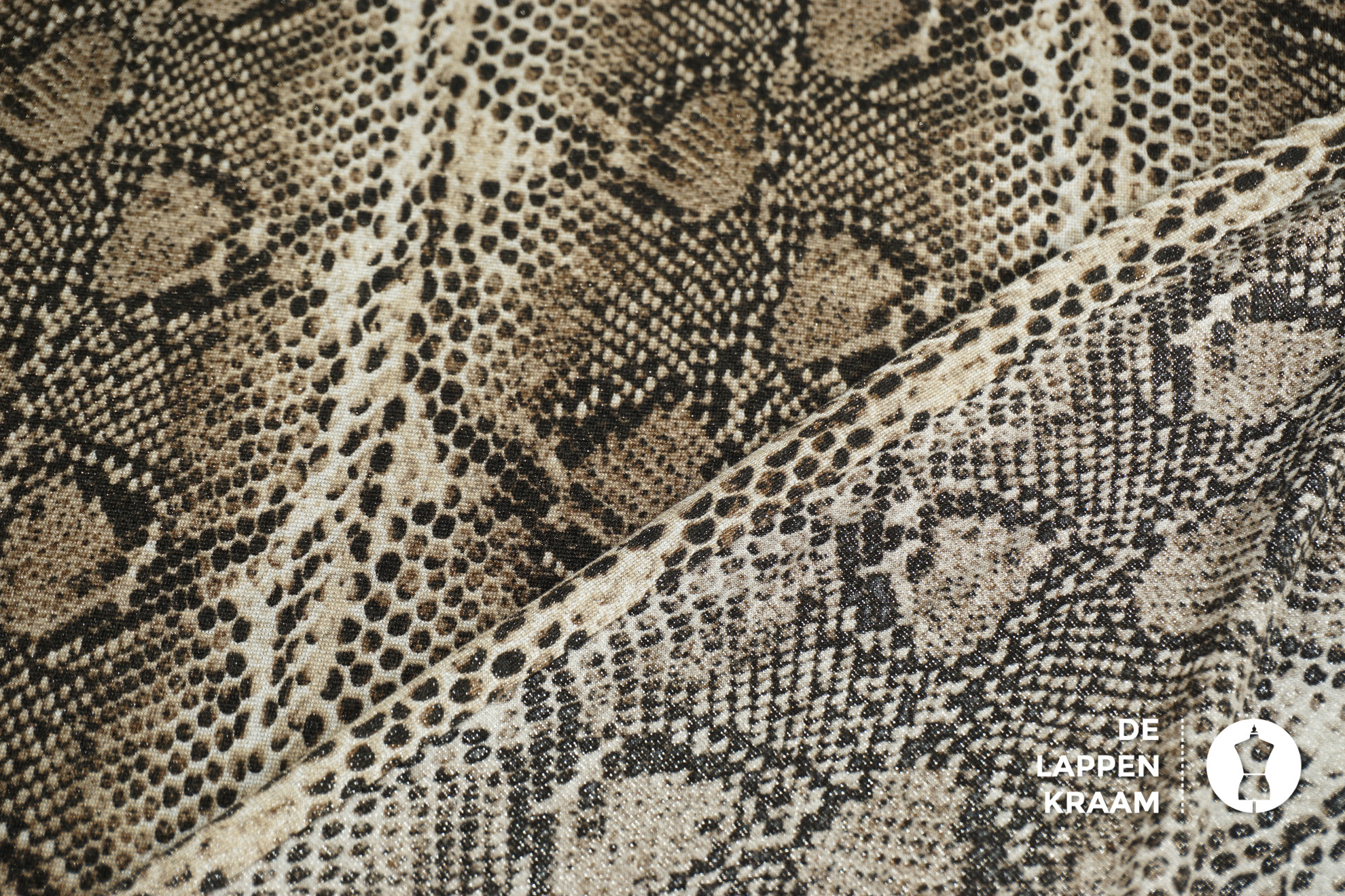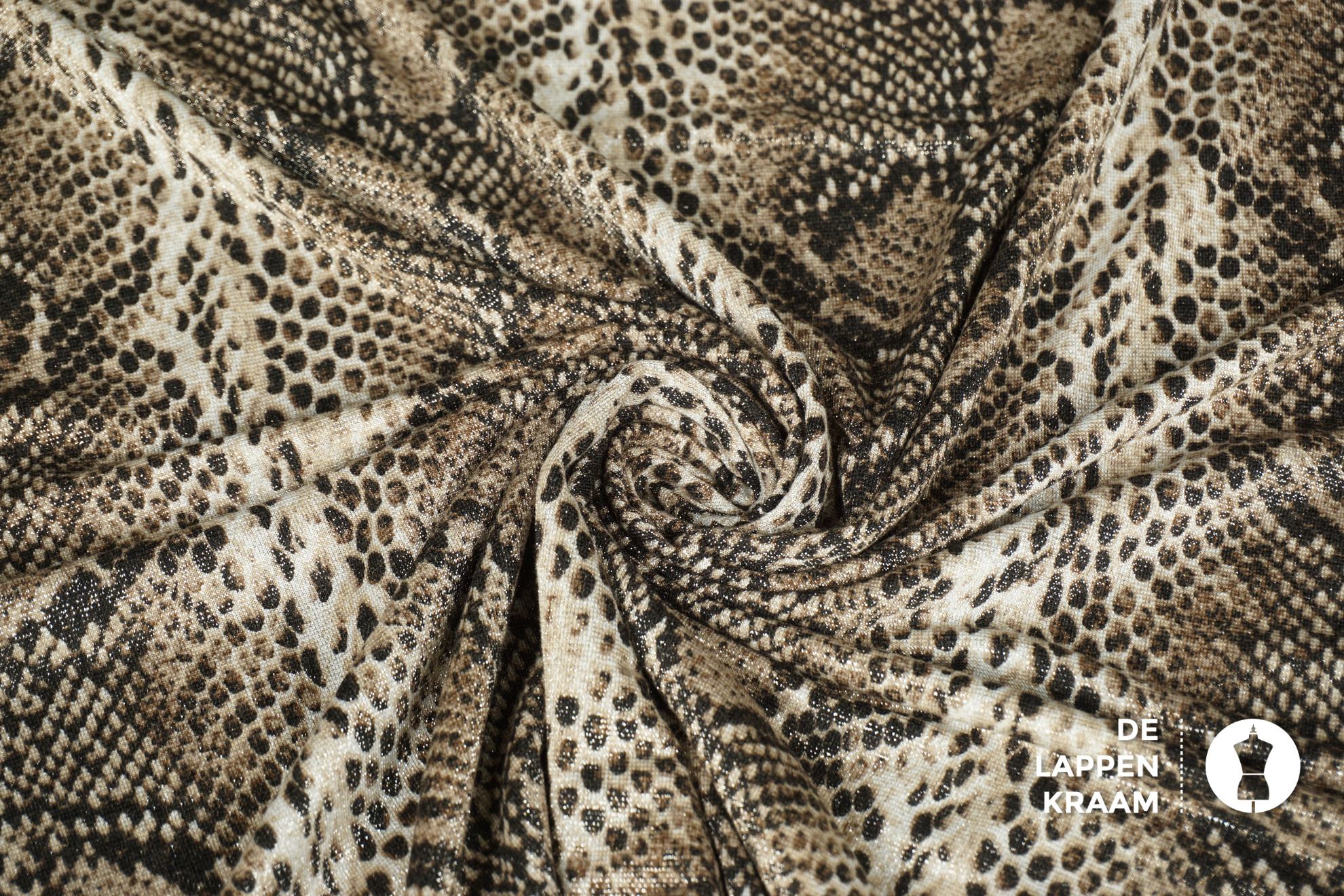 Een hele dunne, soepele tricot in een slangenprint in beigetinten. Door de stof zijn lurexdraden gebreid, waardoor de stof flink glittert.... Lees meer