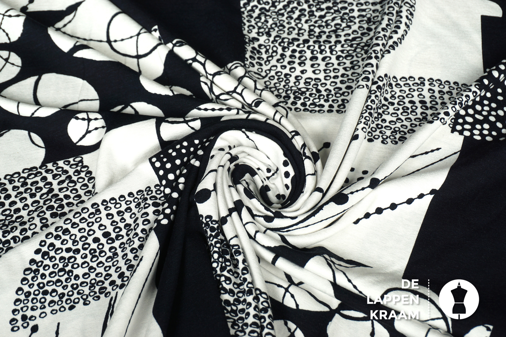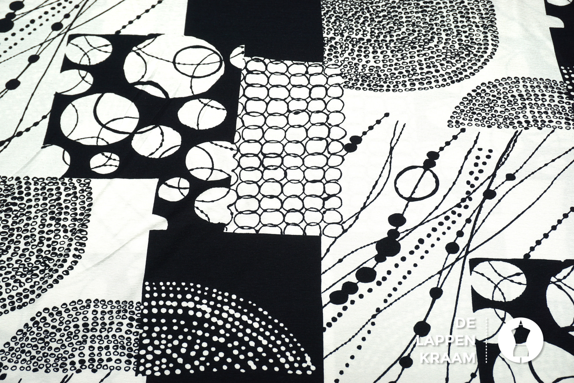 Viscose tricot in een abstracte zwart wit print van allerlei vormen, maar vooral gebaseerd op cirkels. Heerlijk zacht en een lekkere rek in zowel de lengte als de breedte.... Lees meer