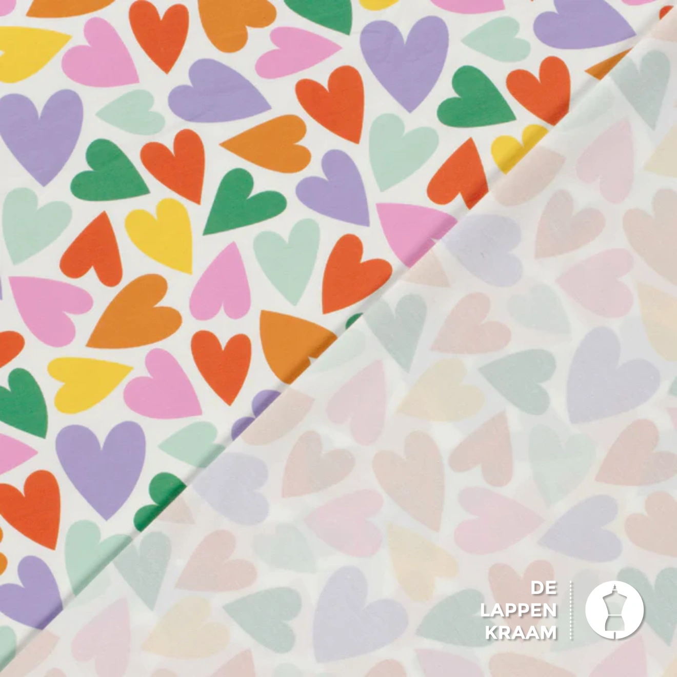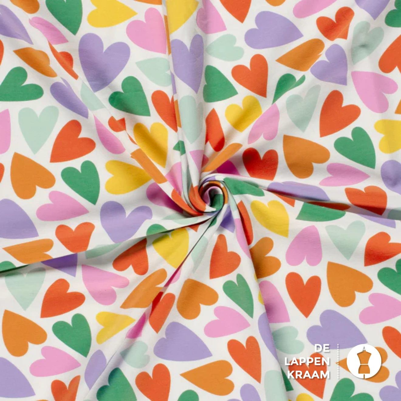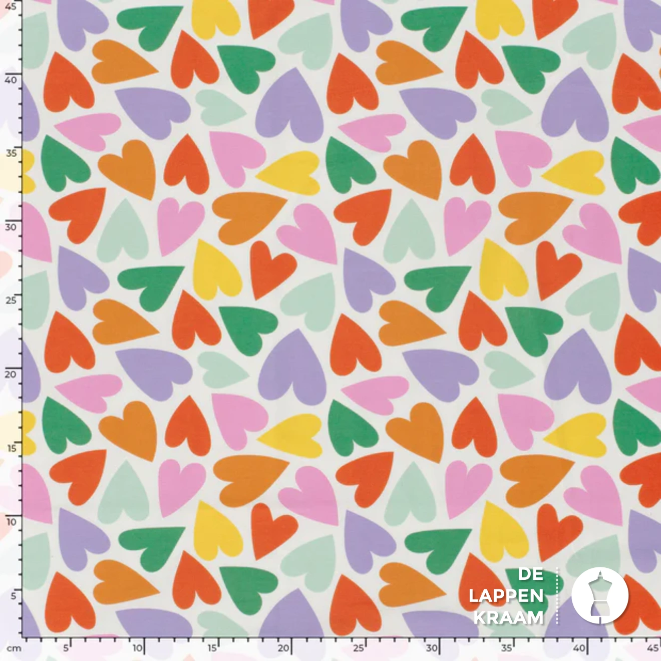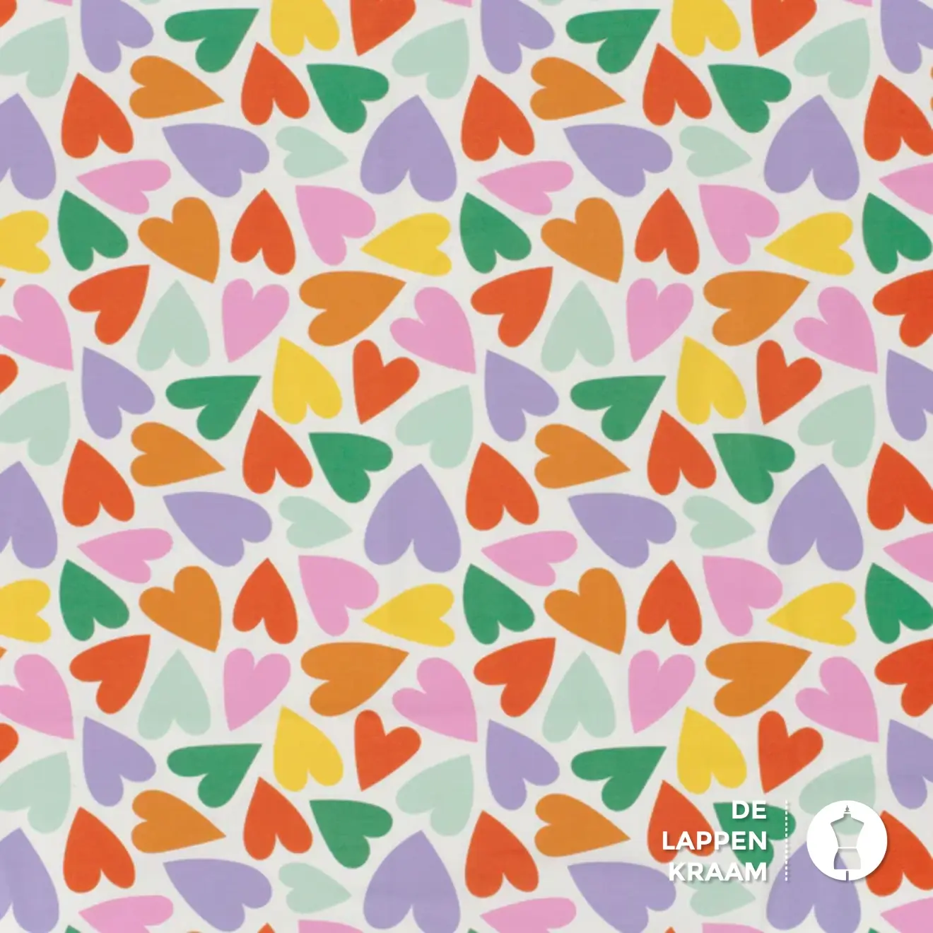 Katoenen tricot in het wit, met een printje van kleurrijke hartjes zoals oranje, groen, paars en roze. Lees meer