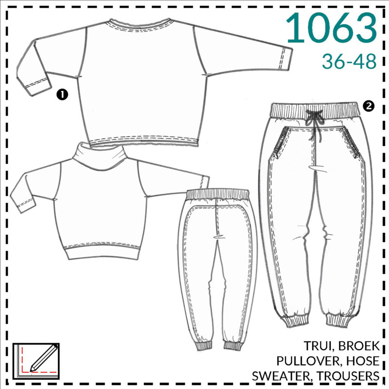 Joggingpak met oversized sweater, met of zonder kol. Te maken in maat 36 - 48 in moeilijkheidsgraad 1 en 2: makkelijk en beetje ervaring....