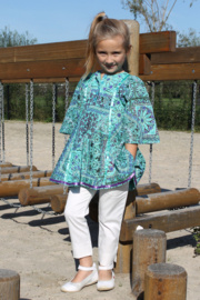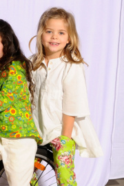 Tuniek met wijde mouw en een stukje gesmockt en een smalle broek met deelnaden Lees meer