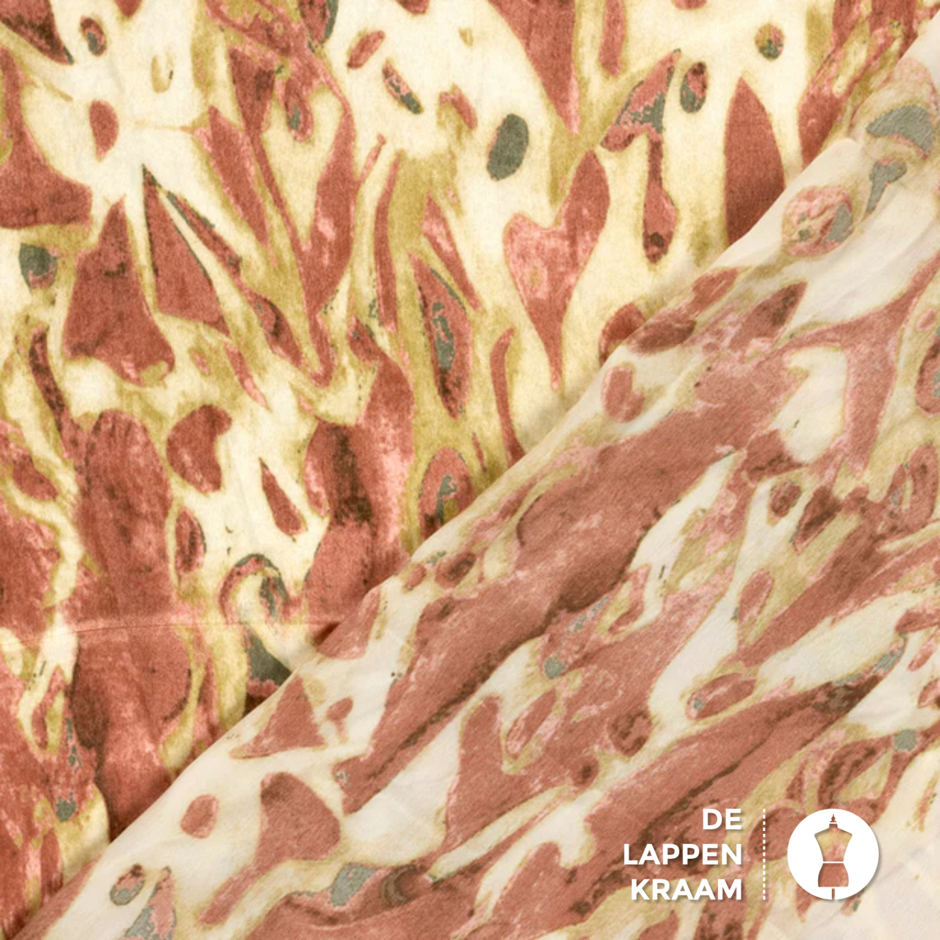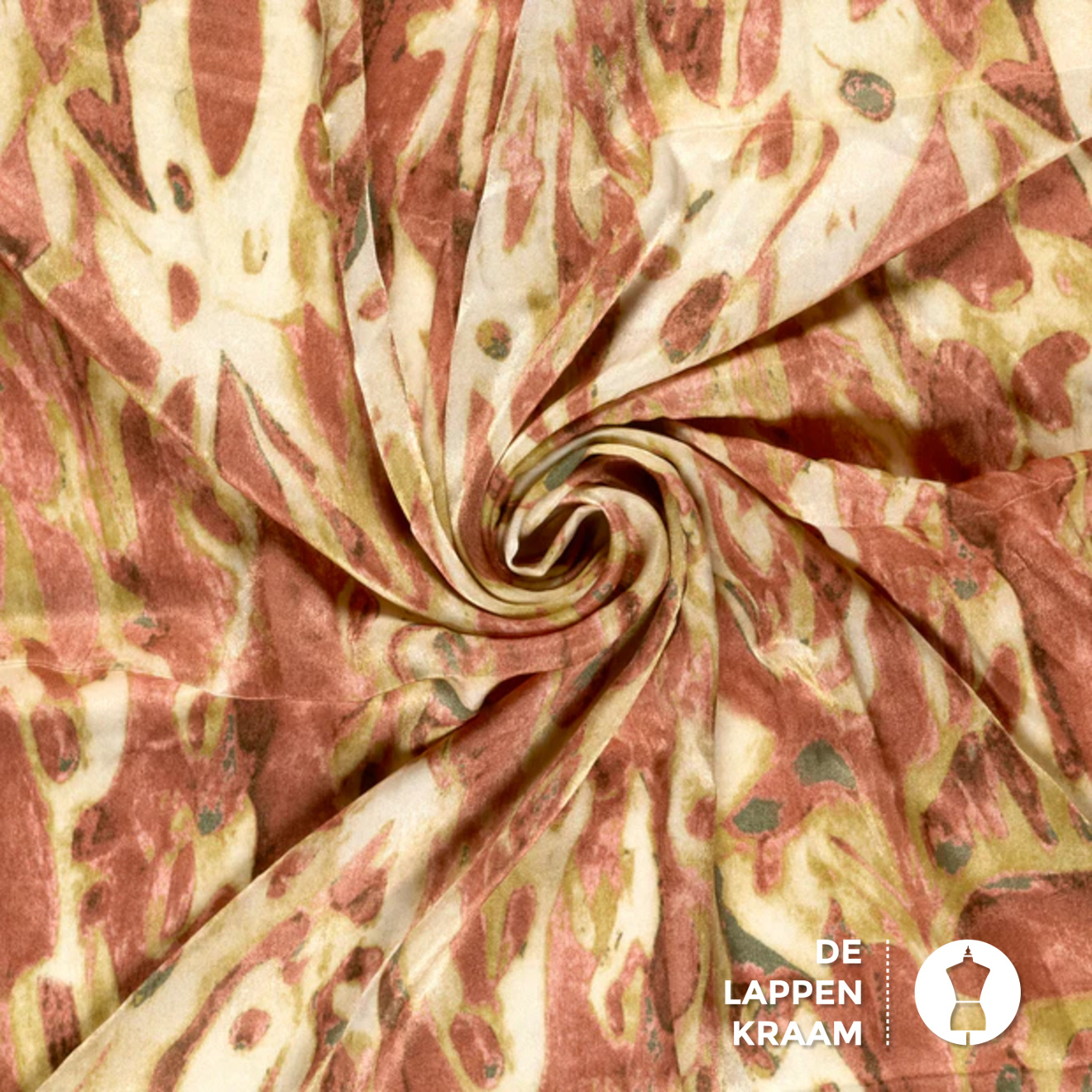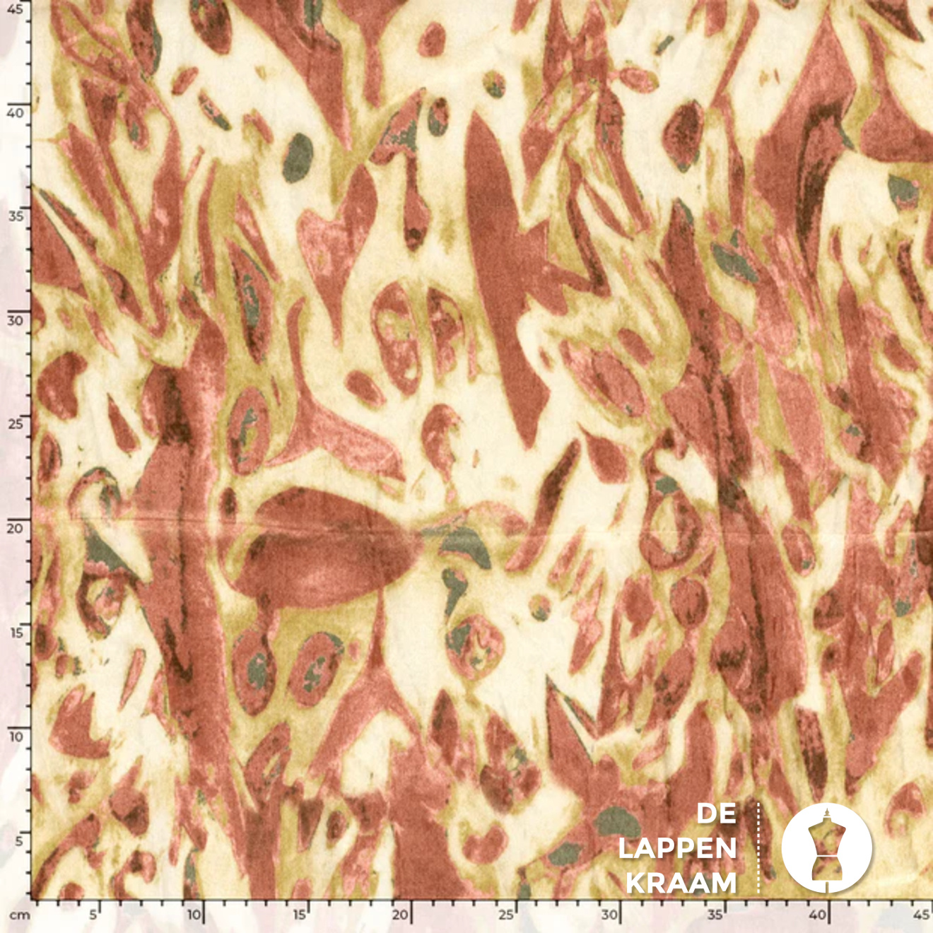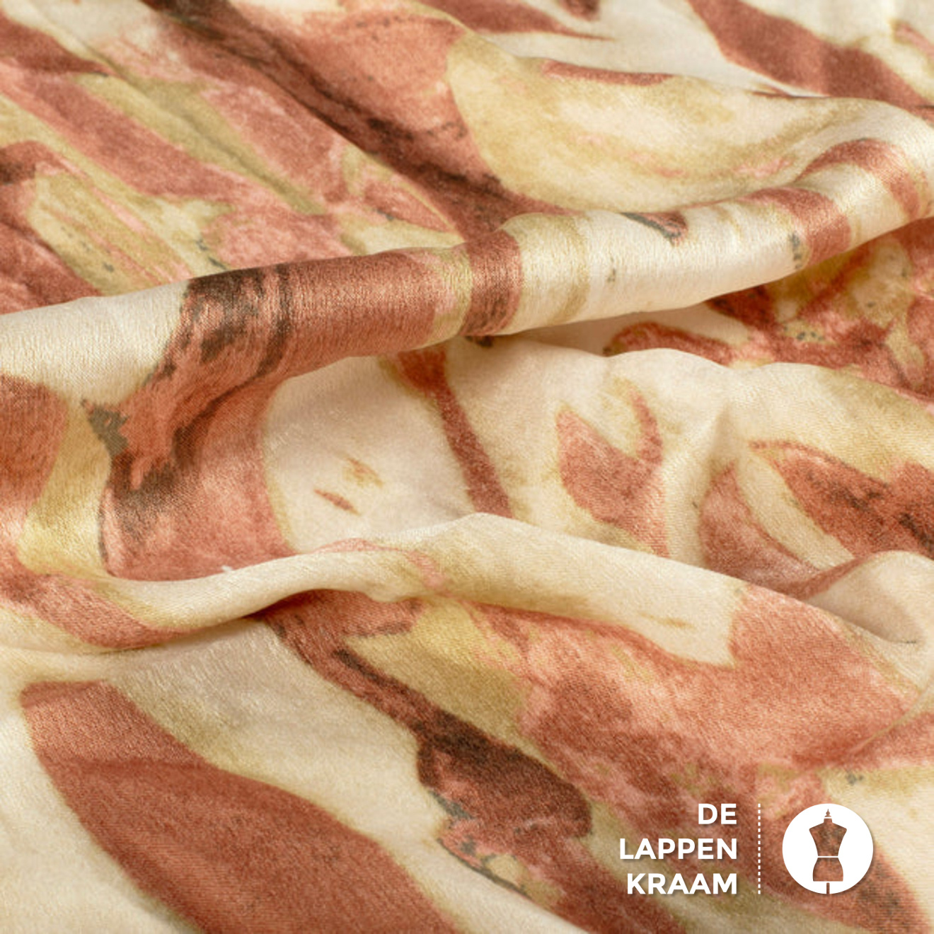 Deze stof is geweven in satijnbinding, maar is zo afgewerkt dat hij aanvoelt als fluweel. Daardoor is hij heerlijk soepel én voelt het lekker zacht aan. Het dessin bestaat uit vlekken in ecru, lindegroen en brique.... Lees meer