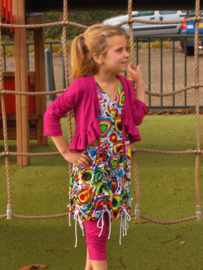 Vestje met een v hals, ruches langs de zoom en een striksluiting, een jurk met een v hals en tunnels op de deelnaden, en een basic legging... Lees meer