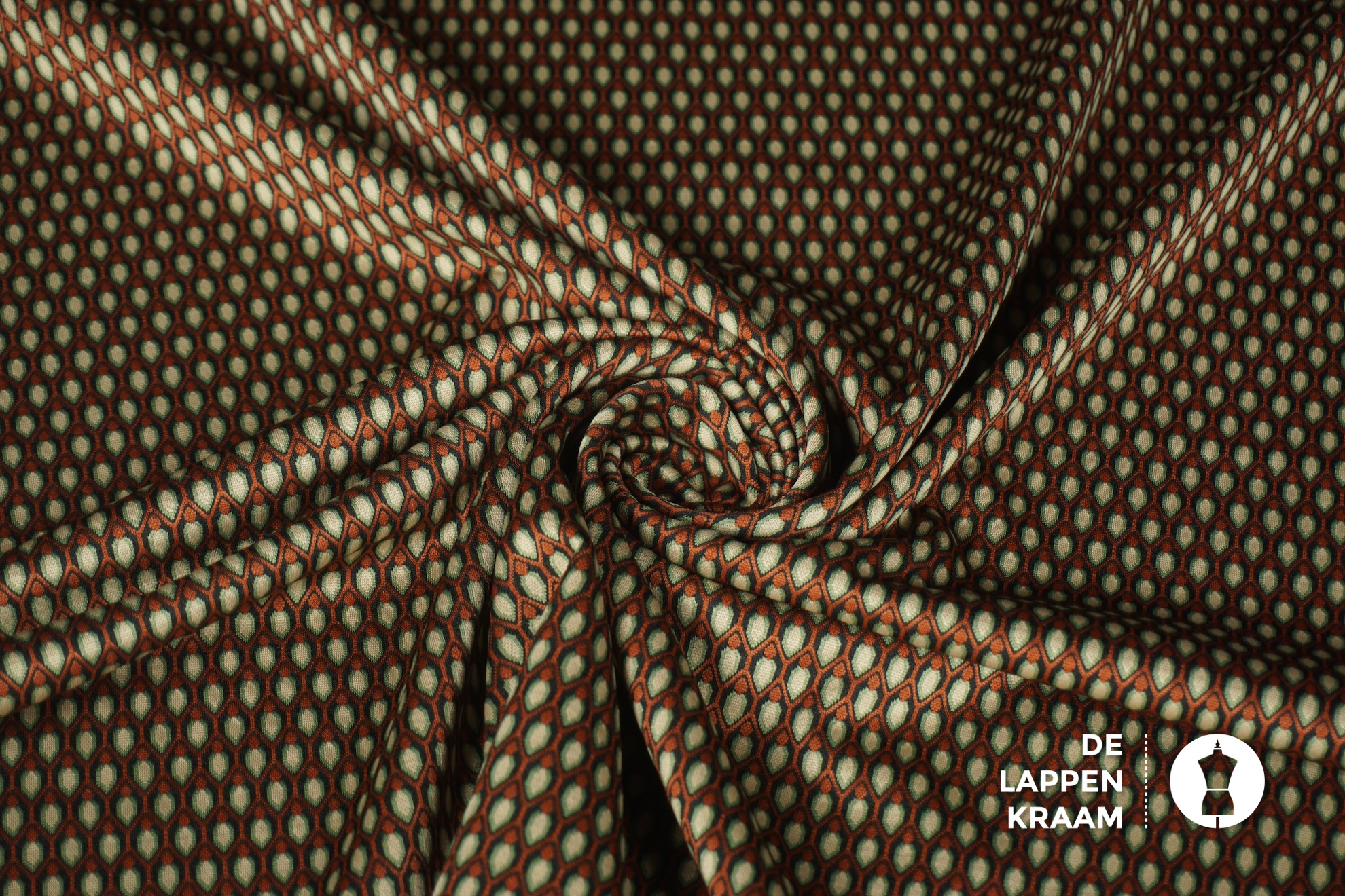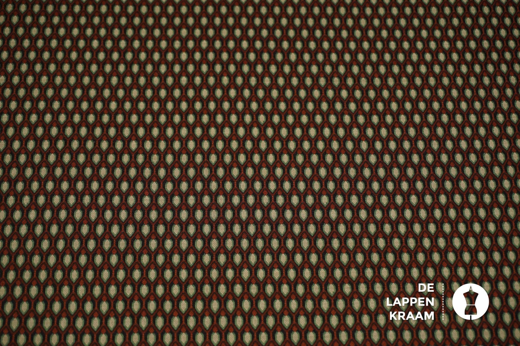 Deze "vintage" gebreide stof heeft een dessin van een soort druppels in groen met ecru, omringd door ruitjes in cognac kleur.... Lees meer
