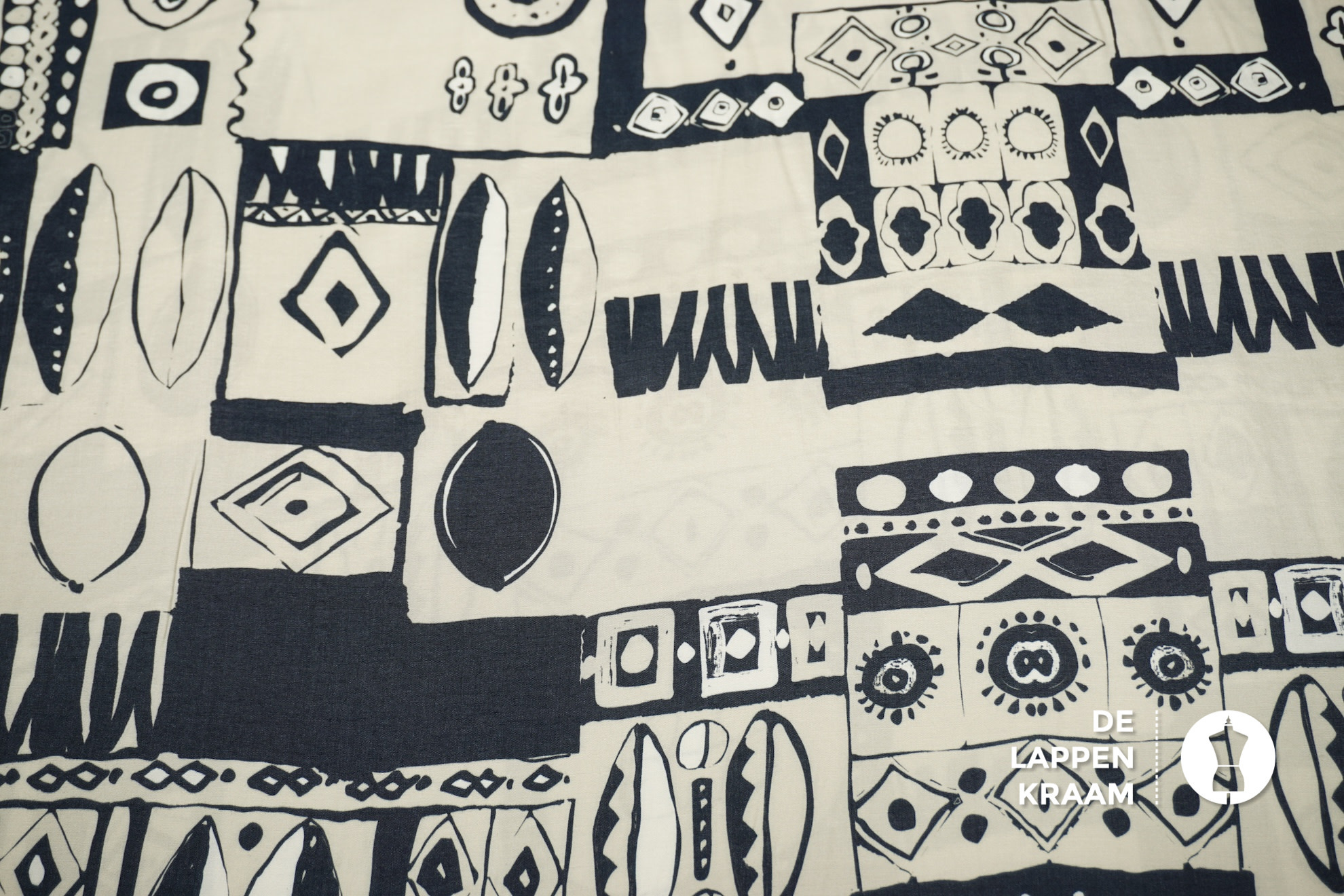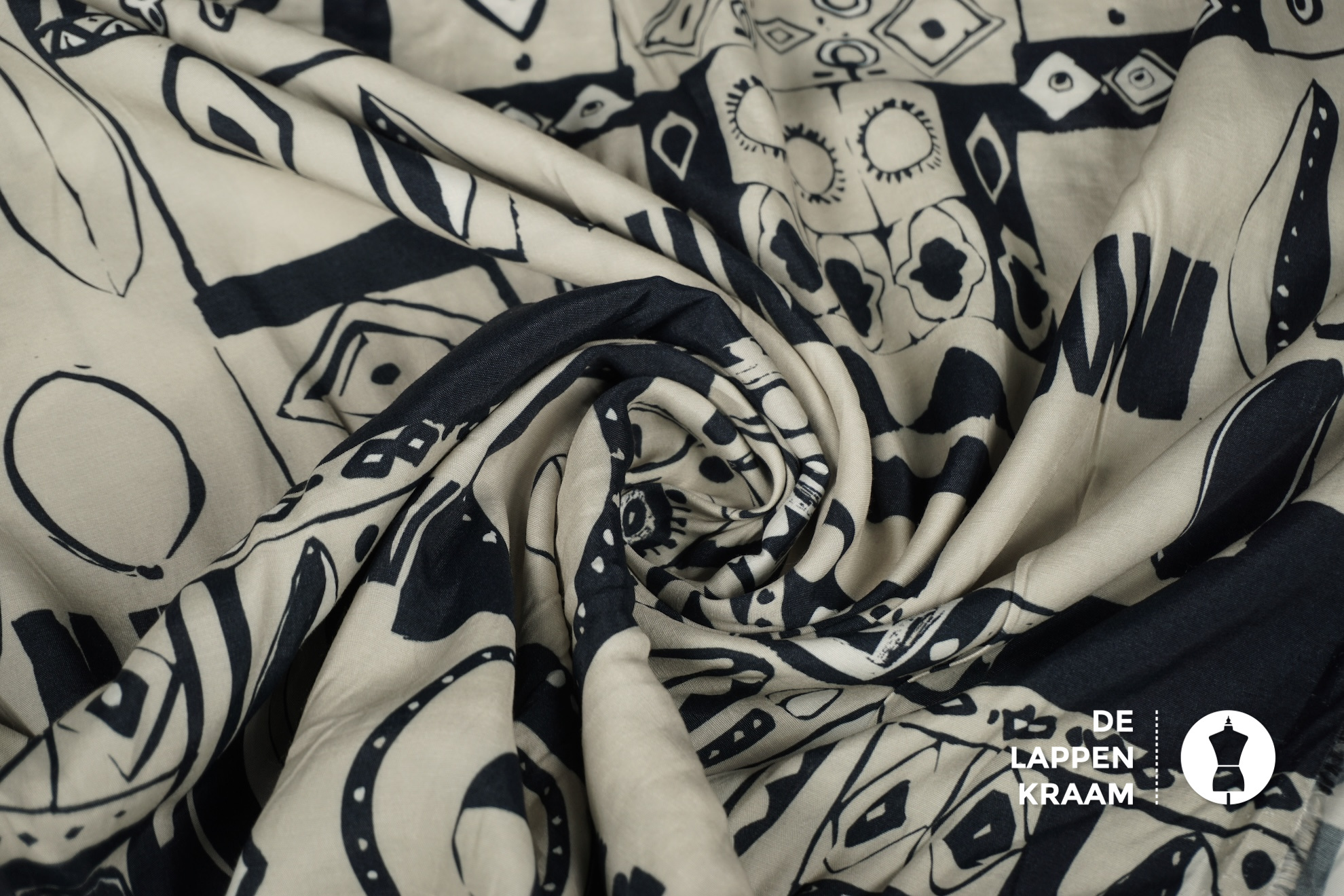 Viscose in een lichte beige kleur, met een dessin van allerlei abstracte tekeningetjes in donkerblauw. Lees meer