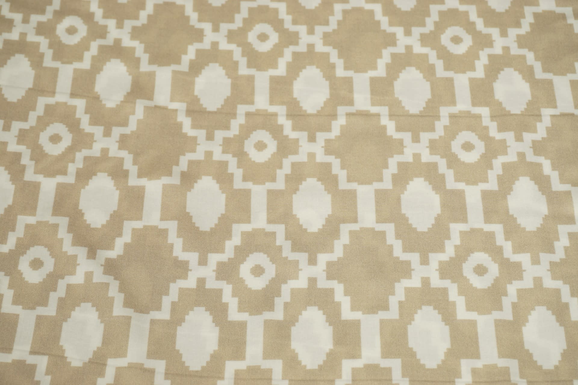 Soepele geweven viscose stof in een soort zandkleur met een witte hoekige medaillon print met cirkels. Lees meer