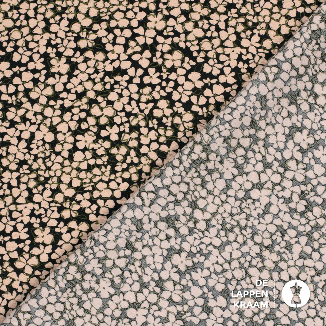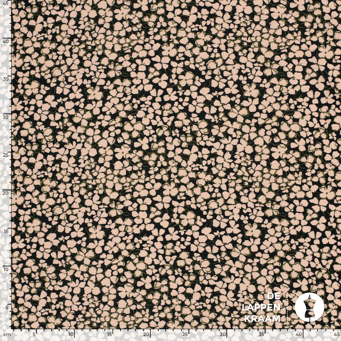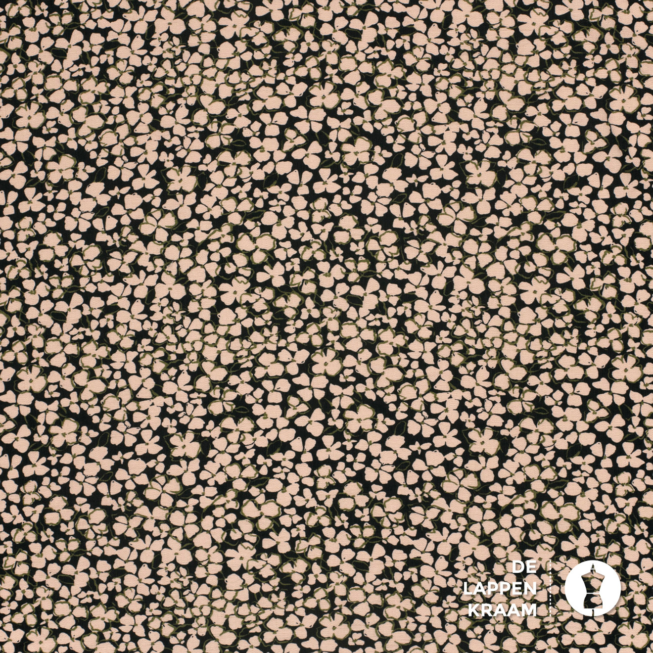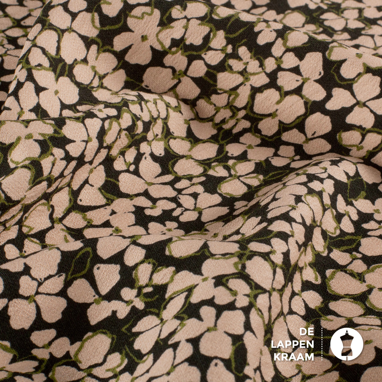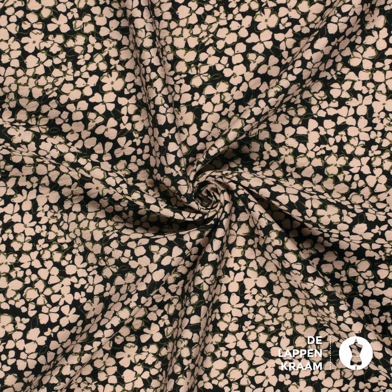 Een echte "mille fleur" met beige bloemetjes op een zwarte ondergrond. Hier en daar is nog een streepje legergroen te bespeuren. De geweven stof heeft een klein korreltje en heeft daarom de naam crepe gekregen. Leuk voor een jurk, blouse, rok of broek.... Lees meer