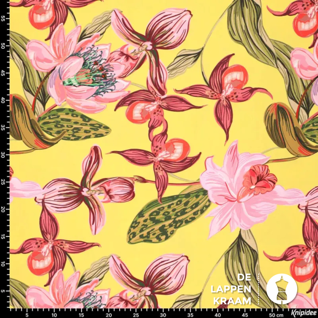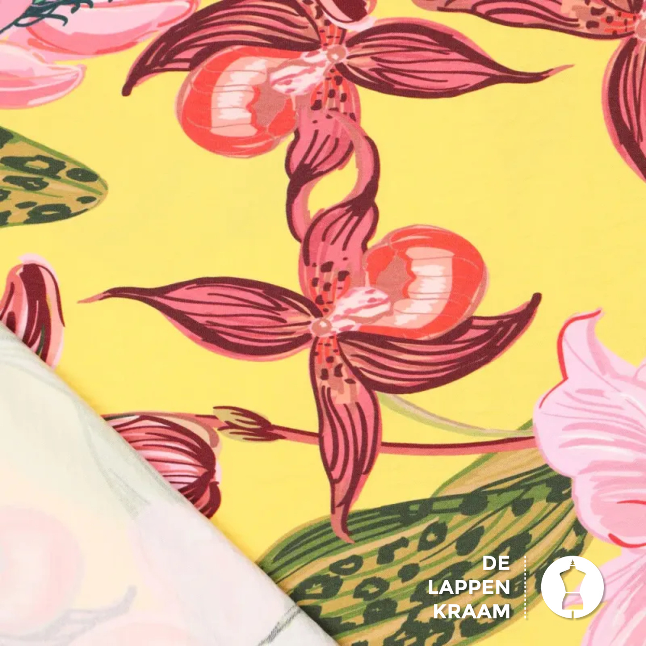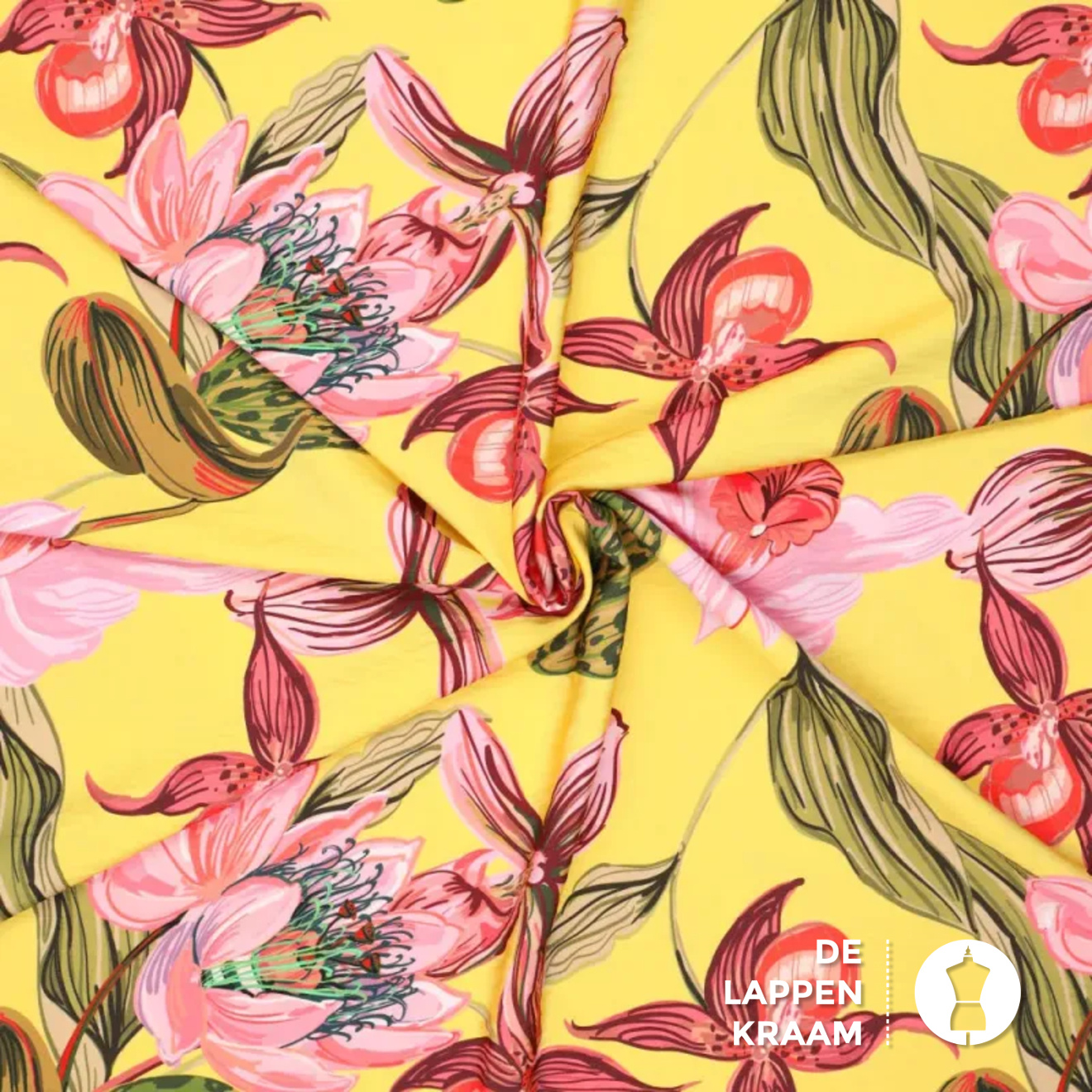 Viscose met een klein beetje polyamide in het felgeel met een prachtige print van bloemen in rozetinten met groen. Het lijkt een beetje alsof deze bloemen op de stof geschilderd zijn.... Lees meer
