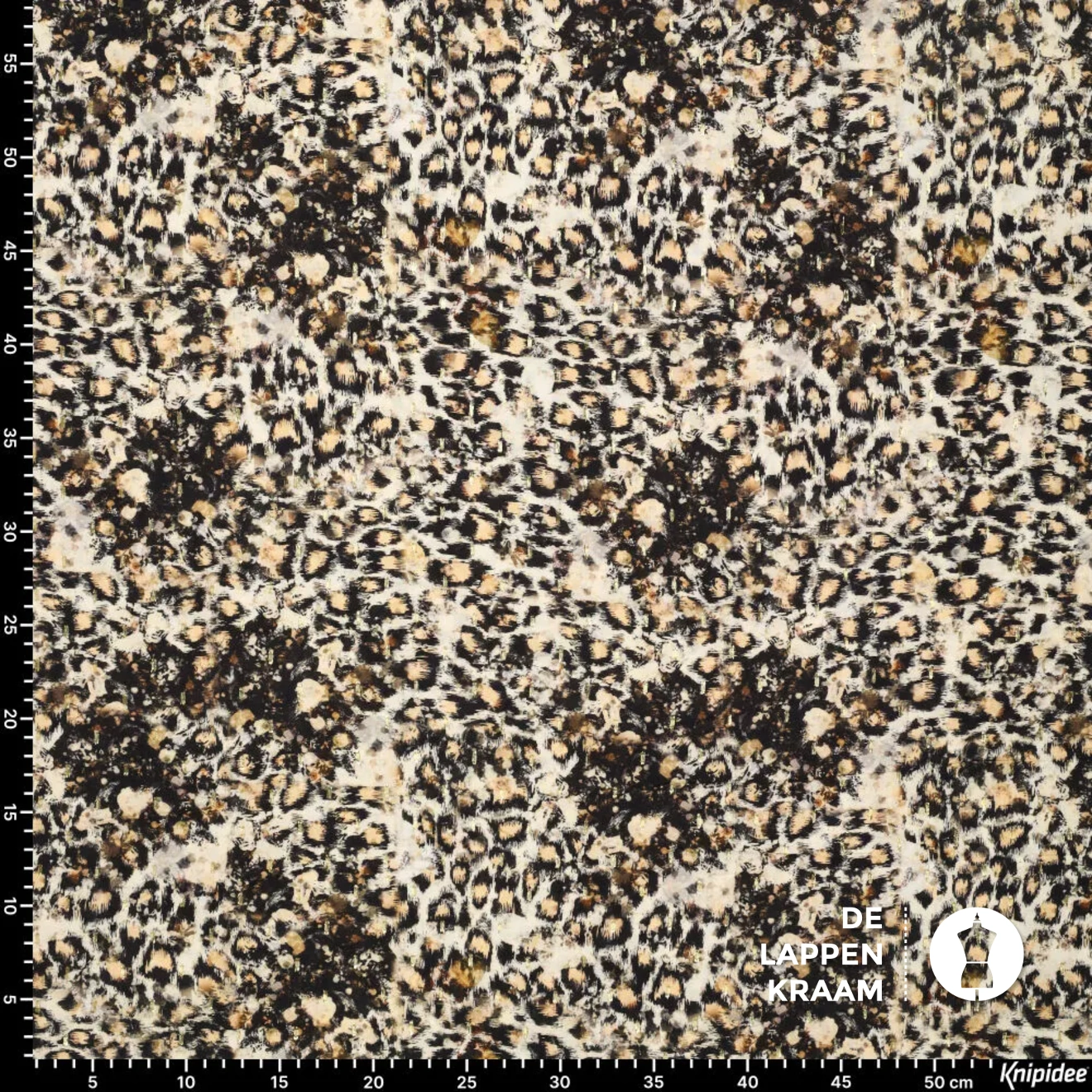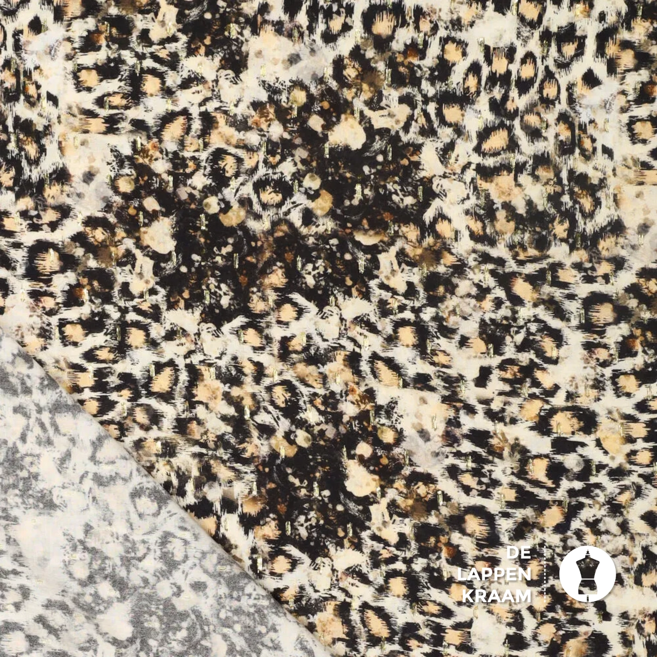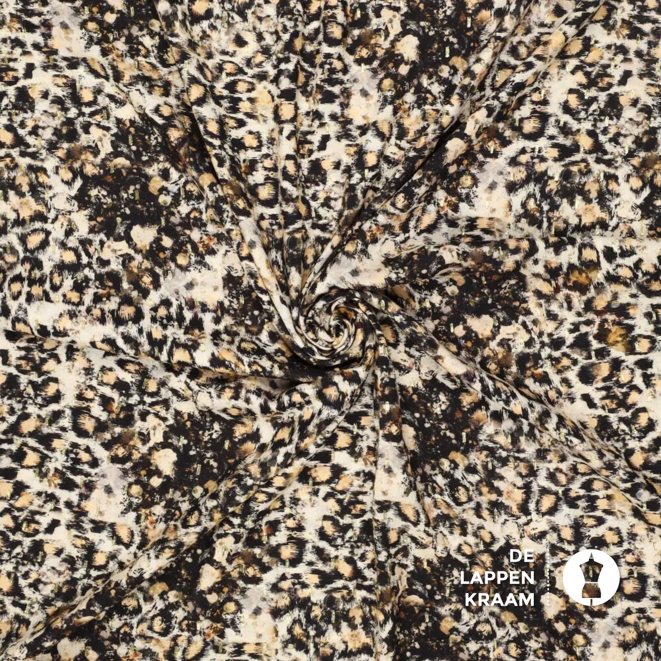 Viscose stof in ecru met een abstracte dierenprint in zwart met goud. In de stof zitten ook korte lurex streepjes geweven.... Lees meer