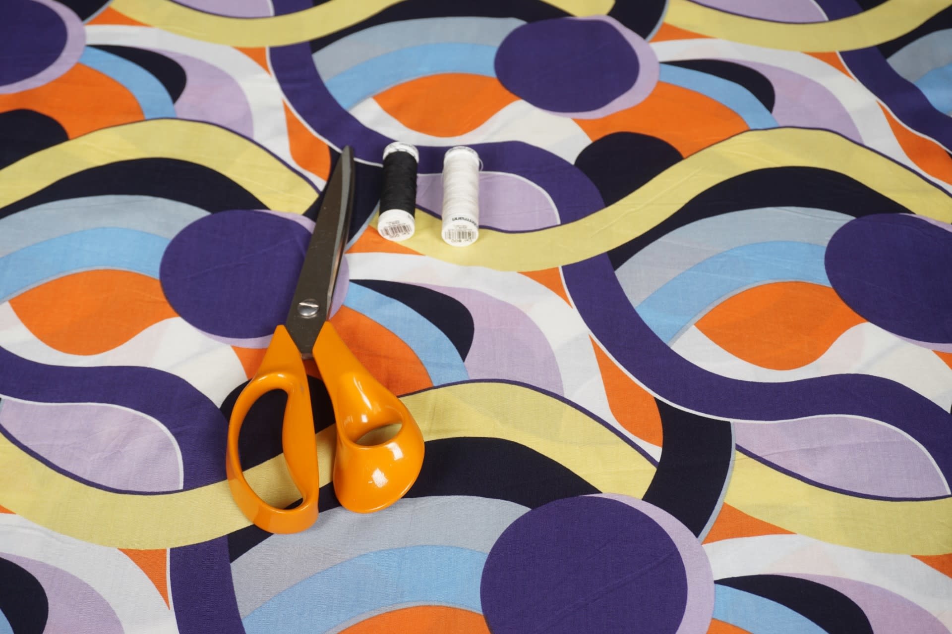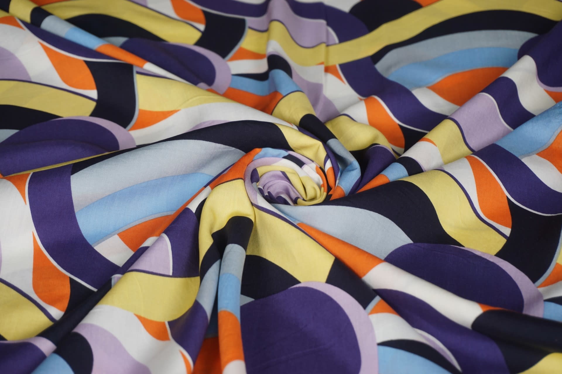 Deze prachtig soepel vallende viscose stof heeft een dessin van verschillende kleuren golven over de breedte van de stof. De golven zijn in kleuren als lichtgeel, lichtblauw, lila, paars en oranje. Op de stof staan grote bruine cirkels.... Lees meer