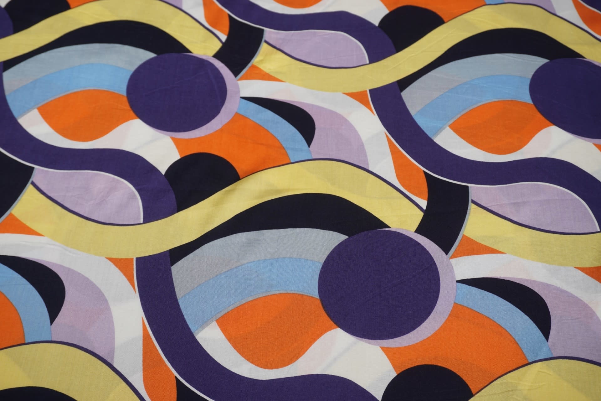SALE Viscose stof met paarse golven en cirkels