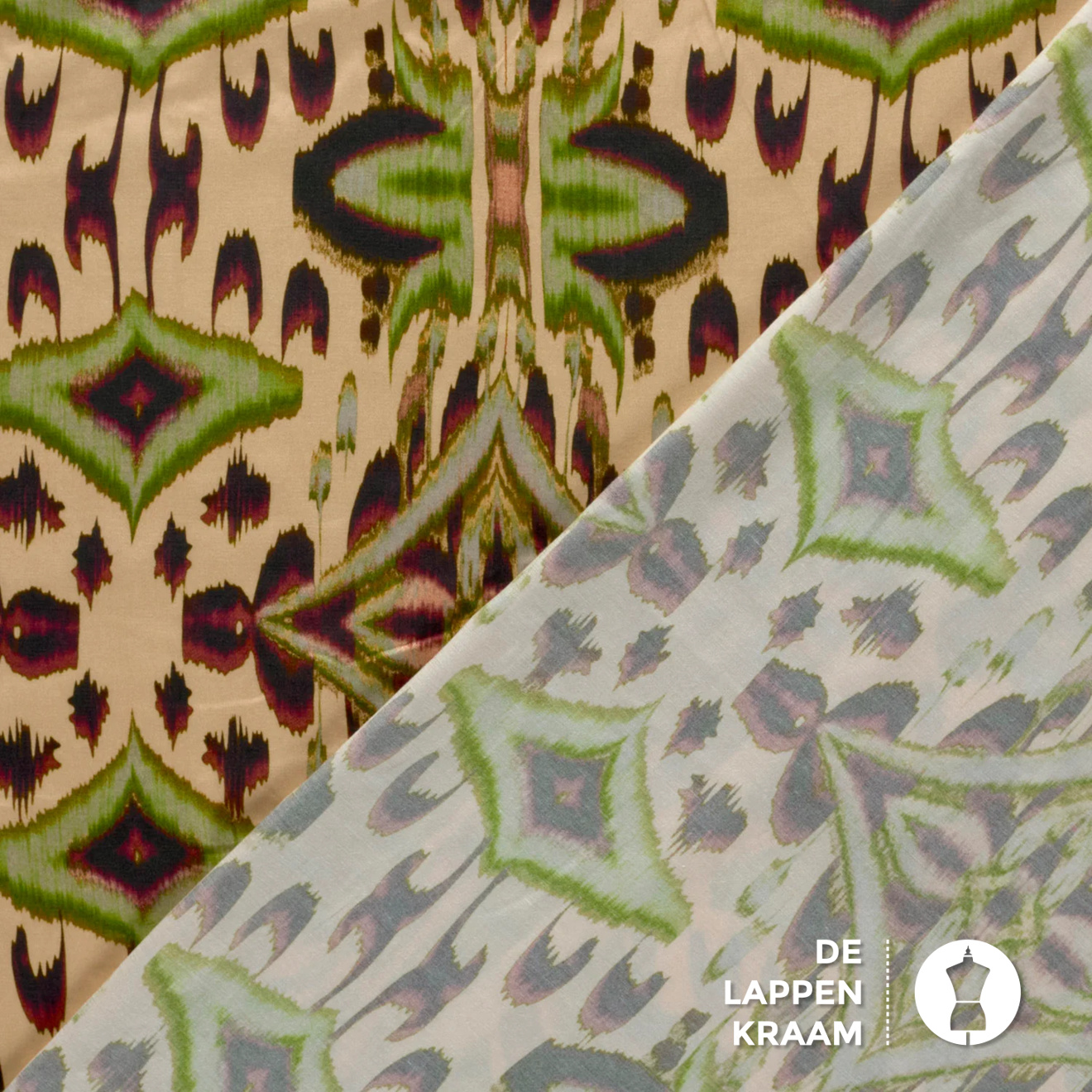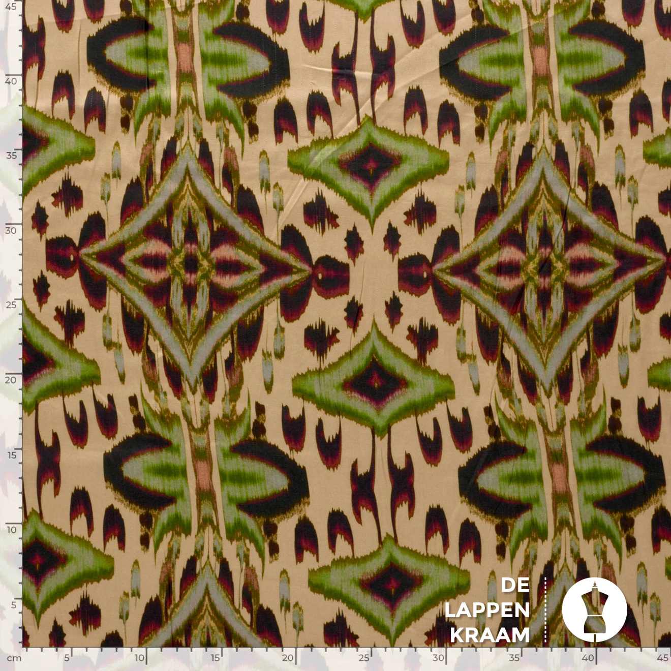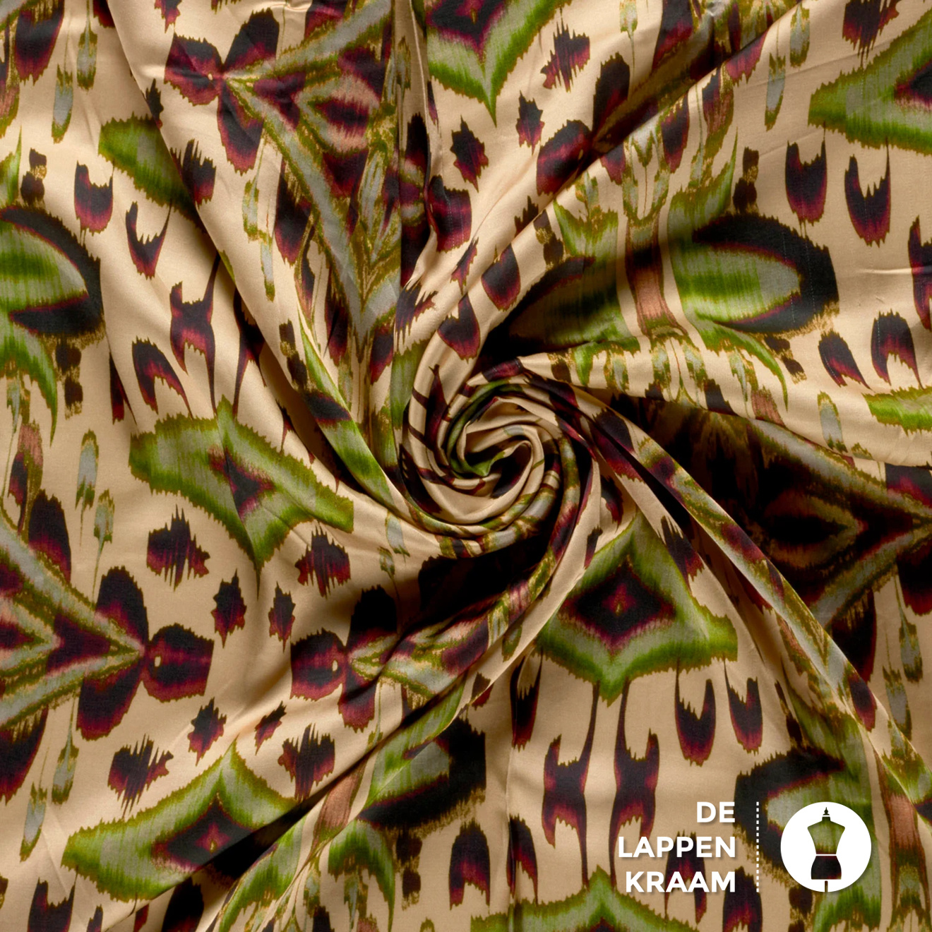 Satijn met een mooie glans in een geel/beige ondergrond en dessin in tinten als groen, steenrood en donkerbruin. Mooie voor een blouse, jurk , short of lange broek.... Lees meer