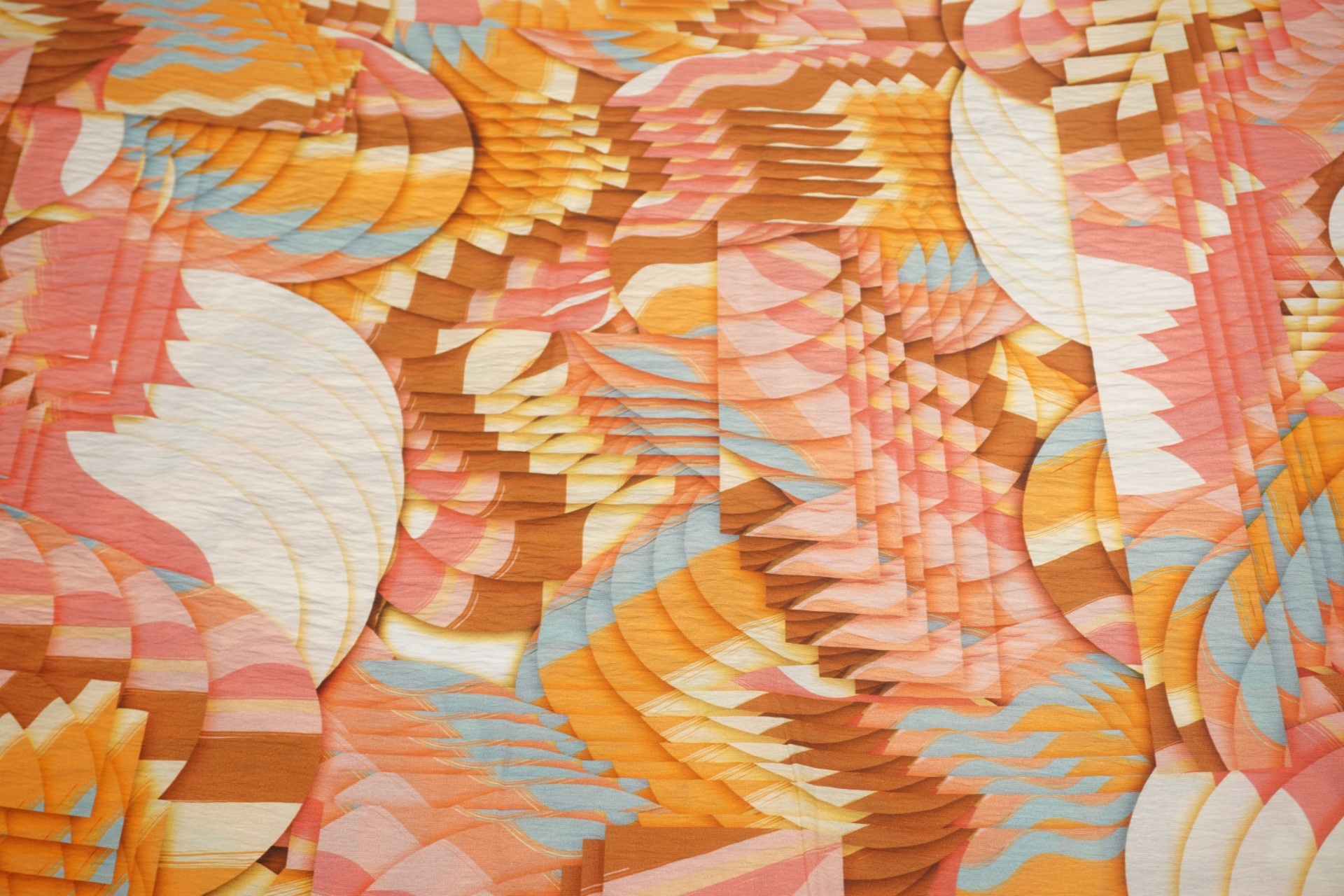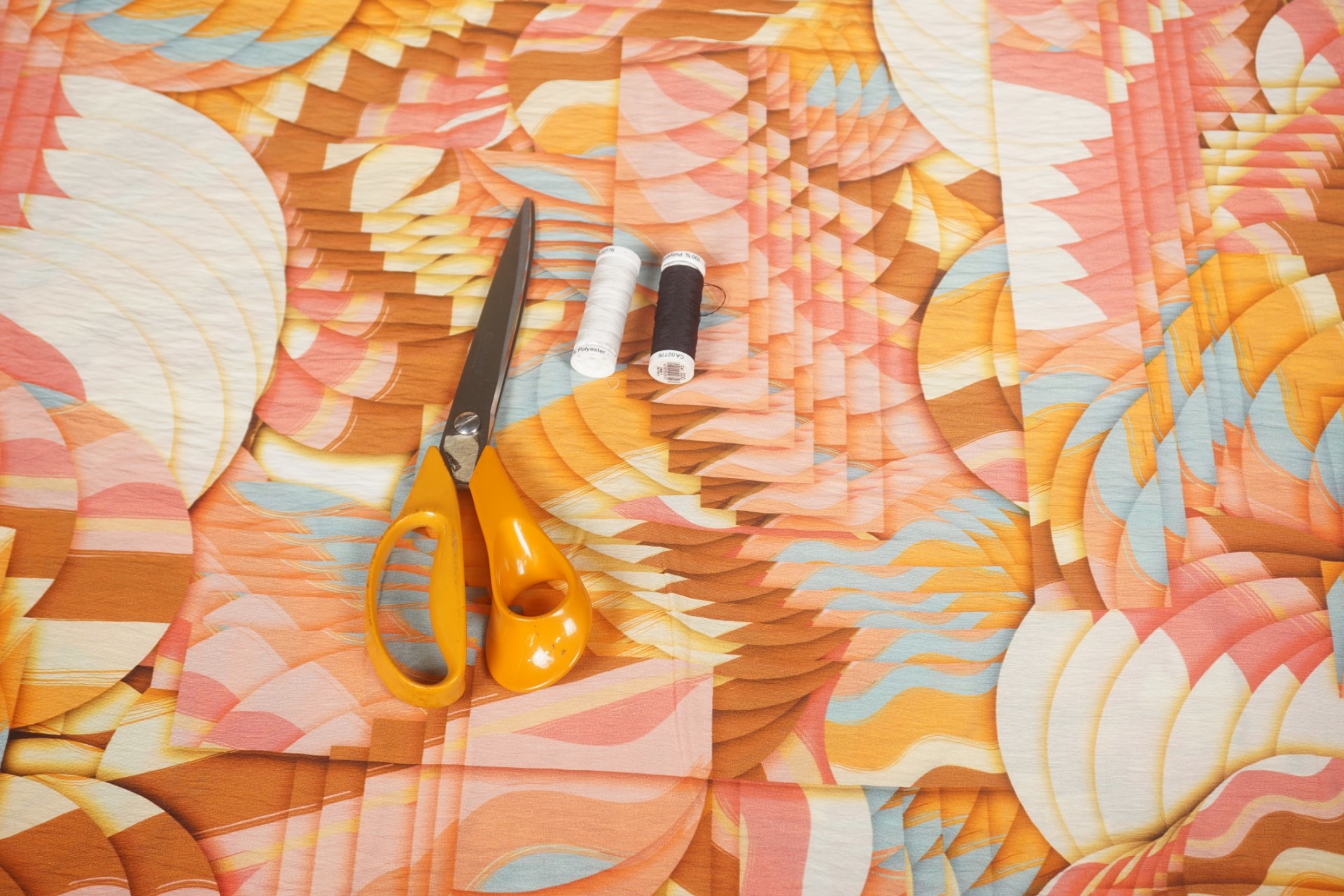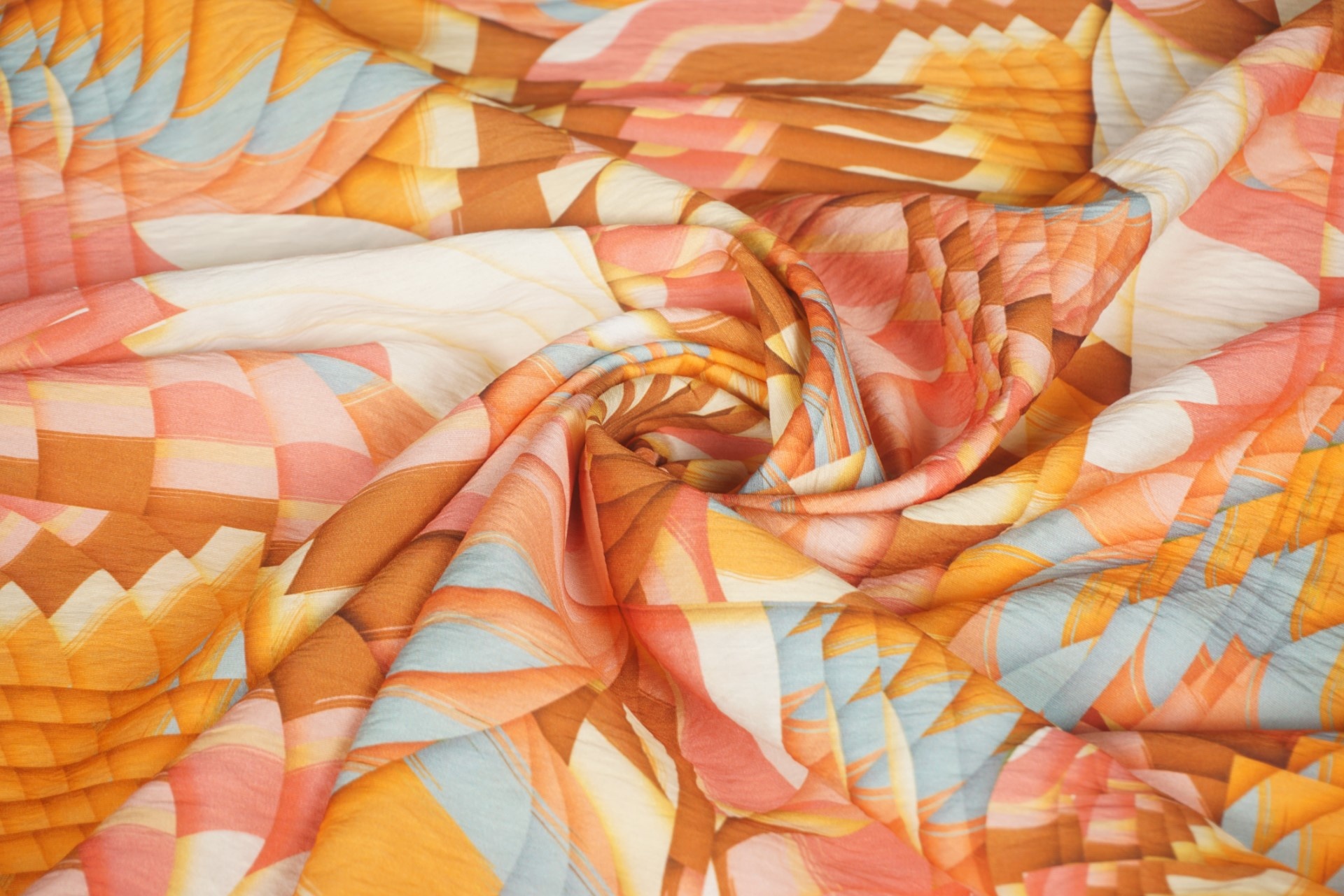 Viscose met een print waarvan lijkt of er telkens laagjes zijn geprint met dezelfde, abstracte afbeelding. De kleuren zijn lekker fel in oranje en blauw.... Lees meer