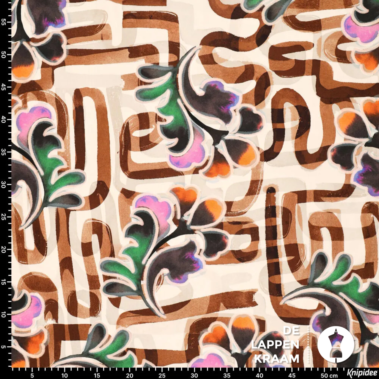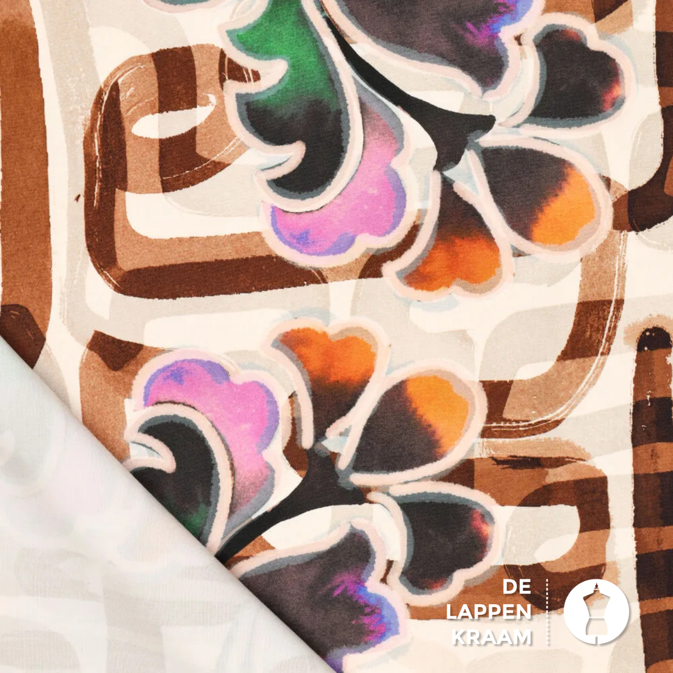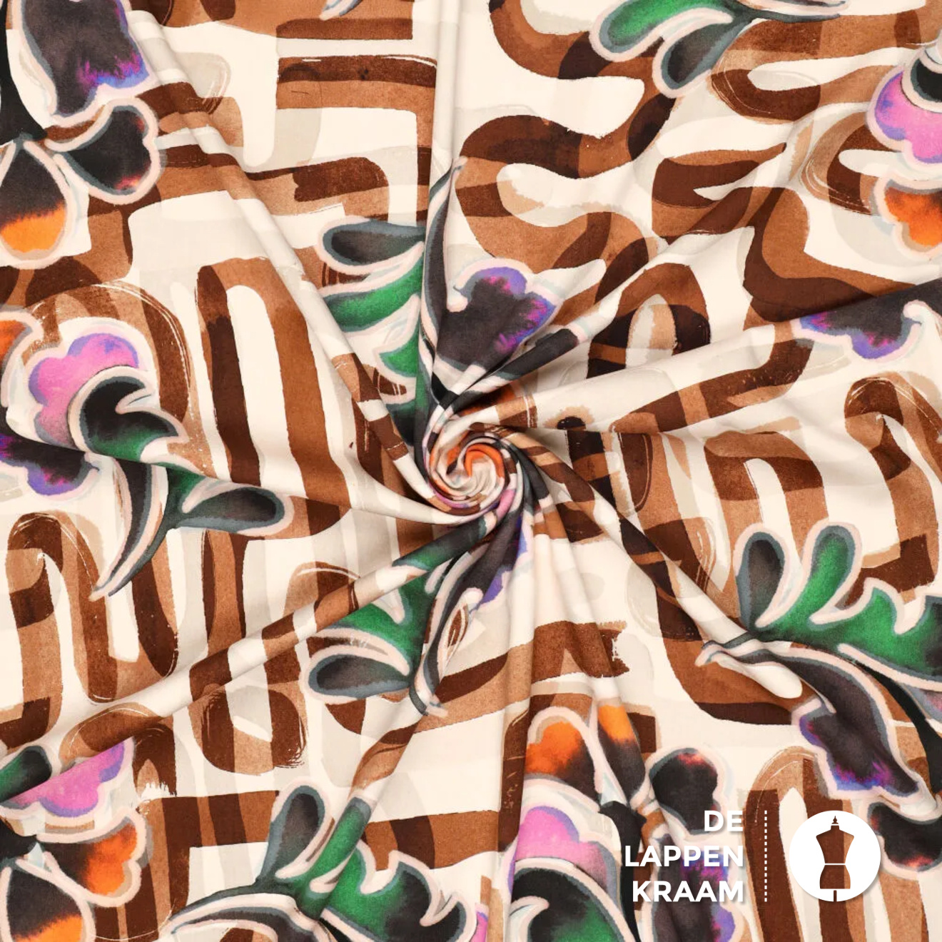 Viscose met een lichte stretch in de breedte. De ondergrond is beige en heeft een abstracte print van een soort doolhof in bruin met bloemen in kleuren als groen, oranje en roze.... Lees meer