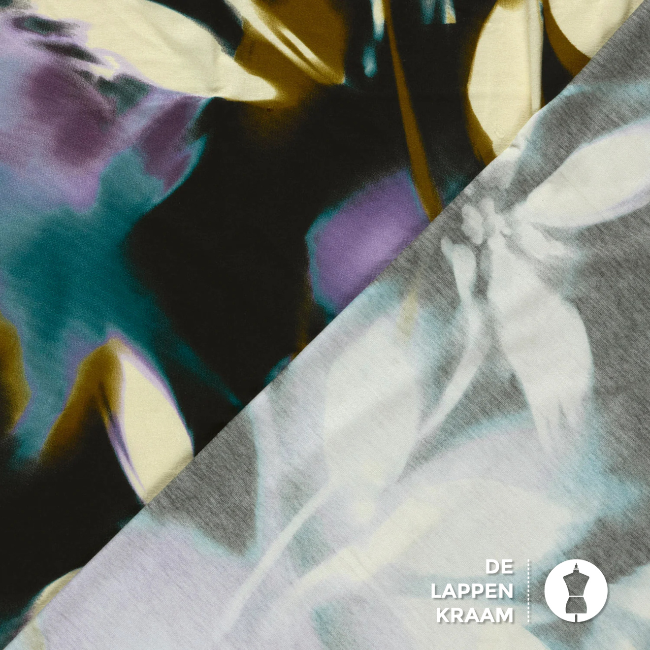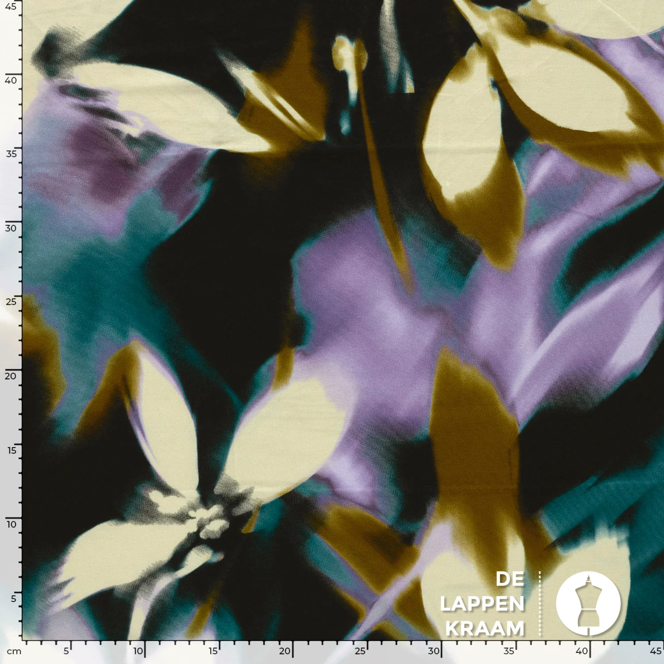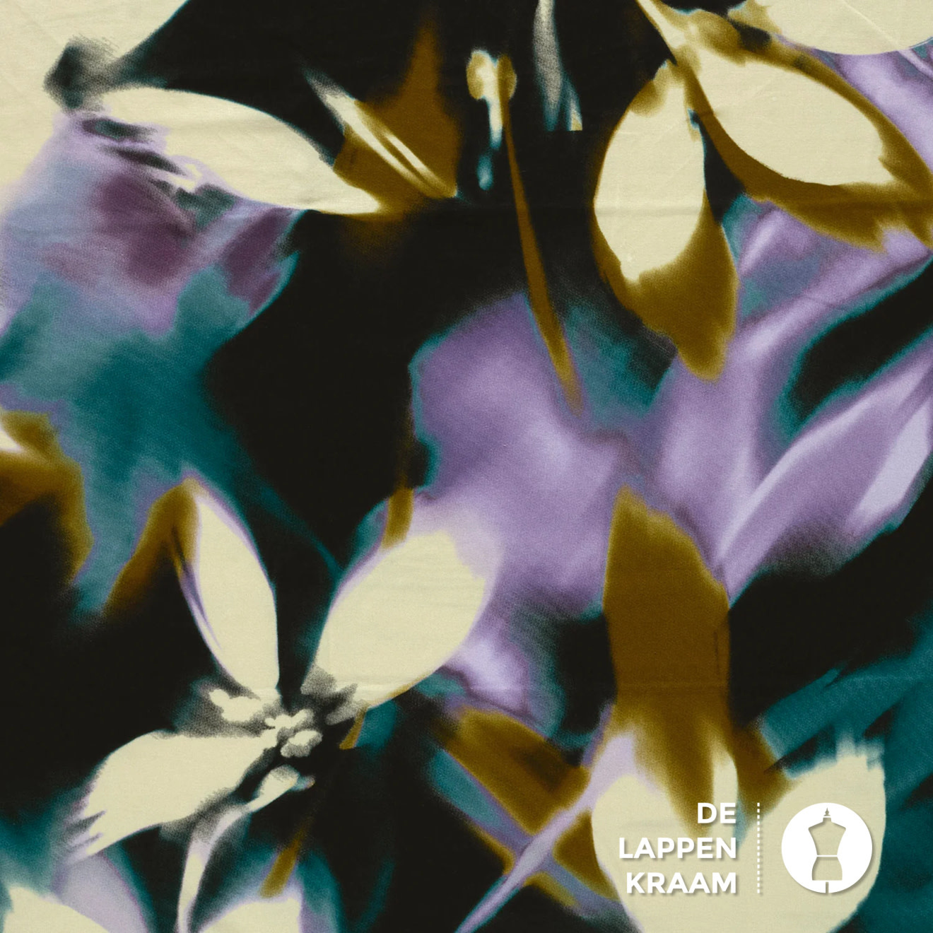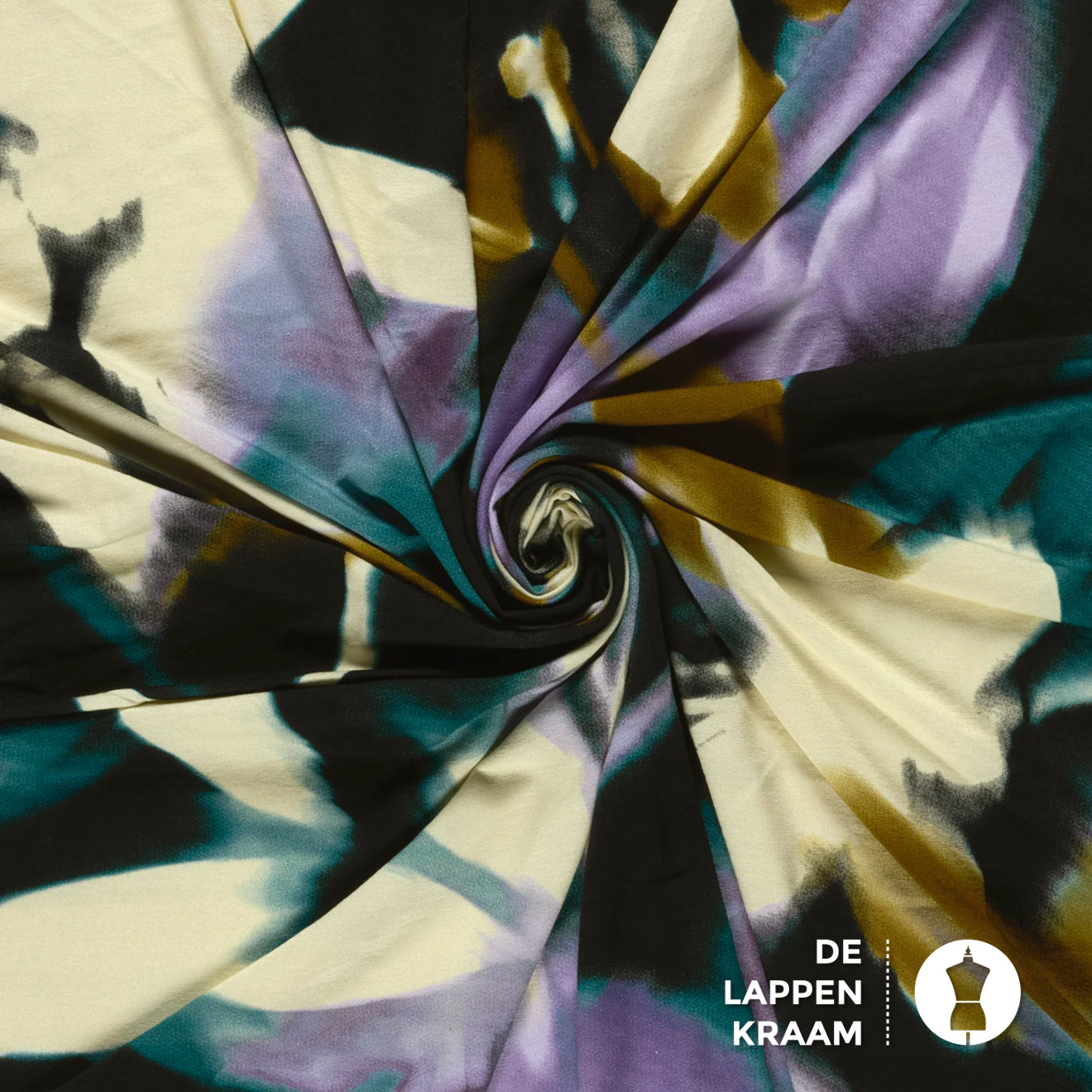Comfortabele viscose tricot met een dessin van allerlei vlekken in lila, petrol, oker en ecru. Als je goed kijkt kun je wat bloemen ontdekken in de vlekken.... Lees meer