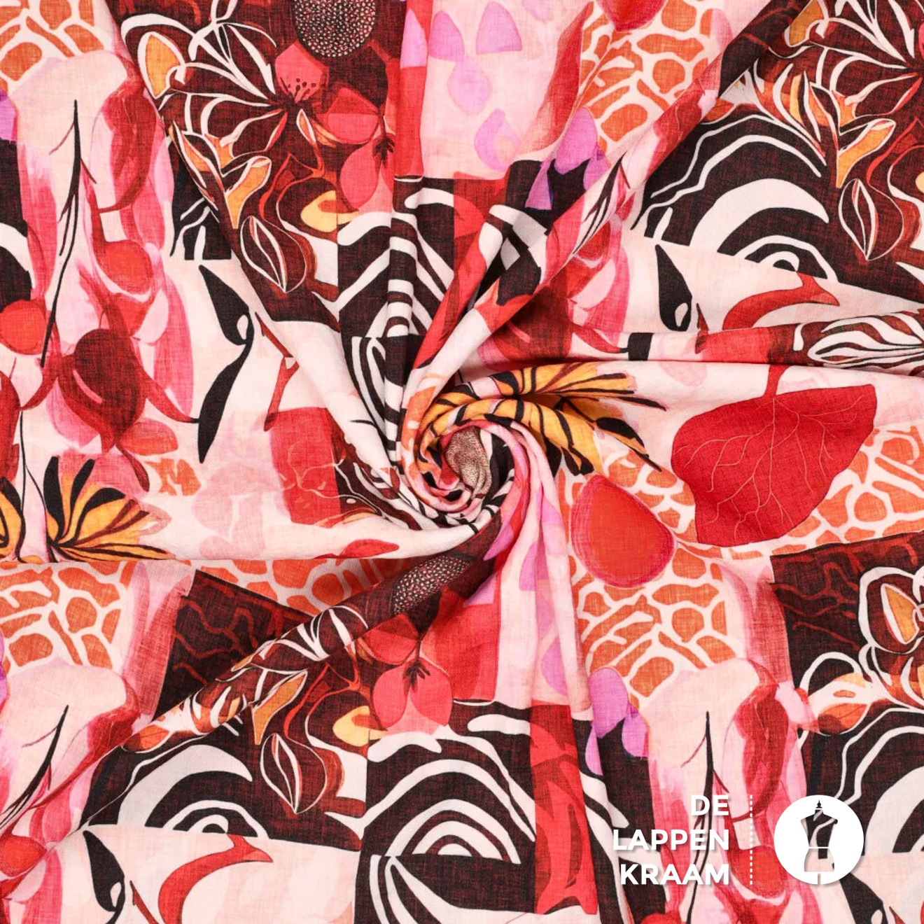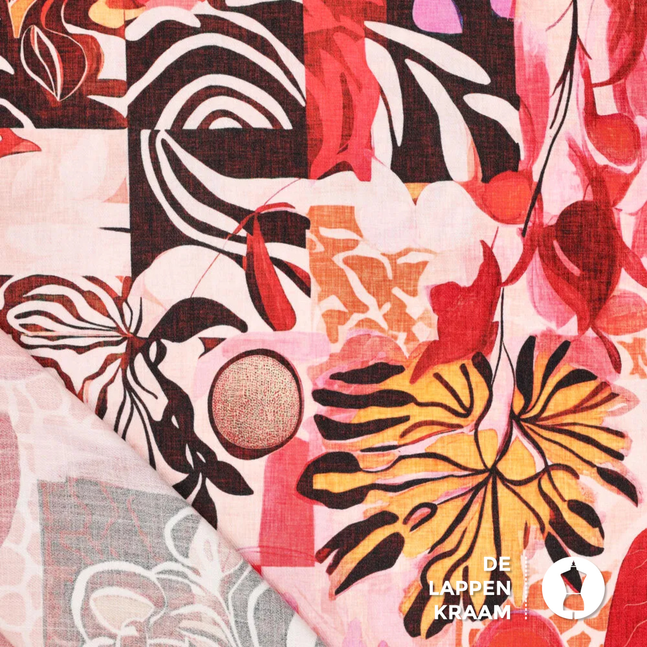 Deze mix van viscose en polyamide geeft je het beste van 2 werelden: de soepelheid en het ademend vermogen van viscose en de polyamide zorgt ervoor dat de stof niet zo kreukt. Het dessin bestaat uit allemaal abstracte elementen en bloemen in roze en oranj... Lees meer