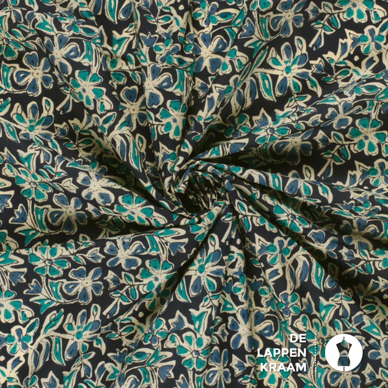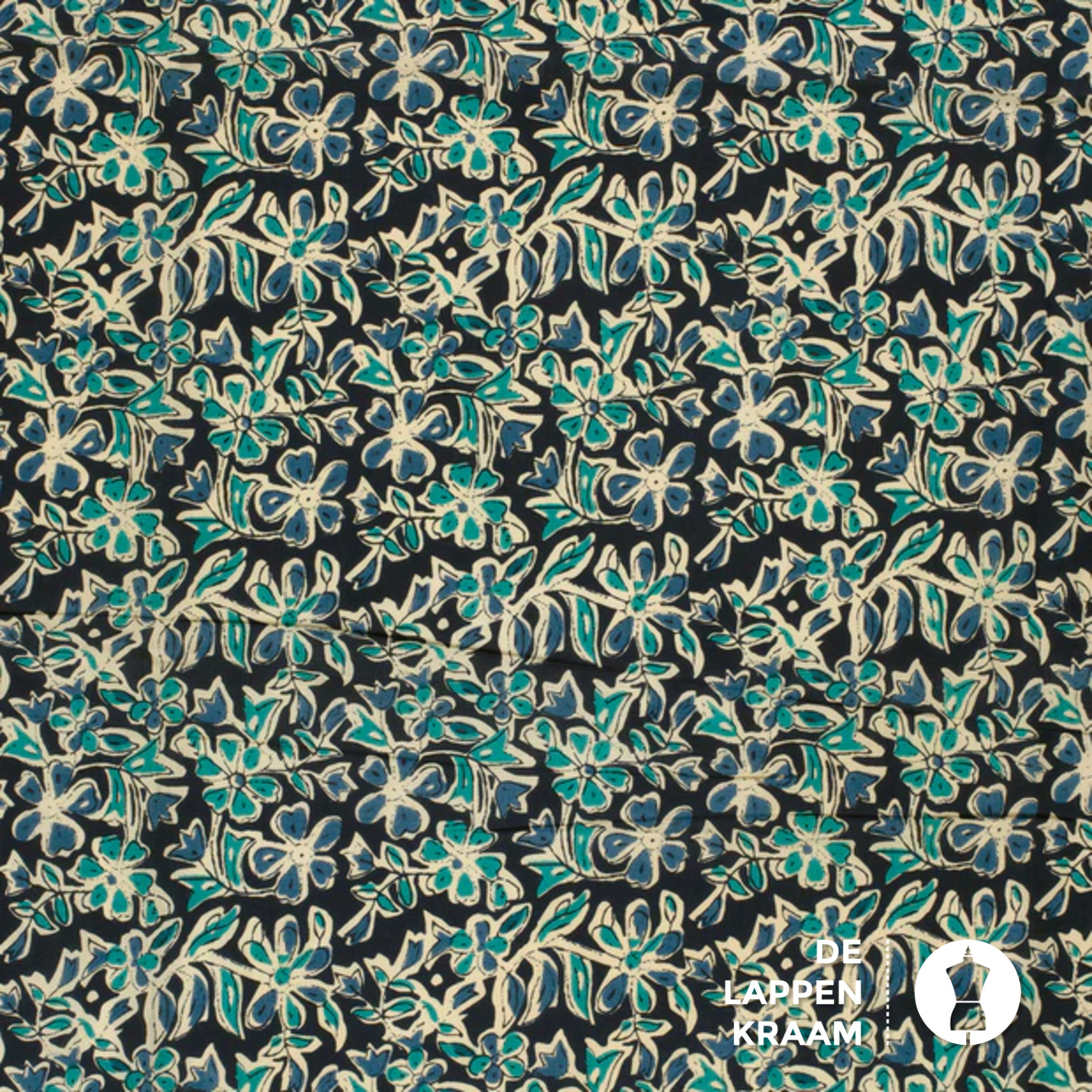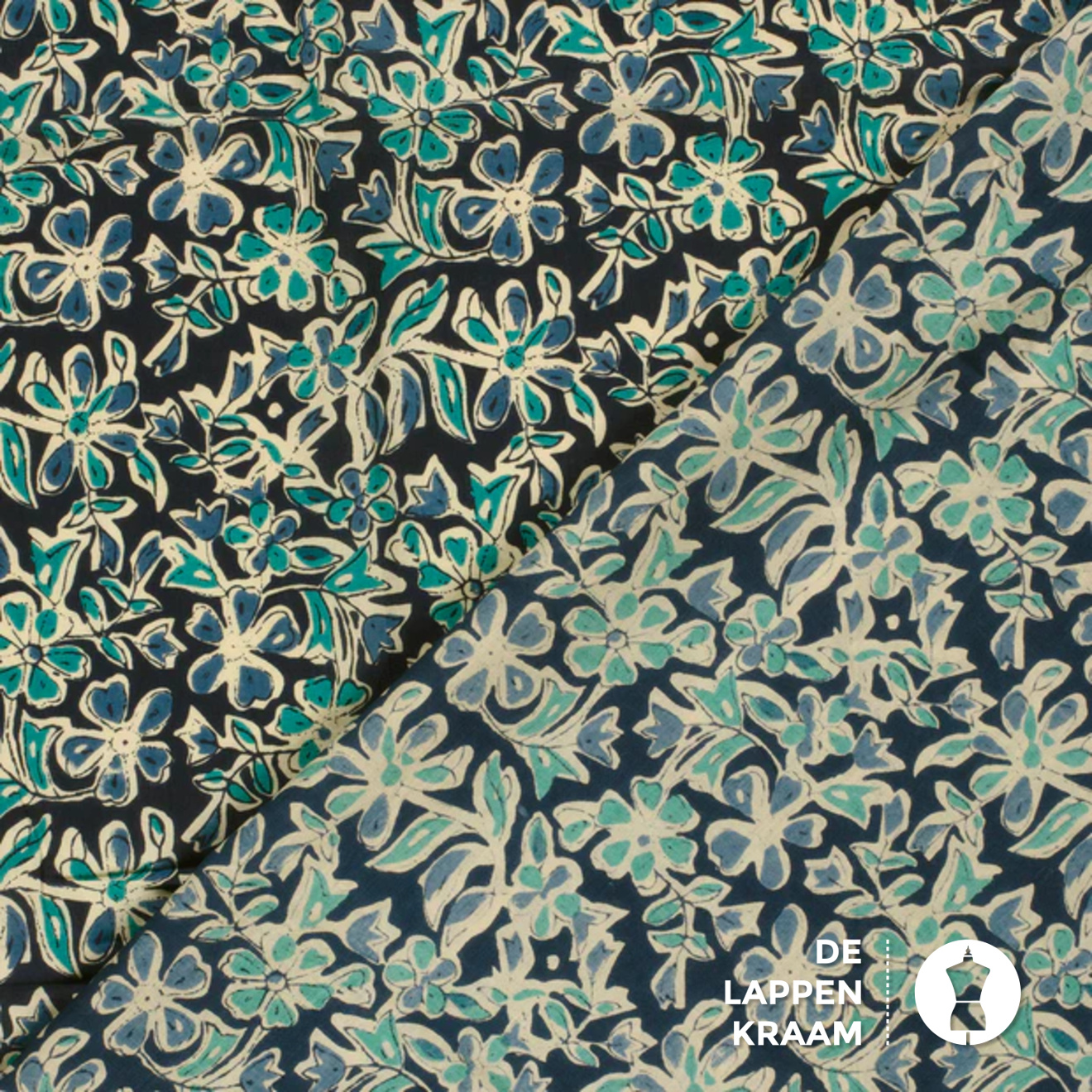 Egyptisch katoen in donkerblauw met een bloemenprint in ecru en petrol. De stof is voelt zijdezacht aan. Lees meer